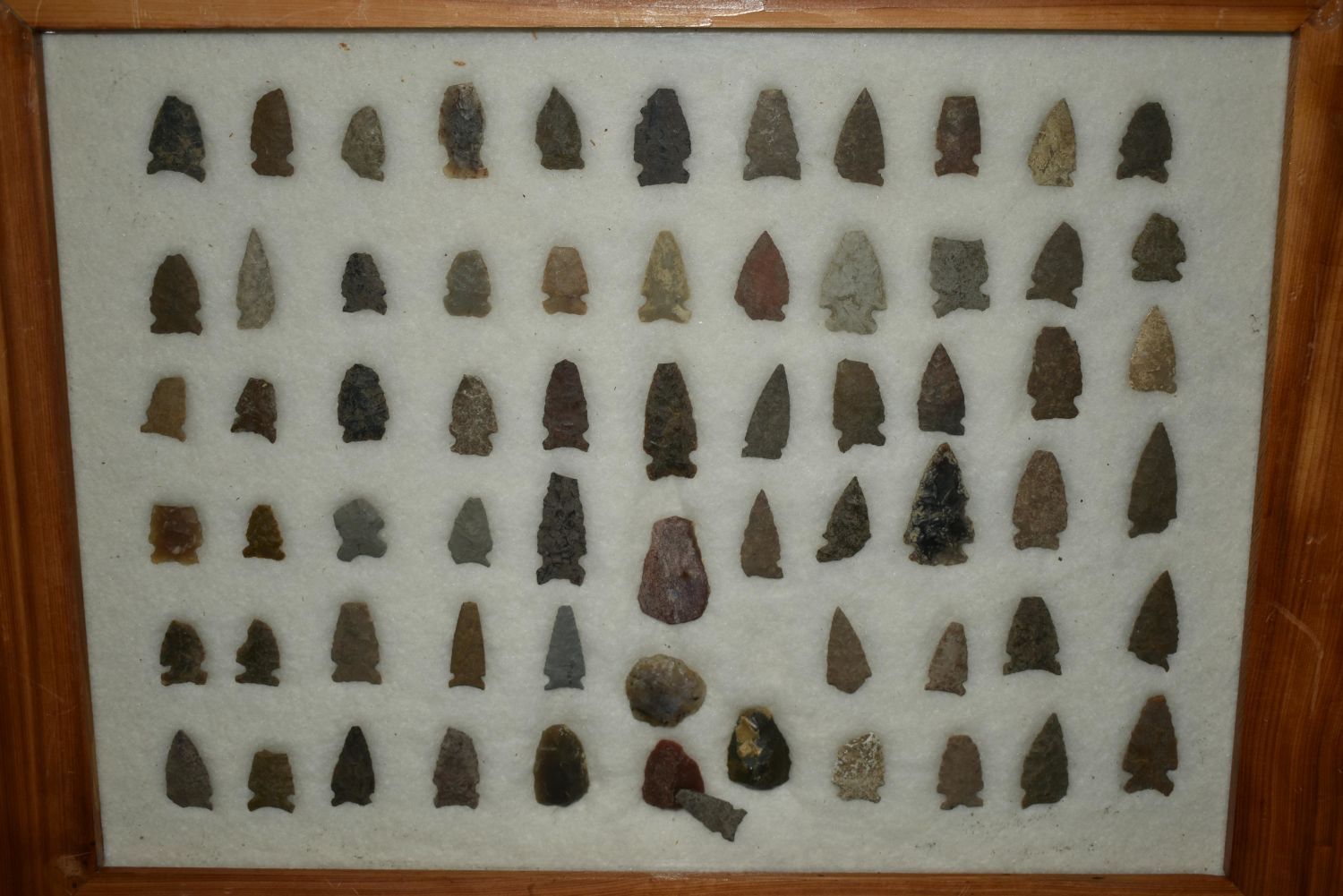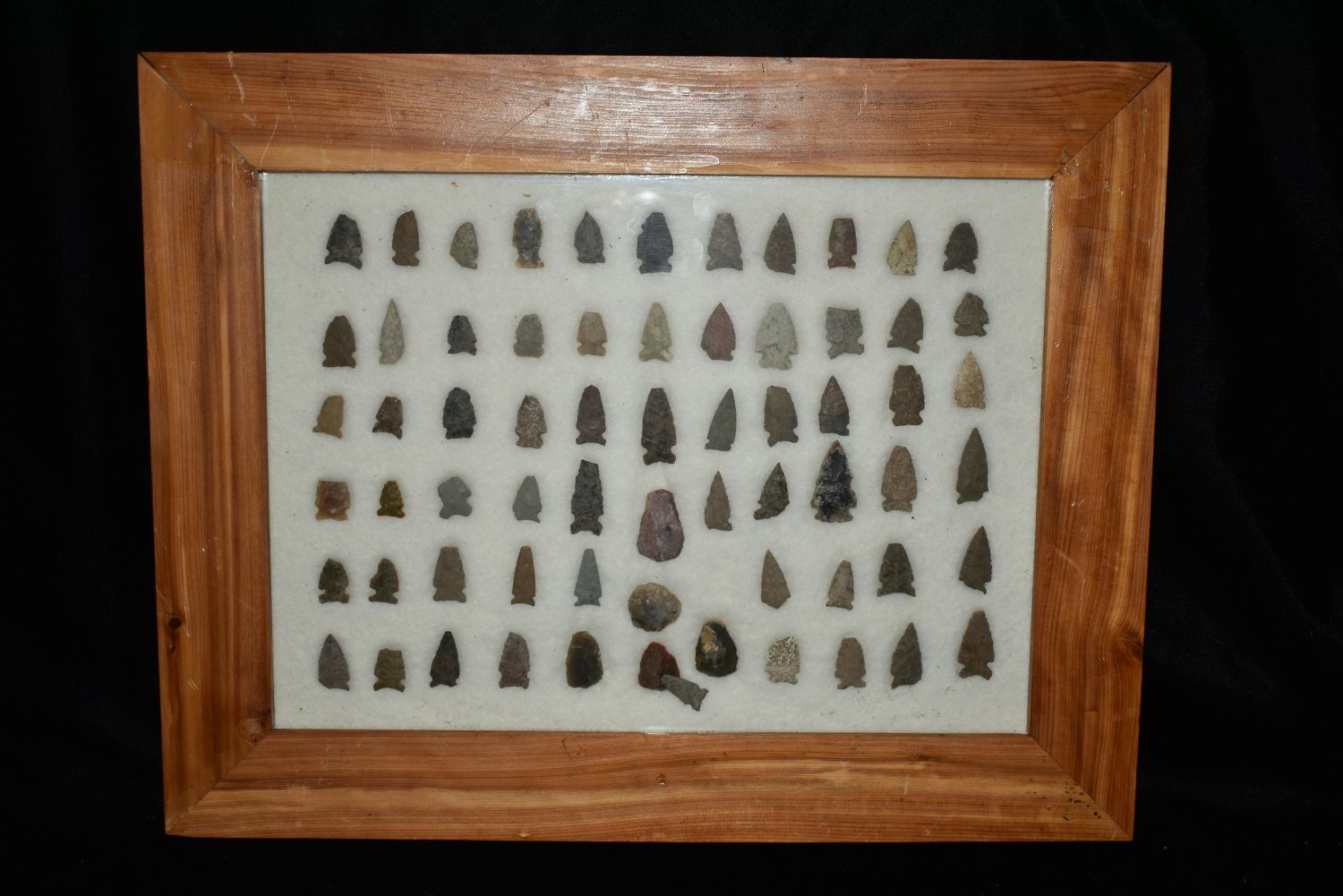 18" x 14" Frame, Contains Approx. 67 Arrowheads, Frame Made by Creel Poore, Musselshell, Montana where he found his first arrowhead at a very early age. This led Creel on a lifetime search for Montana’s prehistoric past. Creel owned a ranch in Musselshell and collected from sites and in and around the Musselshell River and tributaries. Every piece in Creel’s collection is personally found. He did not purchase pieces, nor did he accept pieces as gifts. He took pride in the fact he found every piece. He also made the cedar frames from cedar trees that were cut on his ranch. Many of the pieces were collected from the buffalo jumps which were plentiful nearby