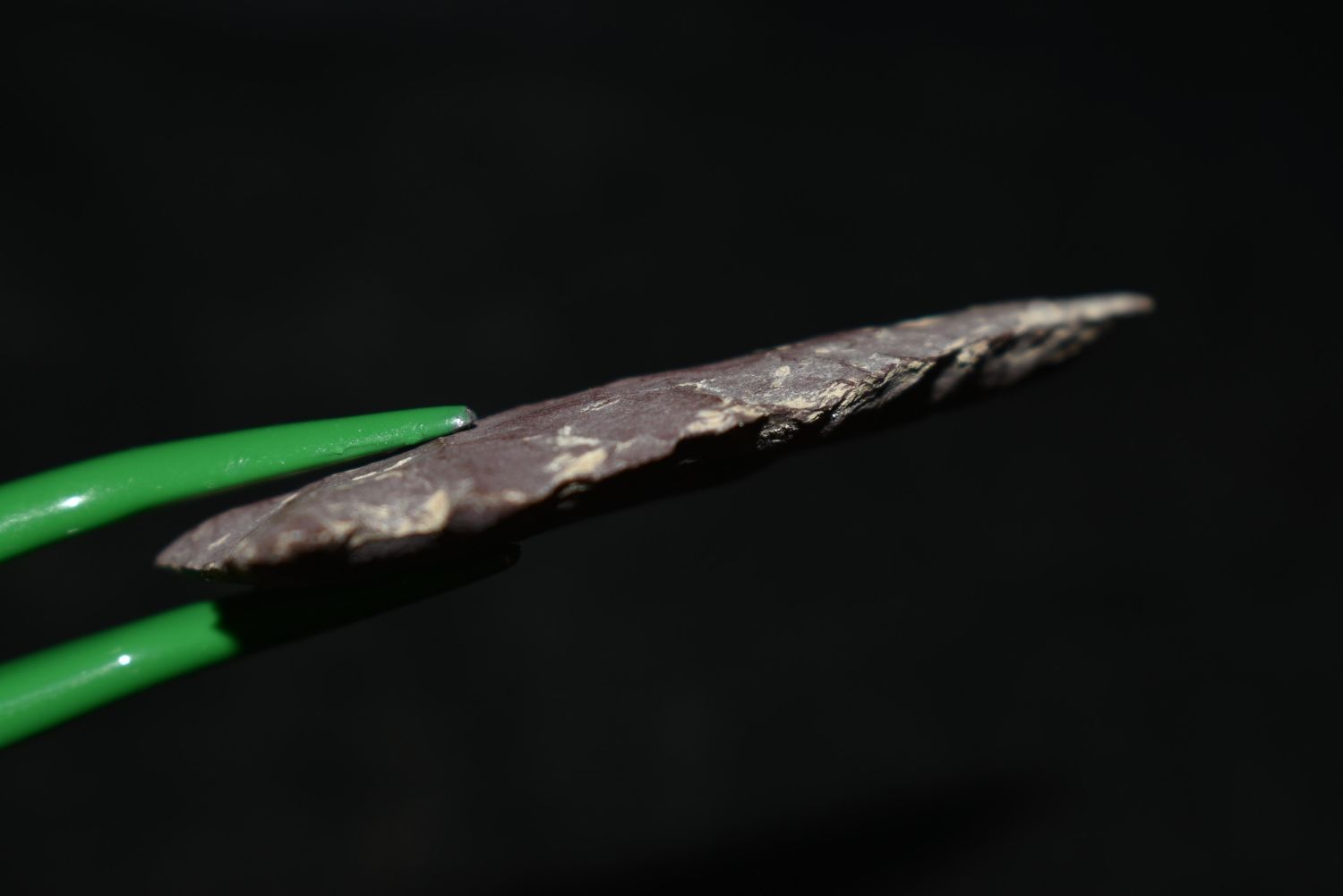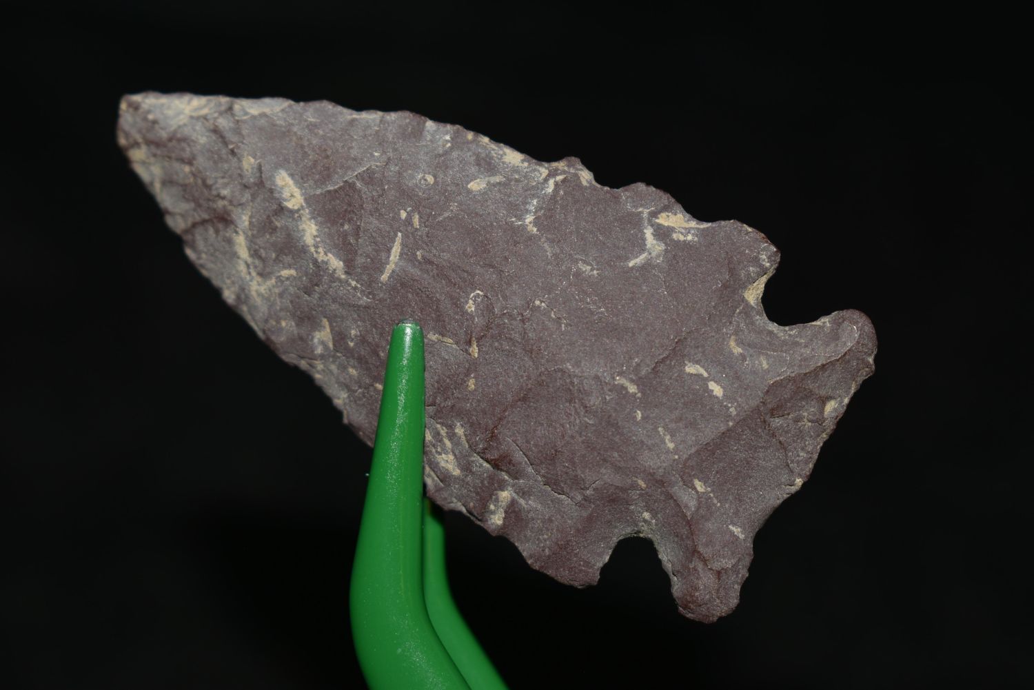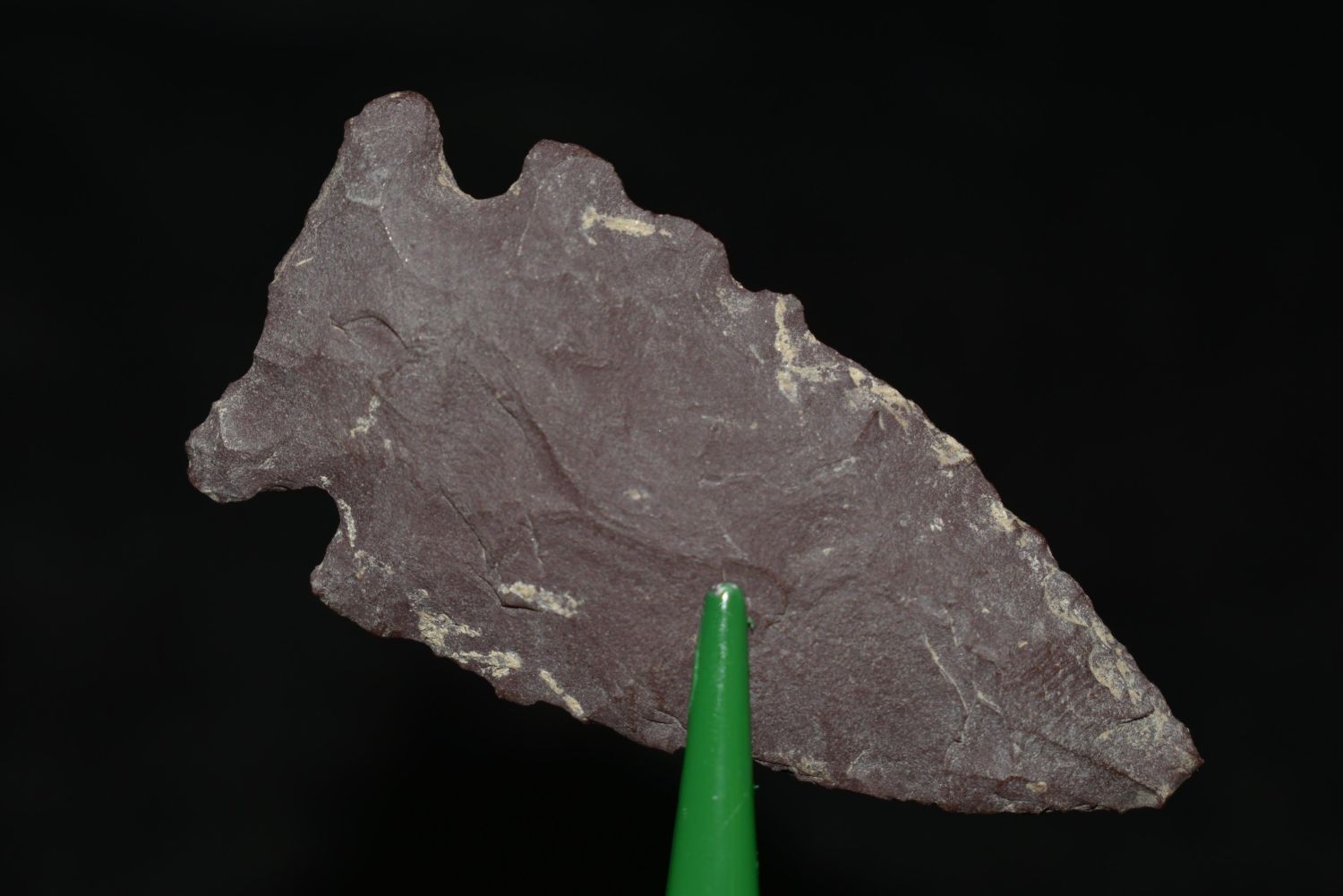 1 9/16" Glendo Arrow, Musselshell, MT, Creel Poore was born and raised in Musselshell, Montana where he found his first arrowhead at a very early age. This led Creel on a lifetime search for Montana’s prehistoric past. Creel owned a ranch in Musselshell and collected from sites and in and around the Musselshell River and tributaries. Every piece in Creel’s collection is personally found. He did not purchase pieces, nor did he accept pieces as gifts. He took pride in the fact he found every piece. He also made the cedar frames from cedar trees that were cut on his ranch. Many of the pieces were collected from the buffalo jumps which were plentiful nearby