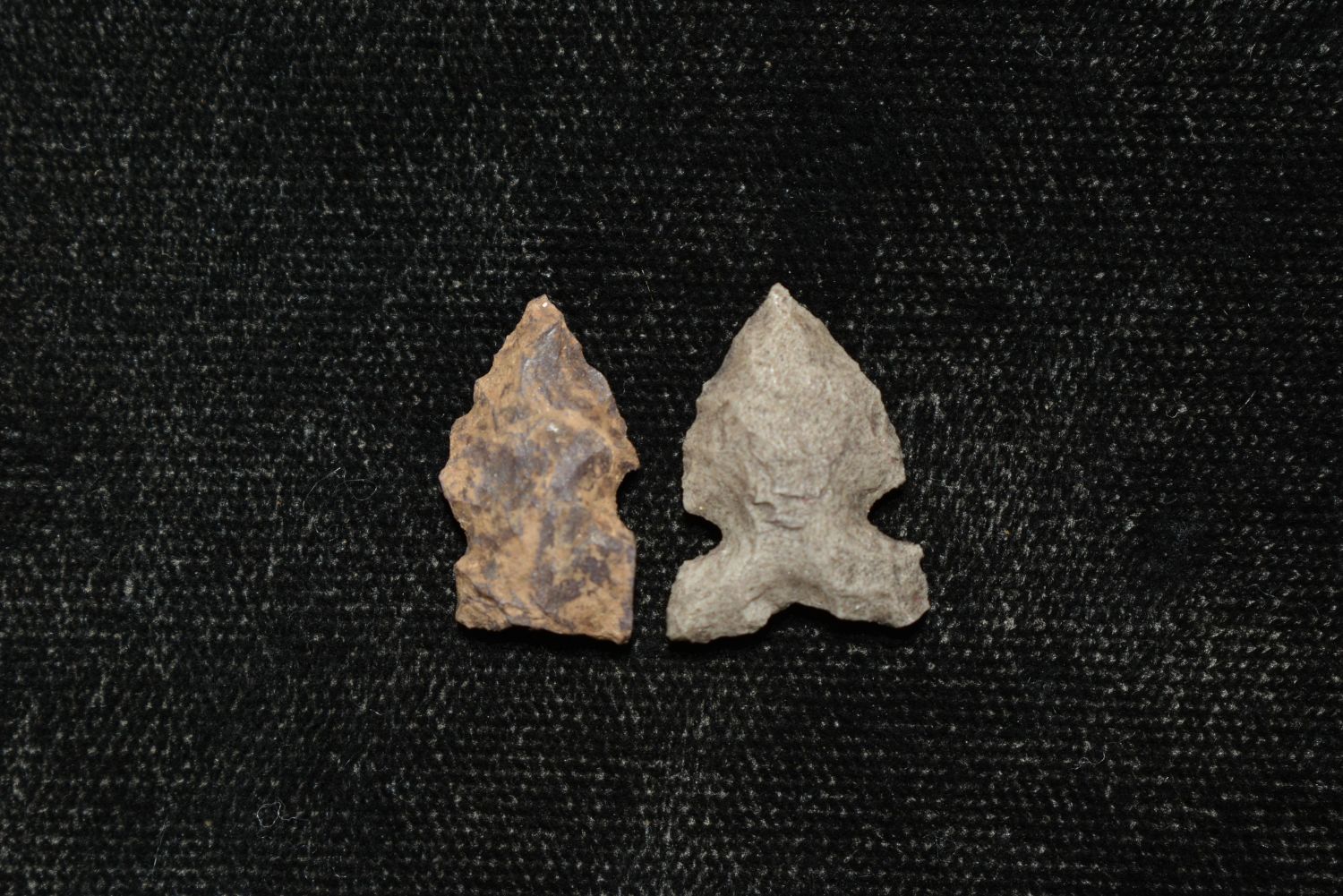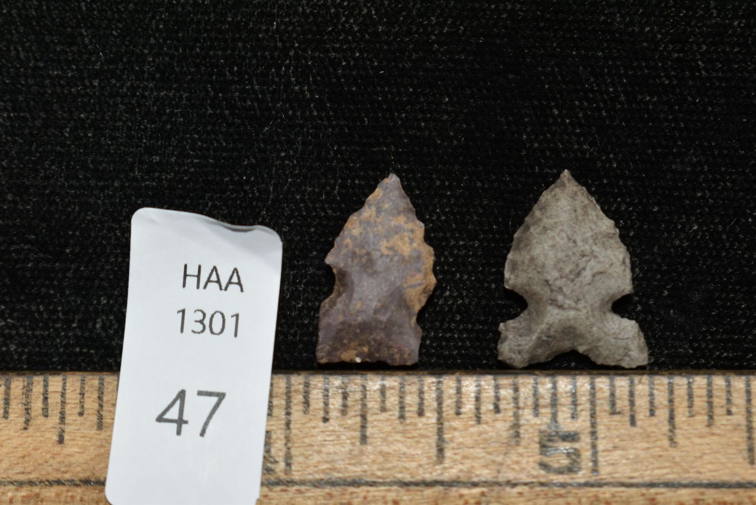 Lot of 2 Birdpoints, Largest 1/4", Musselshell, MT, Creel Poore was born and raised in Musselshell, Montana where he found his first arrowhead at a very early age. This led Creel on a lifetime search for Montana’s prehistoric past. Creel owned a ranch in Musselshell and collected from sites and in and around the Musselshell River and tributaries. Every piece in Creel’s collection is personally found. He did not purchase pieces, nor did he accept pieces as gifts. He took pride in the fact he found every piece. He also made the cedar frames from cedar trees that were cut on his ranch. Many of the pieces were collected from the buffalo jumps which were plentiful nearby