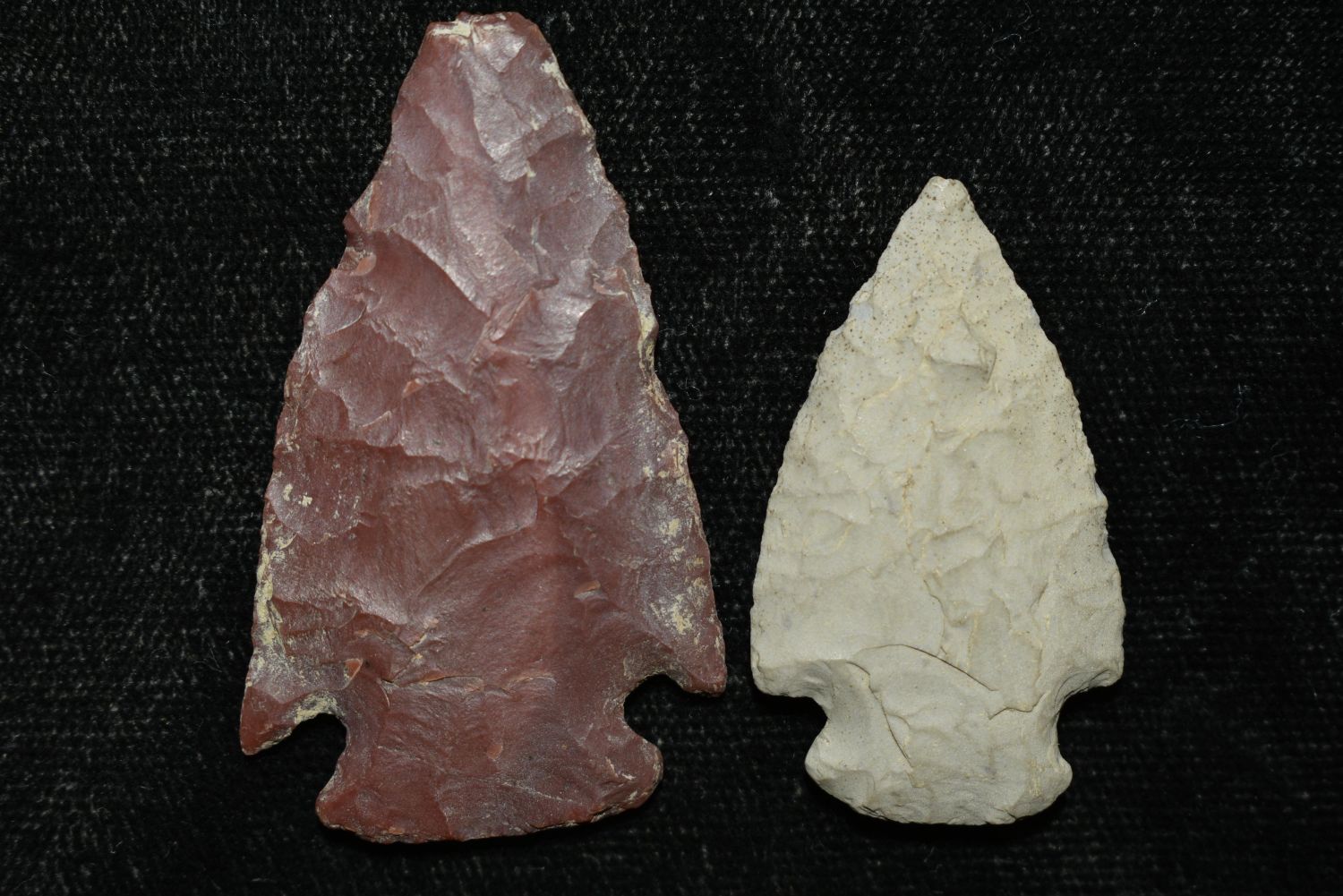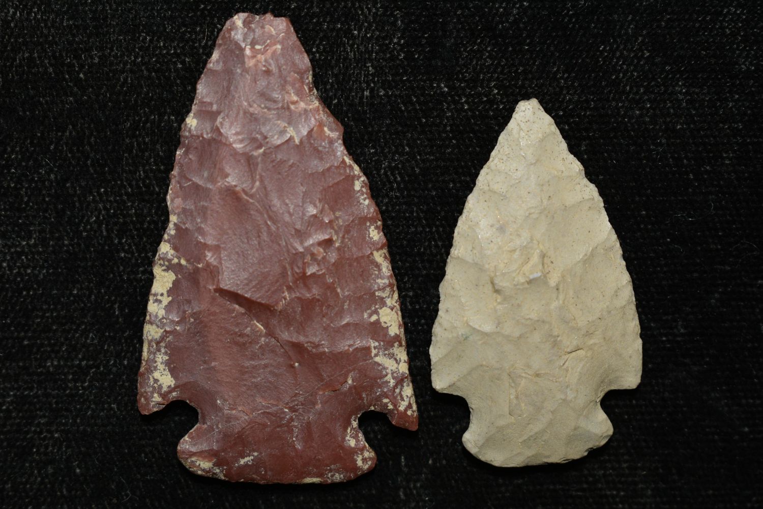 Lot of 2 Arrowheads, Largest 1 9/16", Musselshell, MT, Creel Poore was born and raised in Musselshell, Montana where he found his first arrowhead at a very early age. This led Creel on a lifetime search for Montana’s prehistoric past. Creel owned a ranch in Musselshell and collected from sites and in and around the Musselshell River and tributaries. Every piece in Creel’s collection is personally found. He did not purchase pieces, nor did he accept pieces as gifts. He took pride in the fact he found every piece. He also made the cedar frames from cedar trees that were cut on his ranch. Many of the pieces were collected from the buffalo jumps which were plentiful nearby