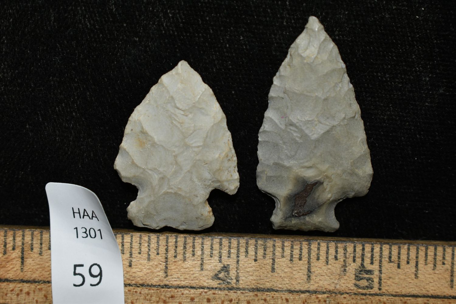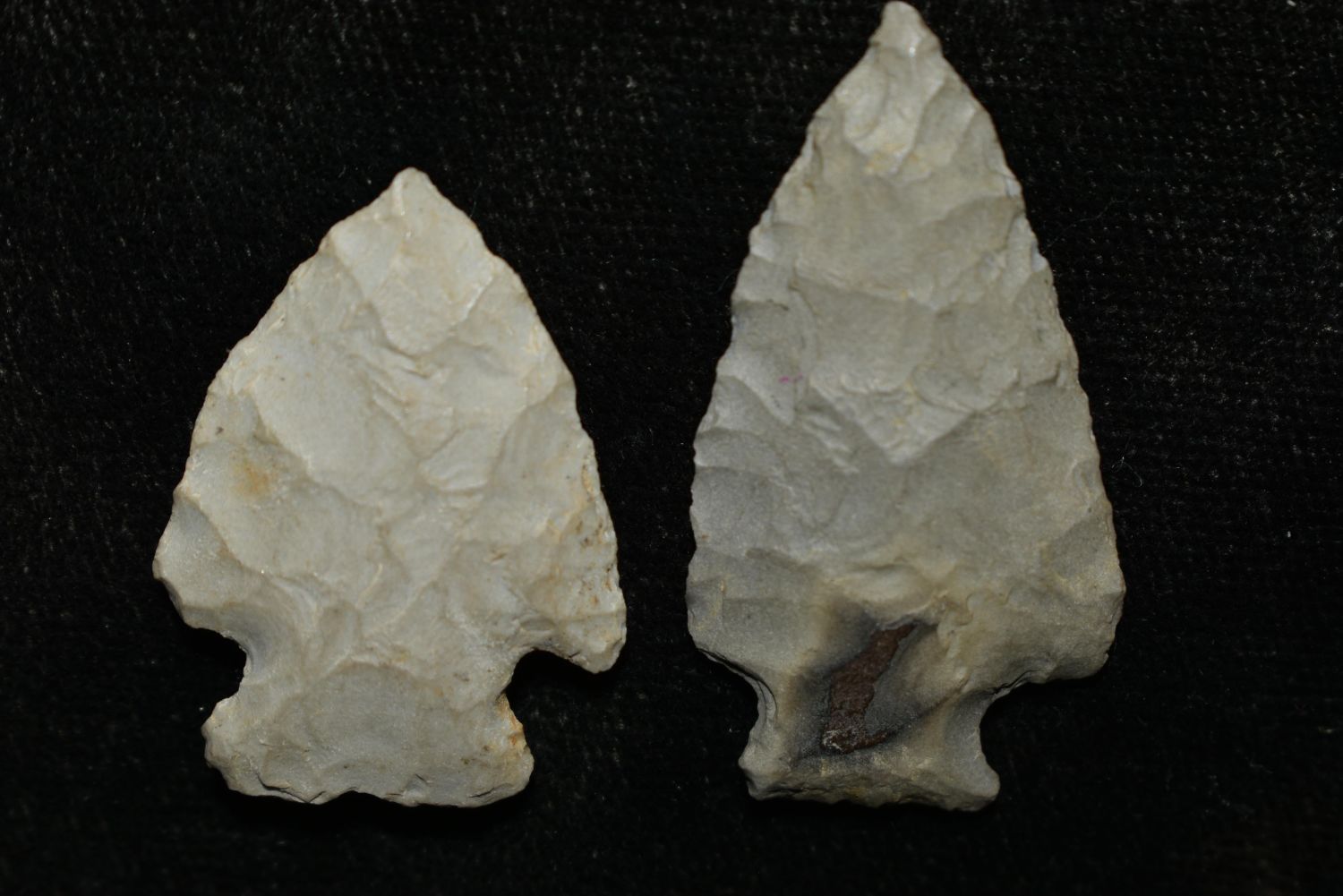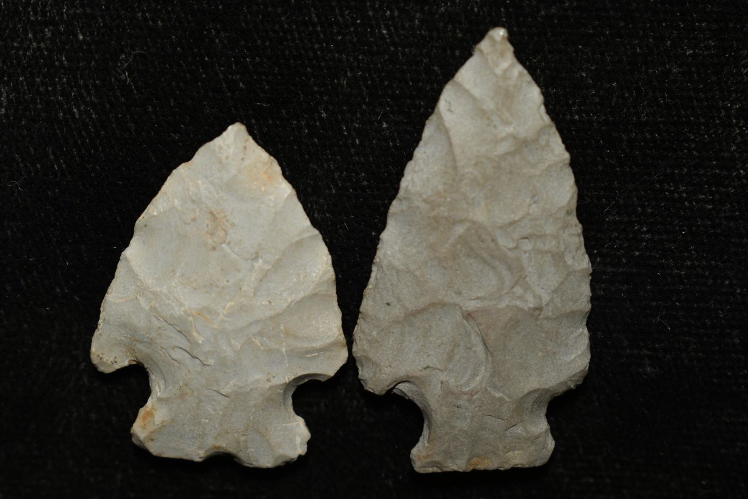 Lot of 2 Arrowheads, Largest 1 1/2", Musselshell, MT, Creel Poore was born and raised in Musselshell, Montana where he found his first arrowhead at a very early age. This led Creel on a lifetime search for Montana’s prehistoric past. Creel owned a ranch in Musselshell and collected from sites and in and around the Musselshell River and tributaries. Every piece in Creel’s collection is personally found. He did not purchase pieces, nor did he accept pieces as gifts. He took pride in the fact he found every piece. He also made the cedar frames from cedar trees that were cut on his ranch. Many of the pieces were collected from the buffalo jumps which were plentiful nearby