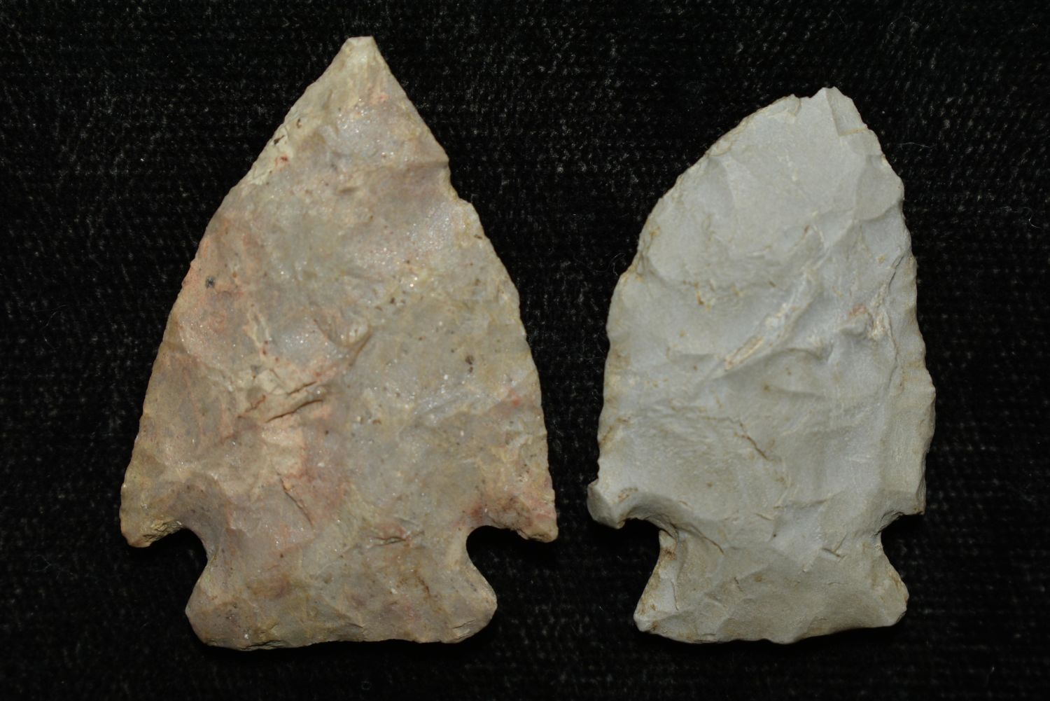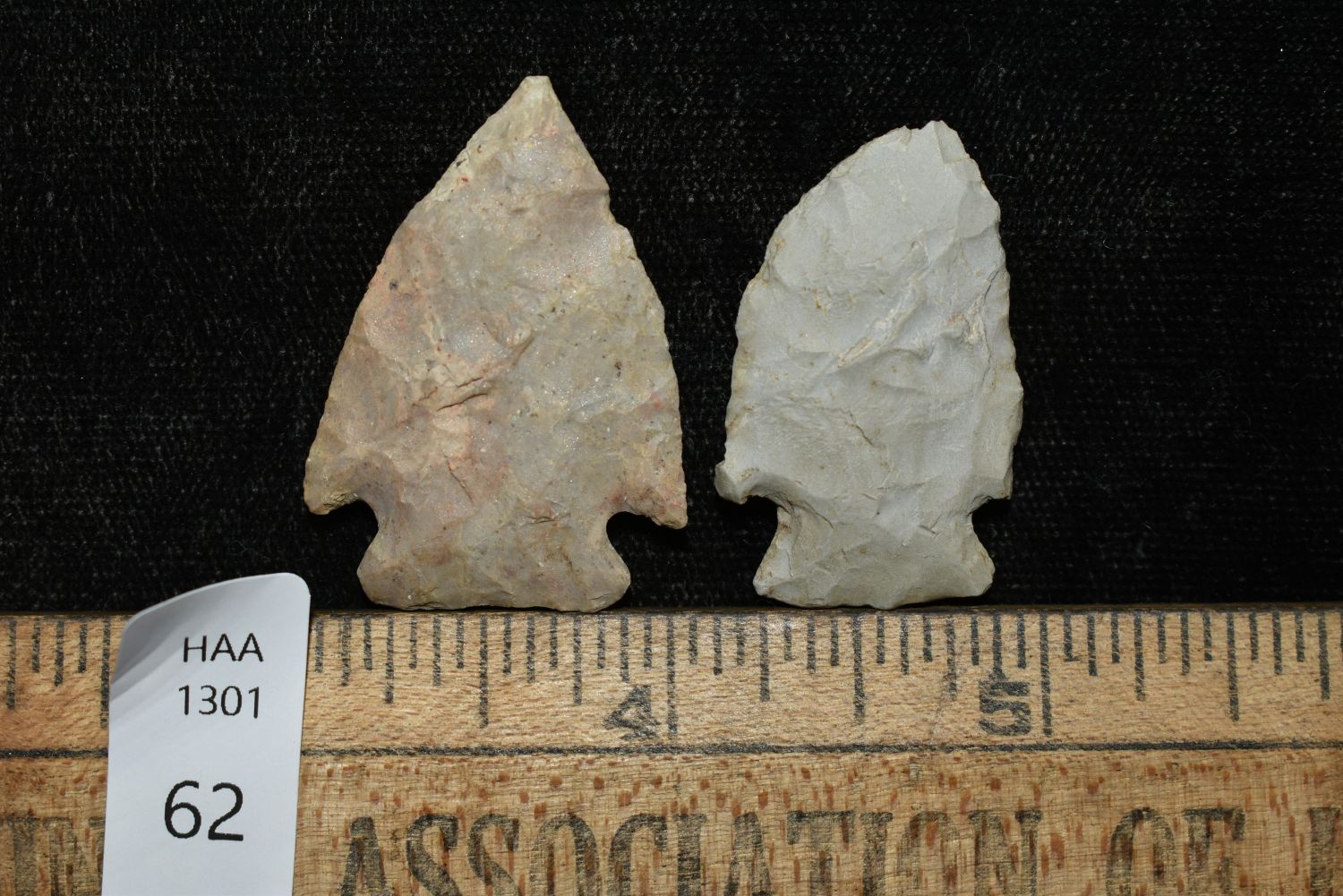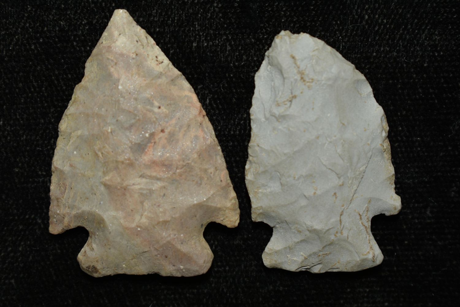 Lot of 2 Arrowheads, Largest 1 3/8", Musselshell, MT, Creel Poore was born and raised in Musselshell, Montana where he found his first arrowhead at a very early age. This led Creel on a lifetime search for Montana’s prehistoric past. Creel owned a ranch in Musselshell and collected from sites and in and around the Musselshell River and tributaries. Every piece in Creel’s collection is personally found. He did not purchase pieces, nor did he accept pieces as gifts. He took pride in the fact he found every piece. He also made the cedar frames from cedar trees that were cut on his ranch. Many of the pieces were collected from the buffalo jumps which were plentiful nearby
