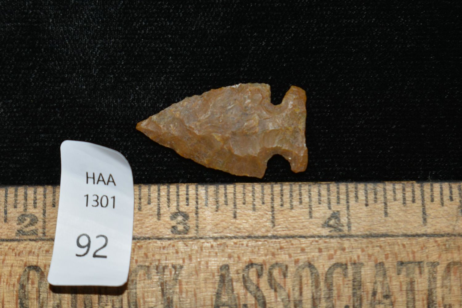 1 1/8" Glendo Arrow, Musselshell, MT, Creel Poore was born and raised in Musselshell, Montana where he found his first arrowhead at a very early age. This led Creel on a lifetime search for Montana’s prehistoric past. Creel owned a ranch in Musselshell and collected from sites and in and around the Musselshell River and tributaries. Every piece in Creel’s collection is personally found. He did not purchase pieces, nor did he accept pieces as gifts. He took pride in the fact he found every piece. He also made the cedar frames from cedar trees that were cut on his ranch. Many of the pieces were collected from the buffalo jumps which were plentiful nearby