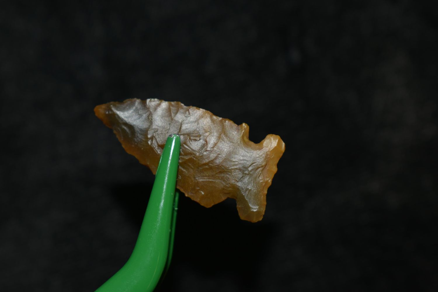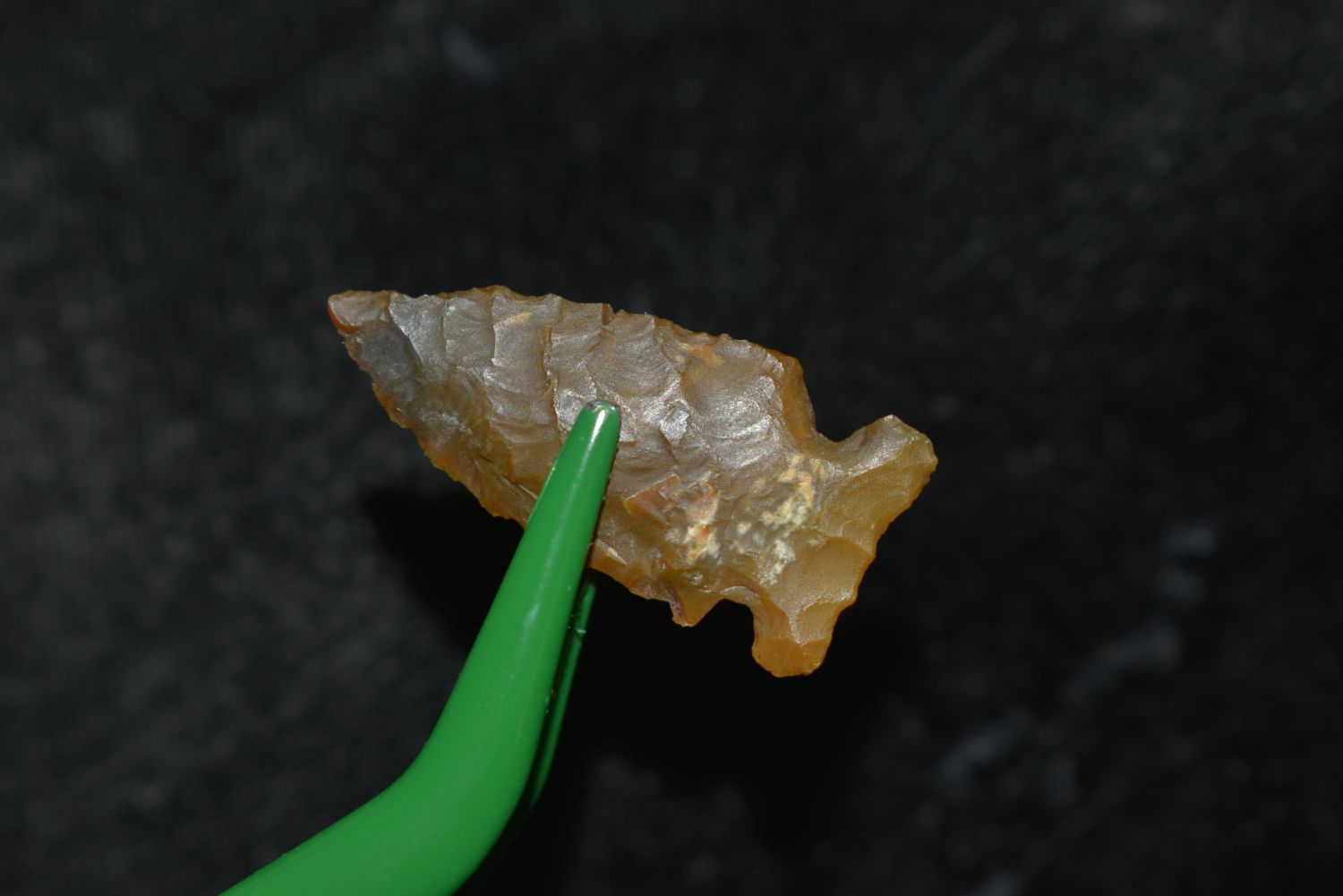 1" Plains Side Notch, Musselshell, MT, Creel Poore was born and raised in Musselshell, Montana where he found his first arrowhead at a very early age. This led Creel on a lifetime search for Montana’s prehistoric past. Creel owned a ranch in Musselshell and collected from sites and in and around the Musselshell River and tributaries. Every piece in Creel’s collection is personally found. He did not purchase pieces, nor did he accept pieces as gifts. He took pride in the fact he found every piece. He also made the cedar frames from cedar trees that were cut on his ranch. Many of the pieces were collected from the buffalo jumps which were plentiful nearby