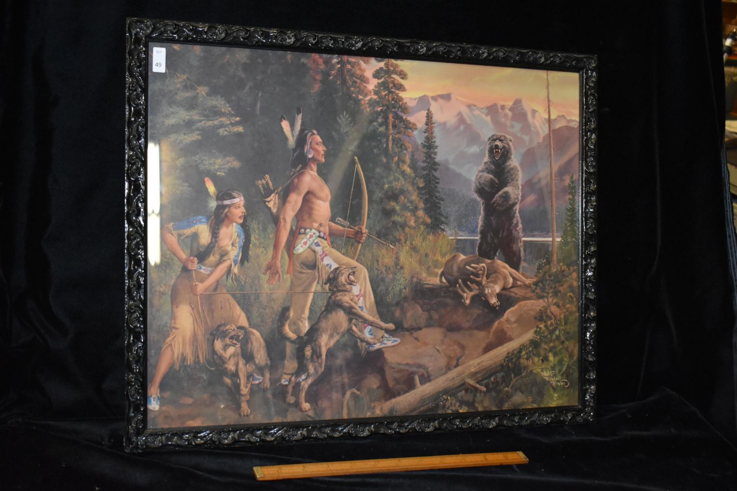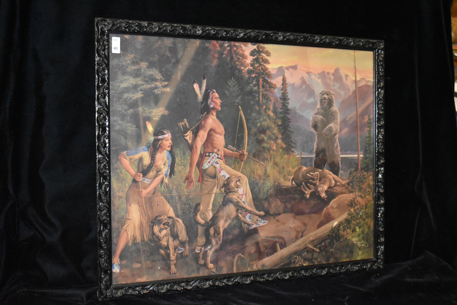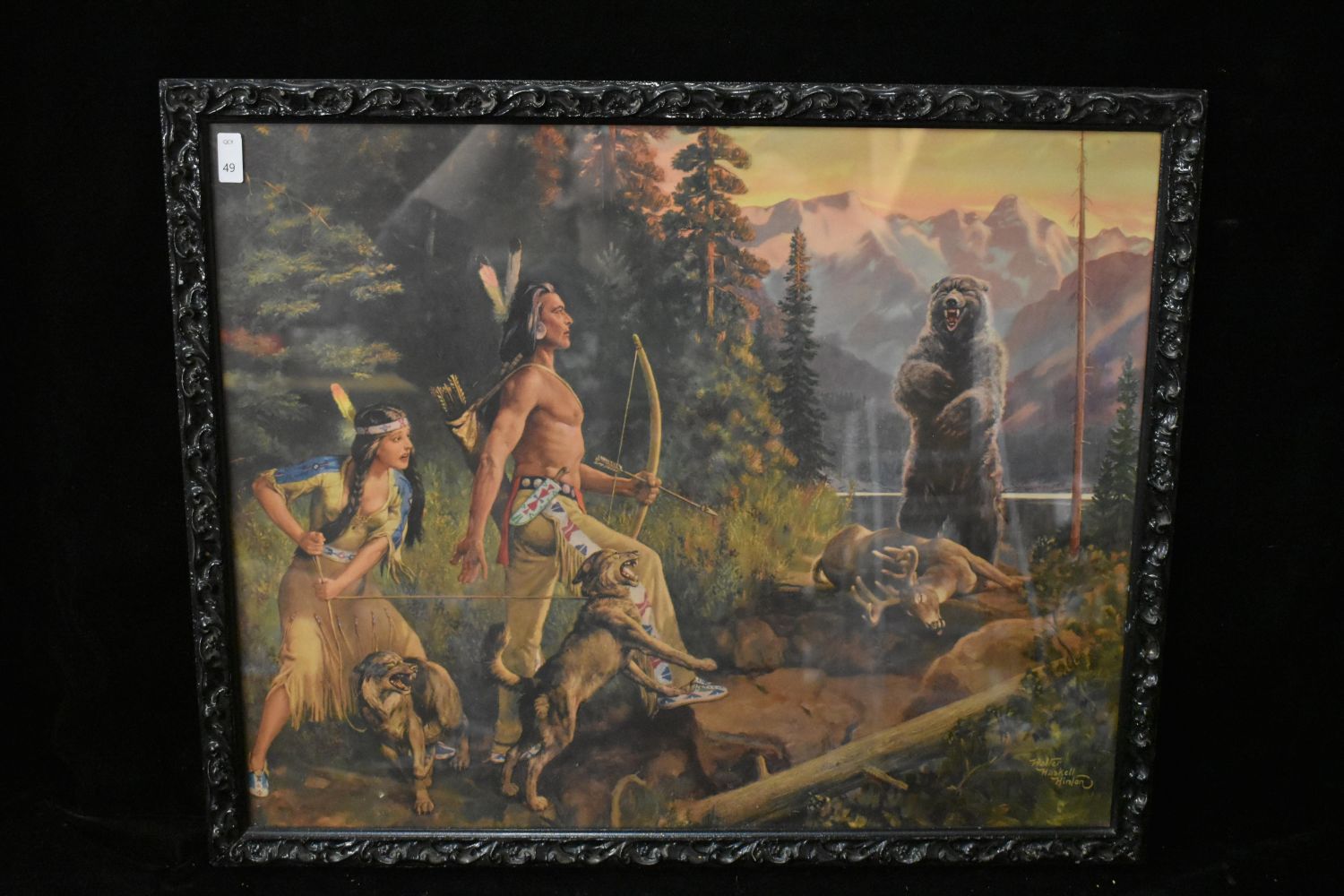 12 1/2x 17 1/2" Vintage Framed Print of Native Americans Encoutering a Bear by Walter Haskel Hinton, Antiques