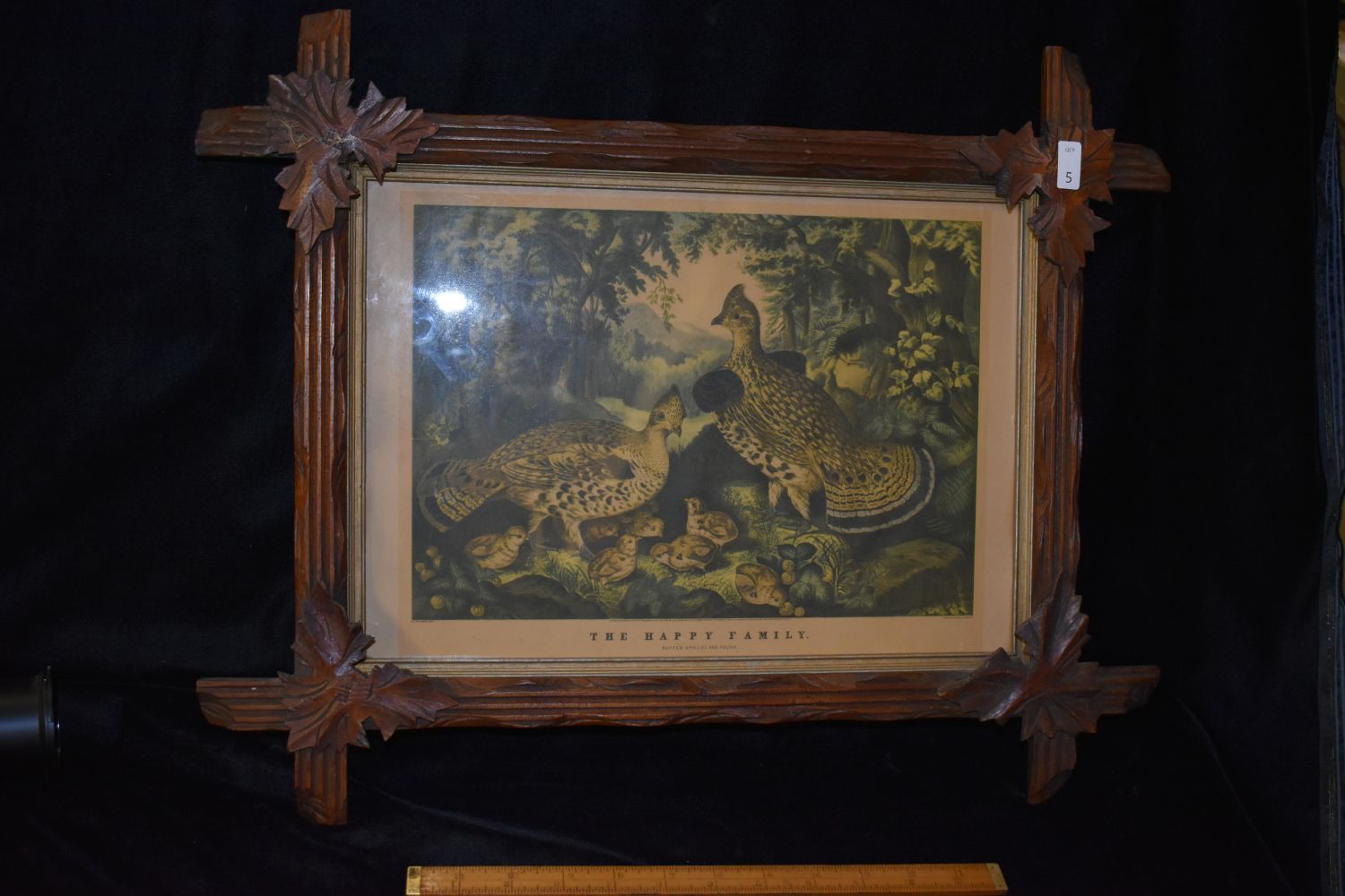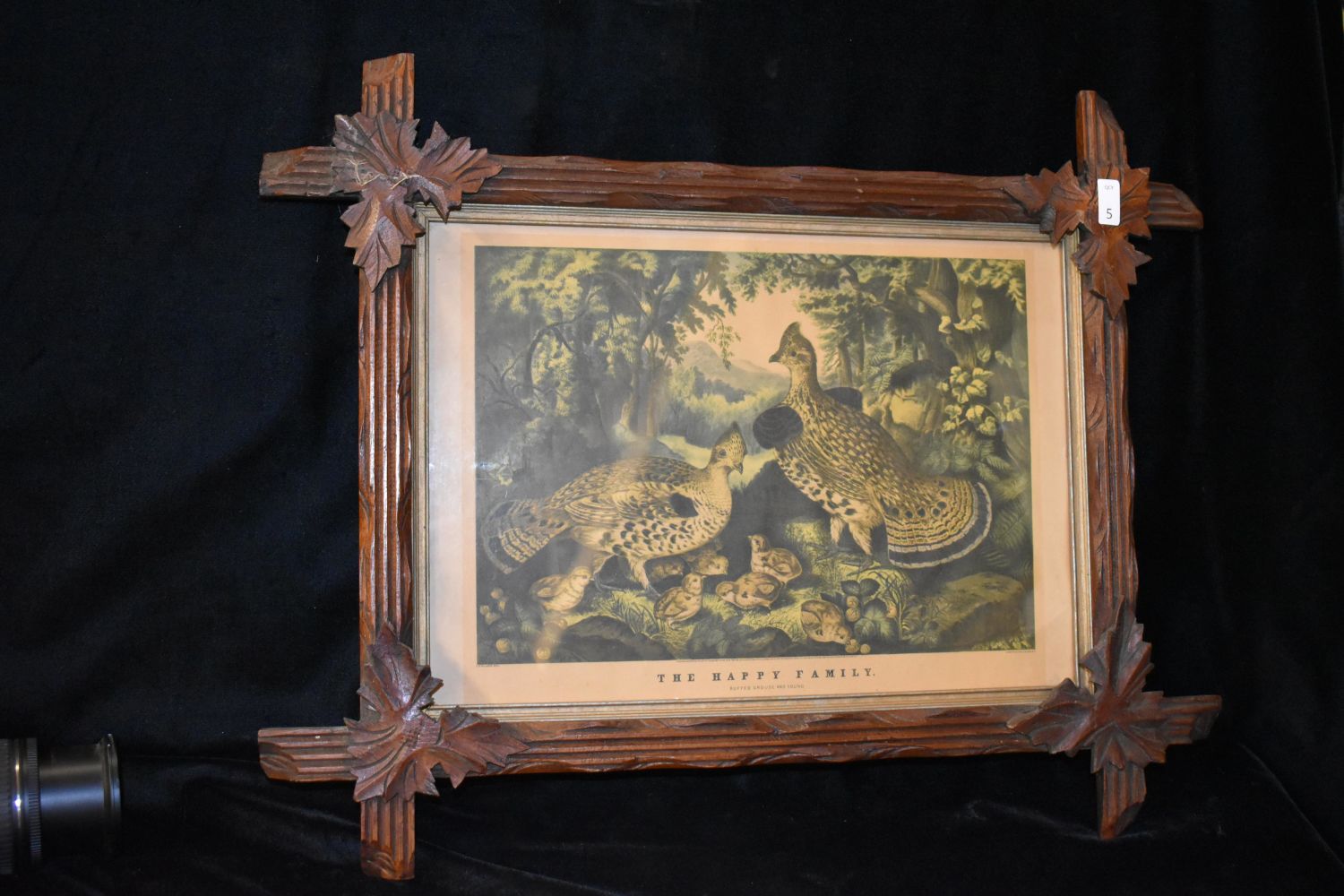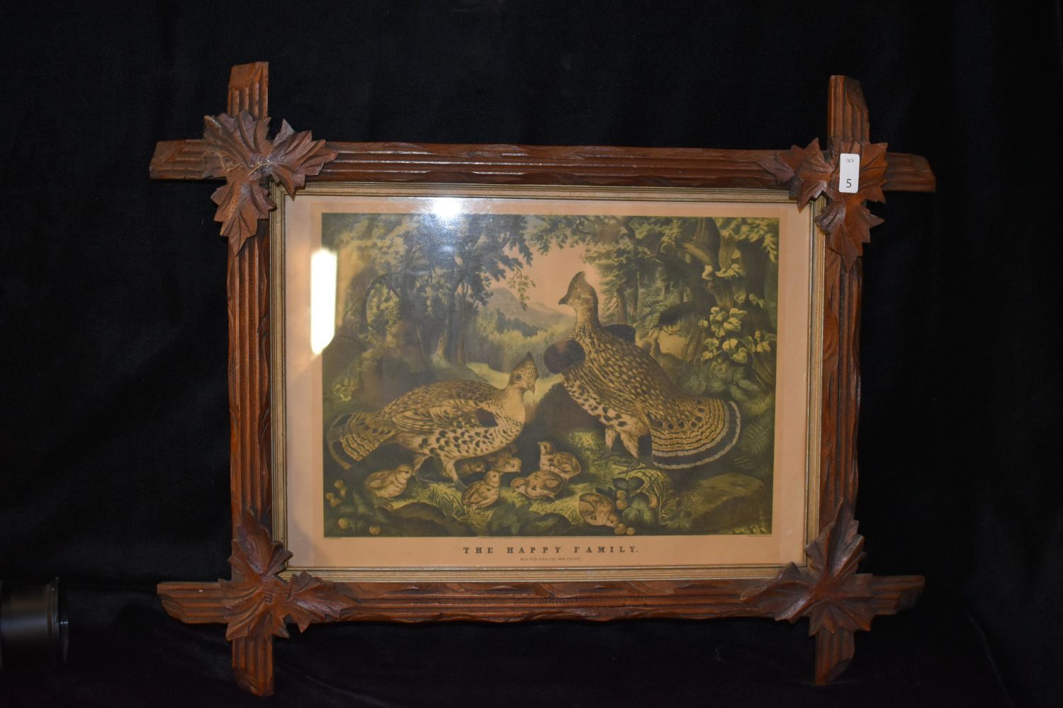 12×16" "The Happy Family" Vintage Grouse Print with Engraved Wooden Frame, Antiques