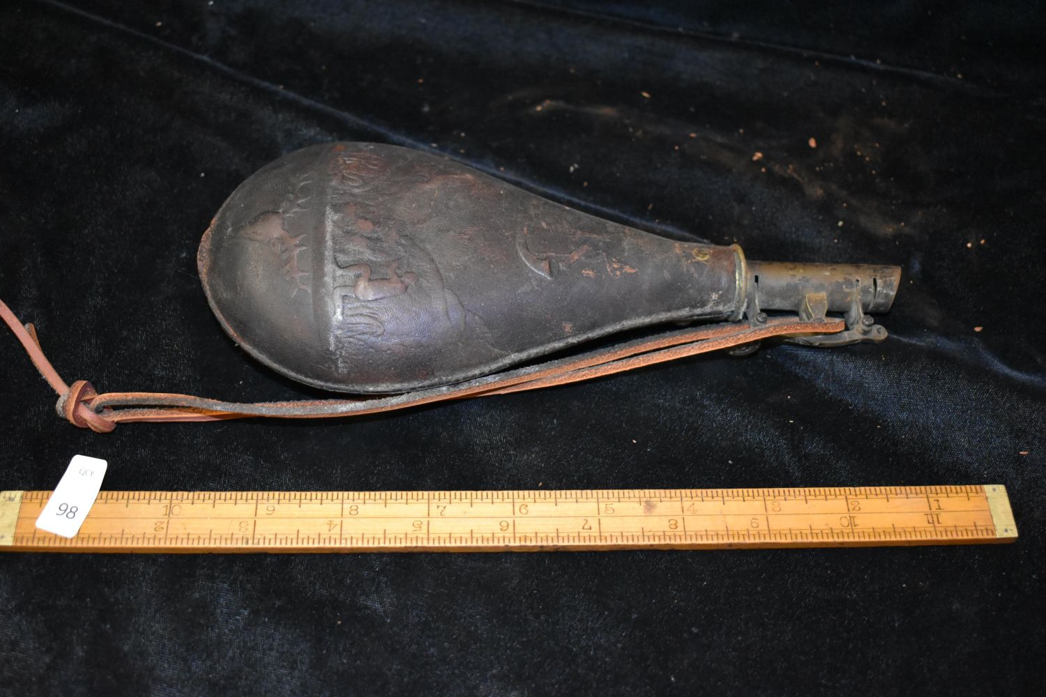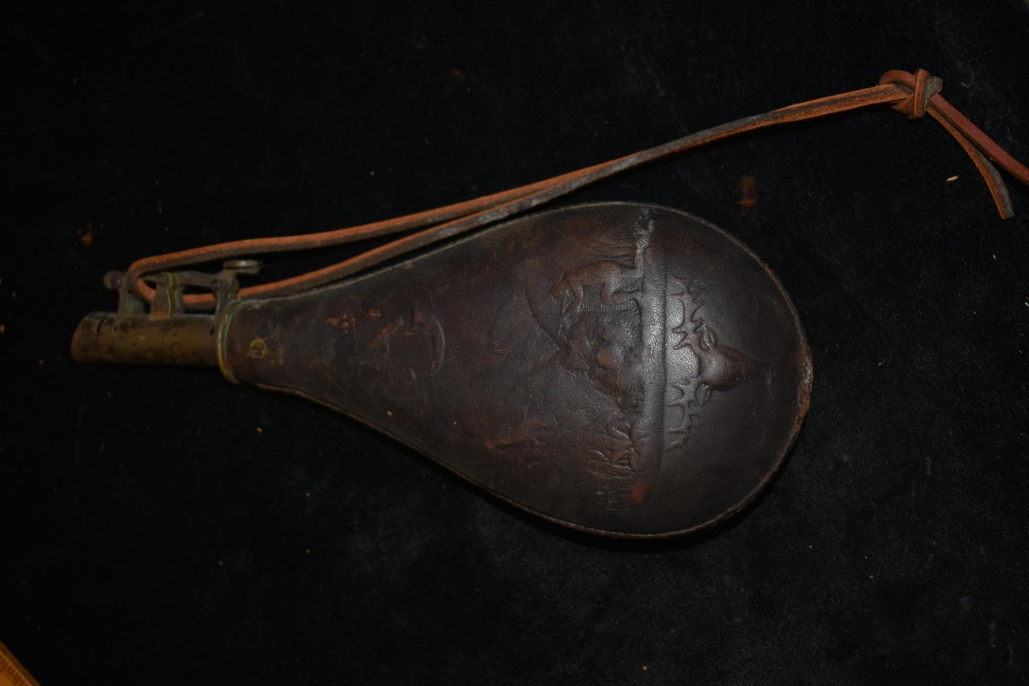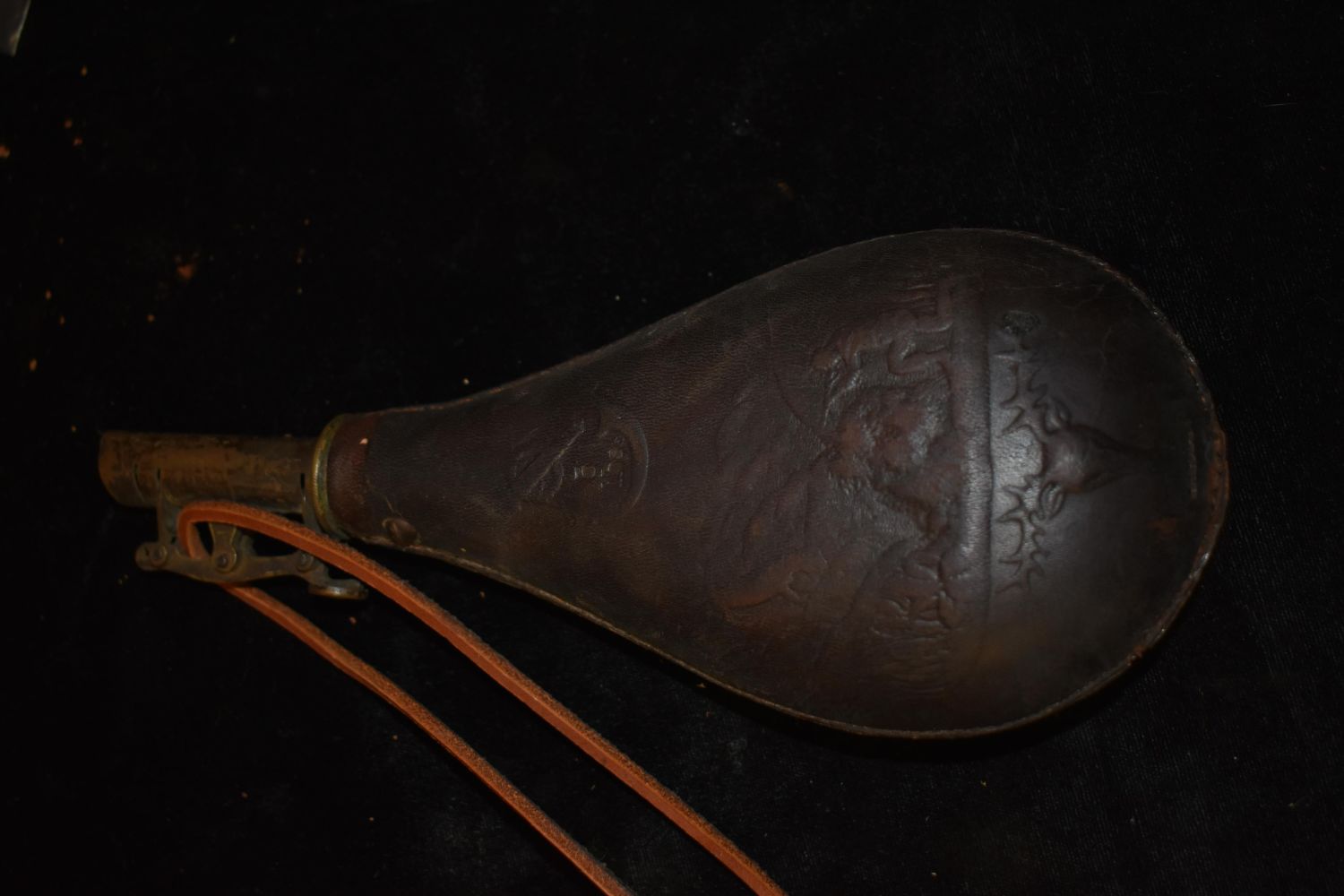 9" Gunpowder bag, leather and Brass with Hunting Scene, Vintage/ Antiques