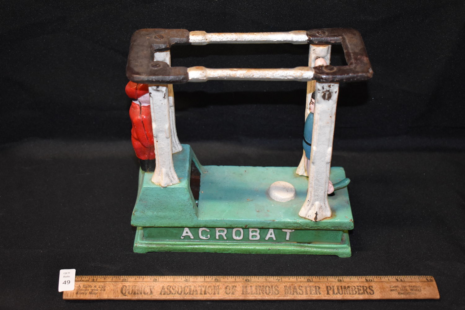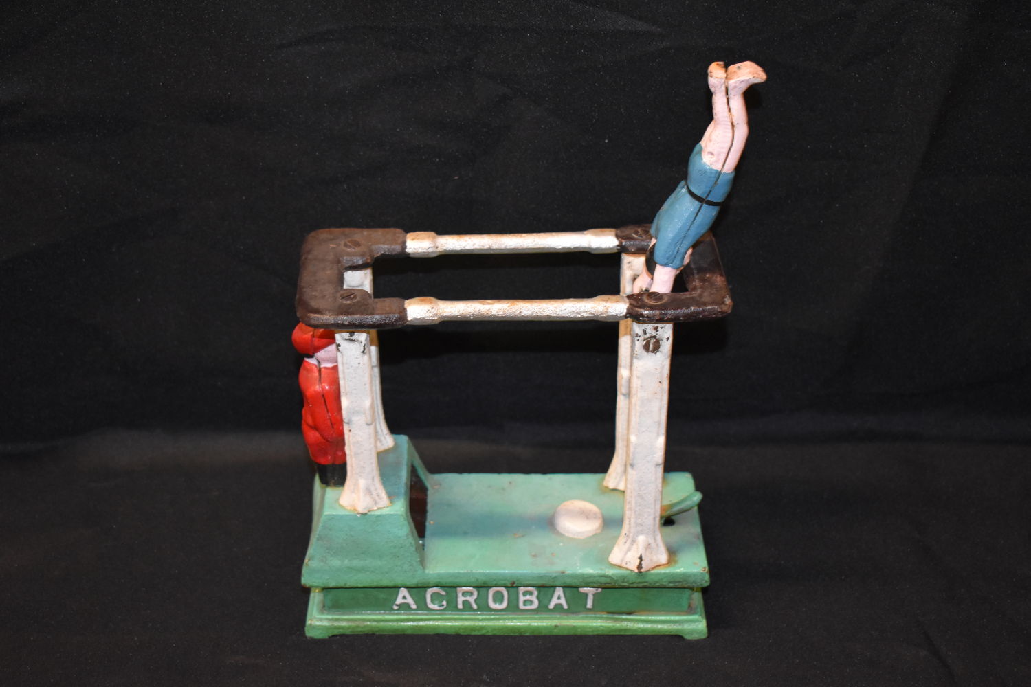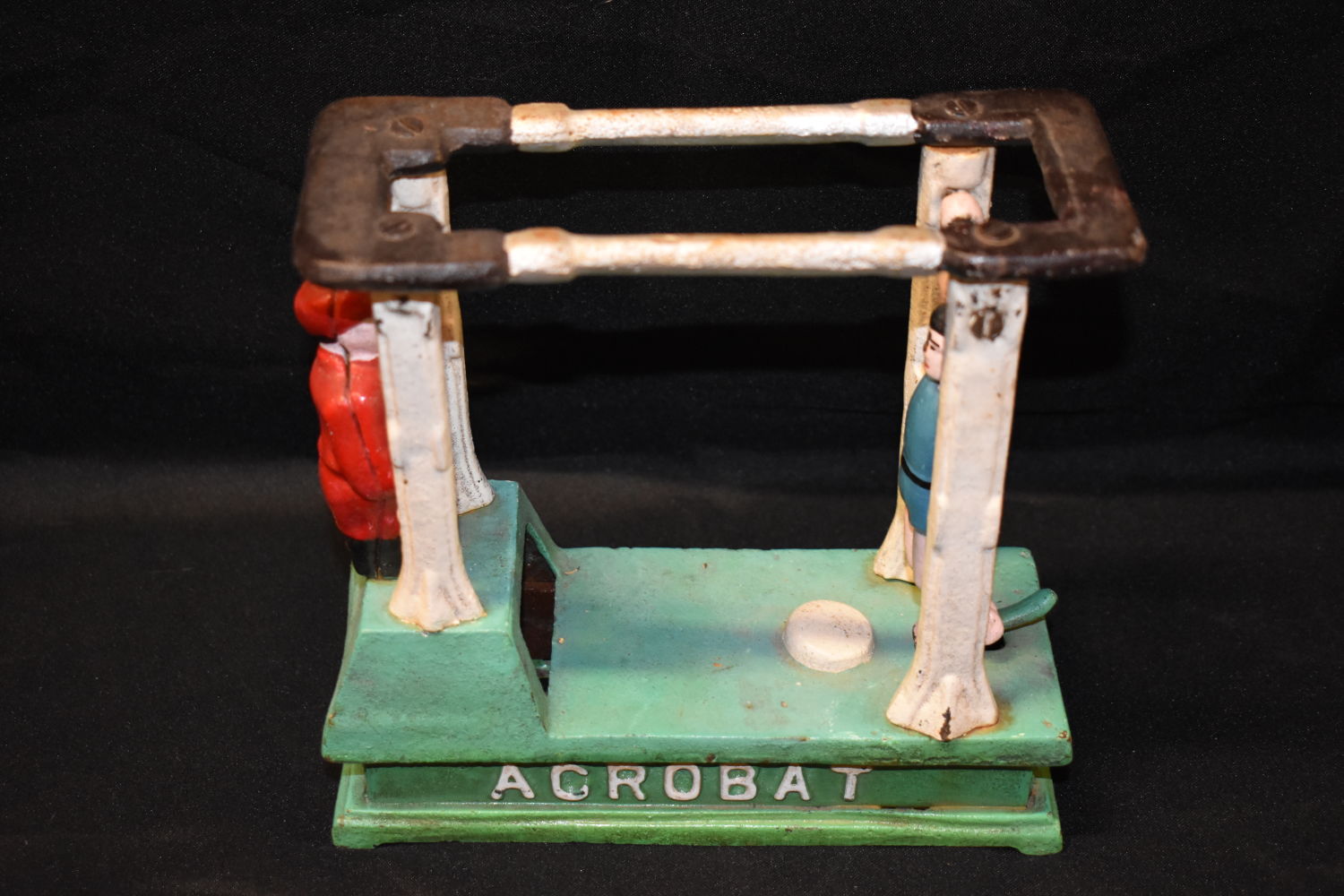7x7 1/2" Vintage Spring loaded Coin Gymnast Bank, Antiques