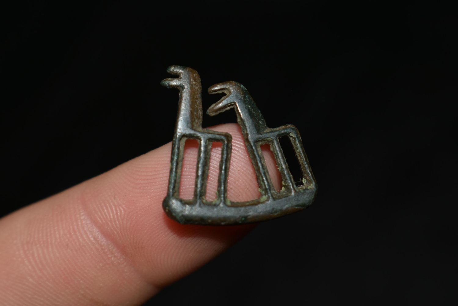 A rare zoomorphic amulet from the Near East, ca. 800 – 400 BC. This delicately made bronze amulet is 3/4” high and depicts a pair of camels. In perfect condition with fine patina