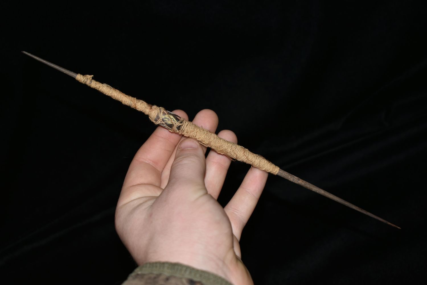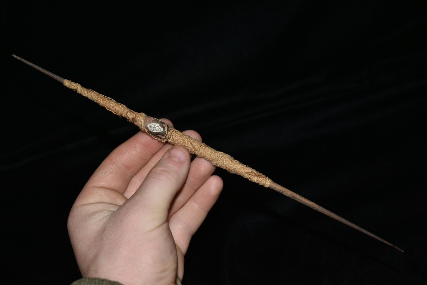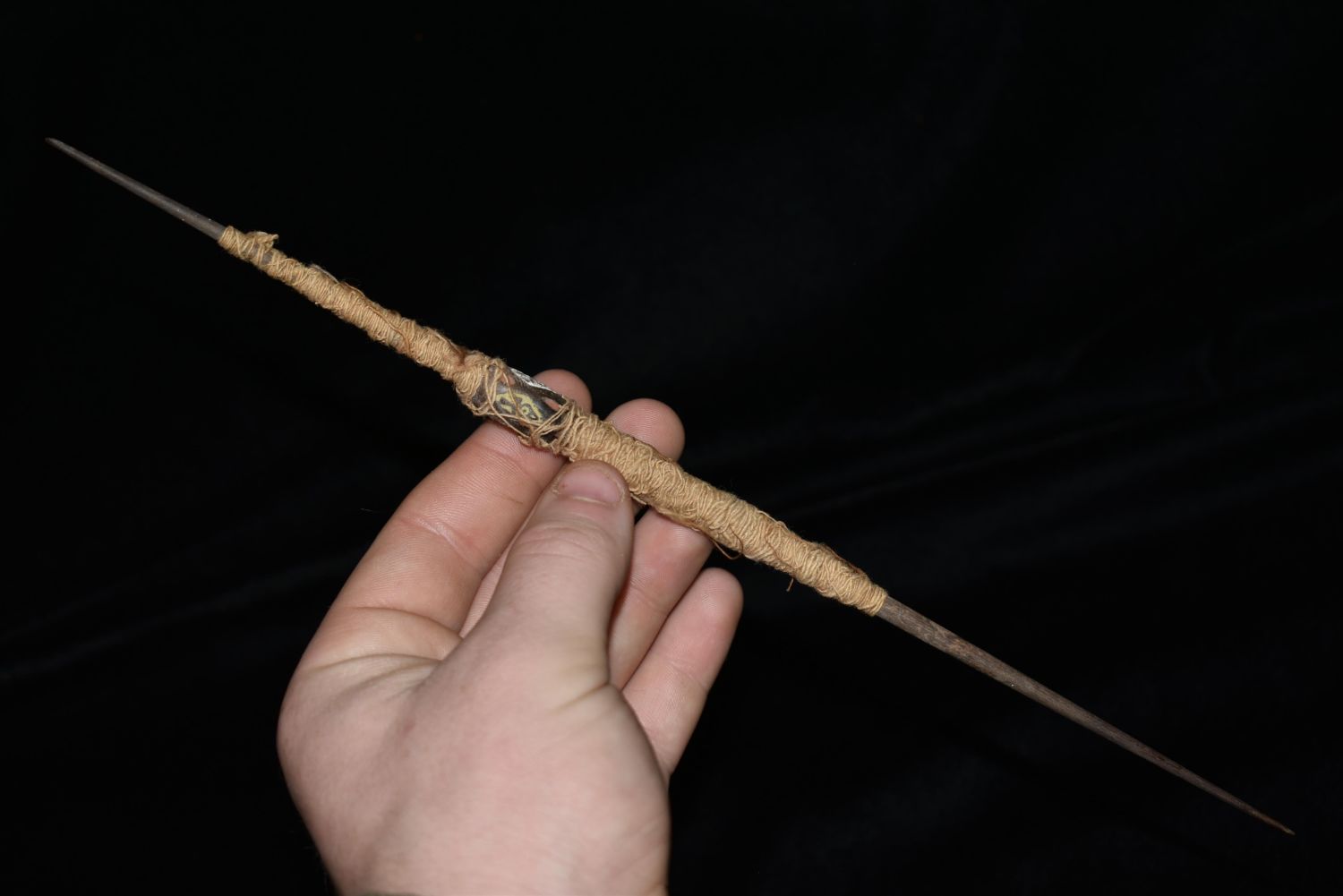 An excellent Chancay spindle from Peru, ca. 1100 – 1450 AS. It is 11-1/8” long and features a delicately incised whorl decorated with birds in flight and inlaid with white and red pigment. The spindle also retains a good amount of the original ancient thread.