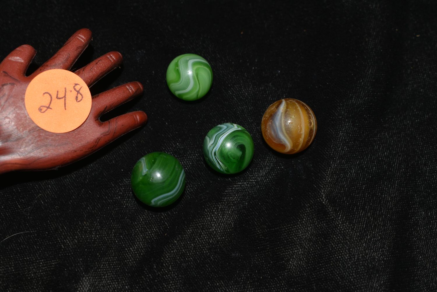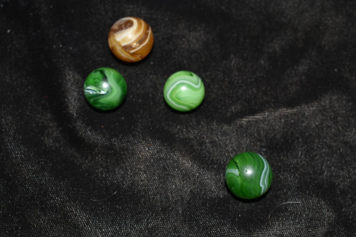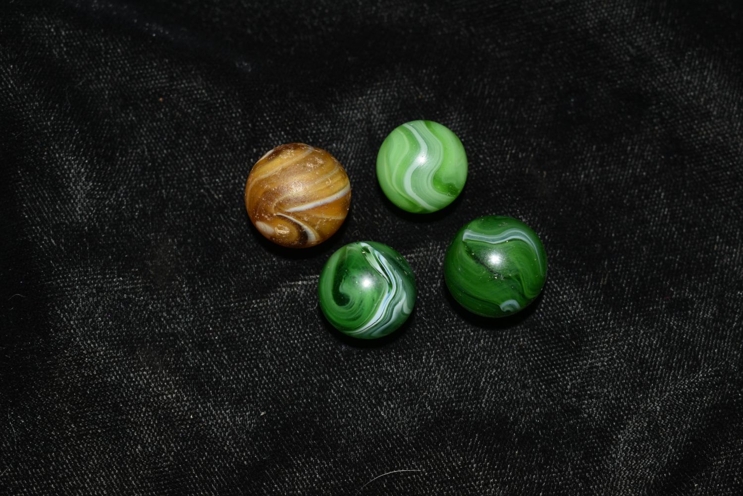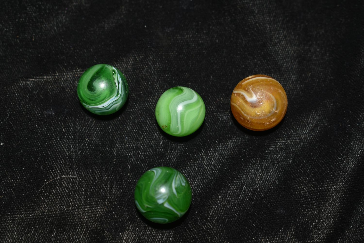 4 MF Christensen Hand Gathered Slag Marbles. Late 1920’s to 1930’s. 3 Green and One Brick. 2 of the greens are excellent. The other two saw a good amount of game play but are still in good shape.