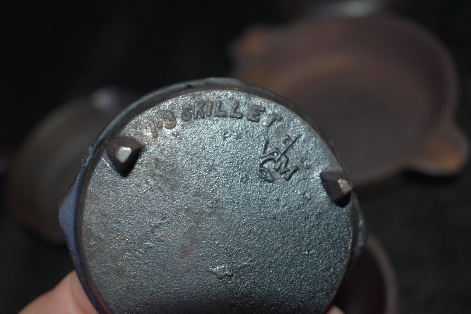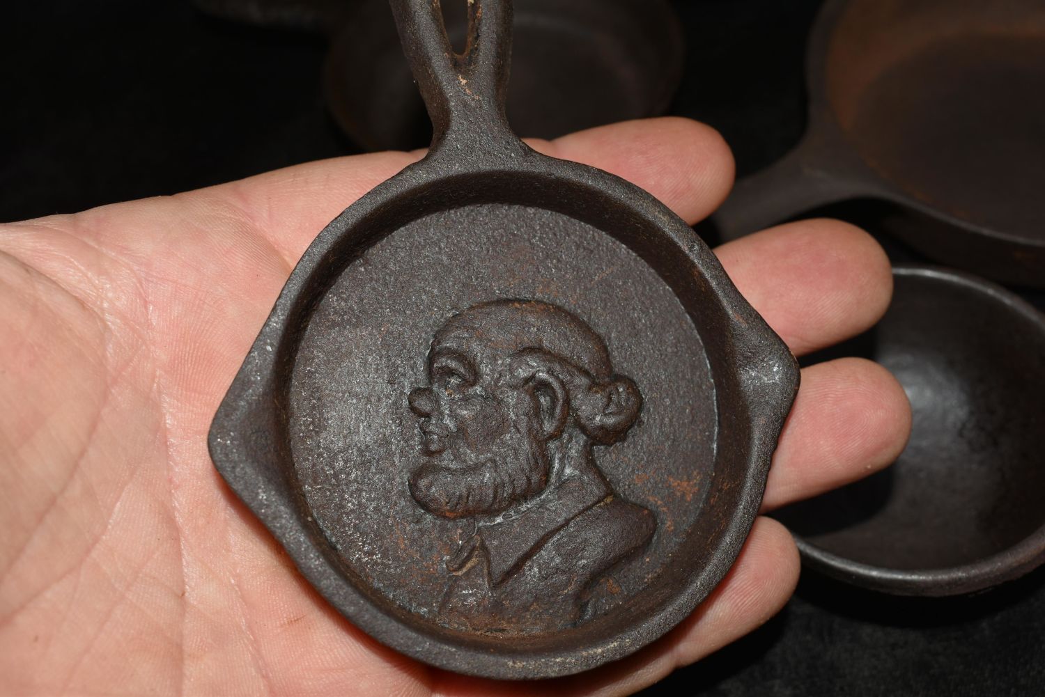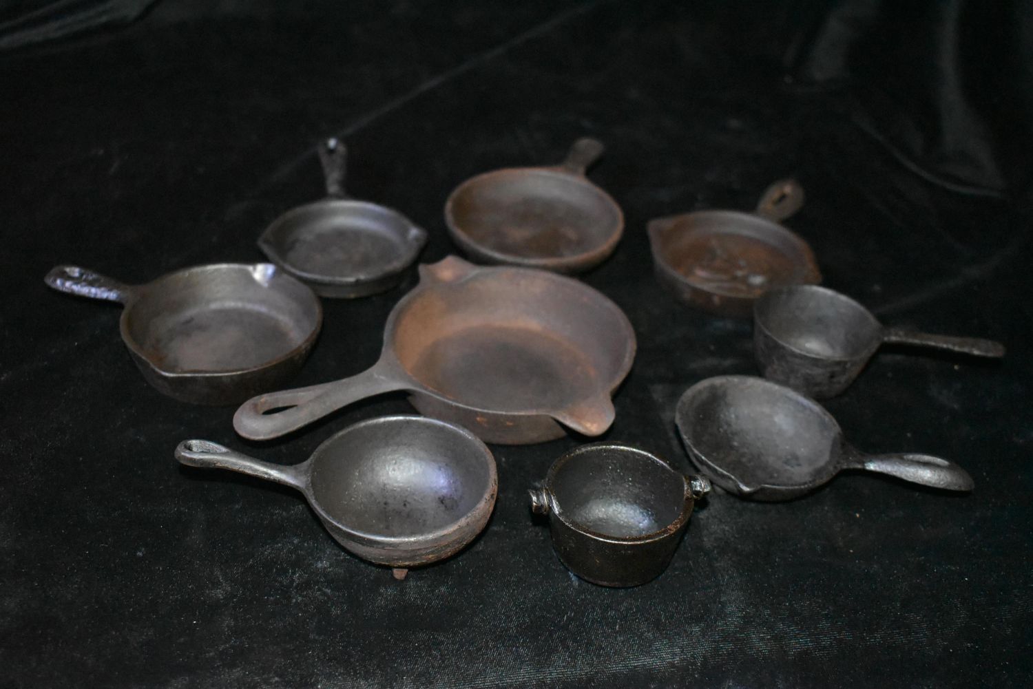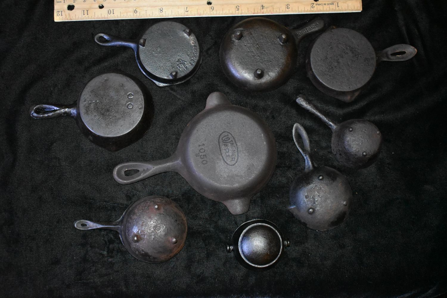 Collection of 9 Antique Cast Iron Minature Cookware, 1 Wagner Ware 1050B. One has what looks like the Image of a Bald Irishman in the base, a 1 Spider, and one that reads Deep Fat Skillet., 1-3 Skillet VM, . 1800’s to early 1900’s. 1 7/8" to 6 1/8" Used as Salesman Samples in ages past.