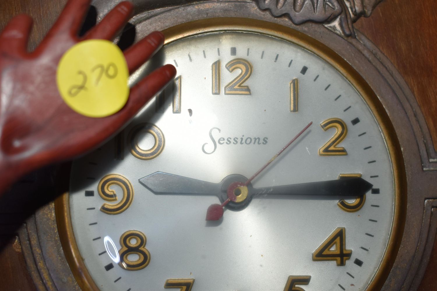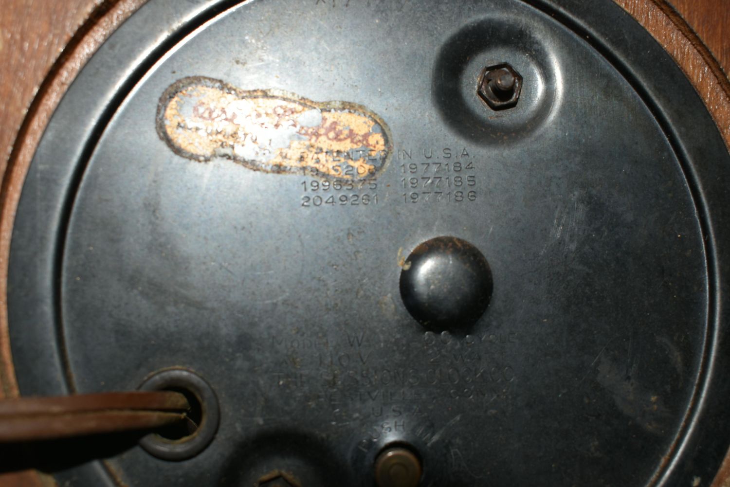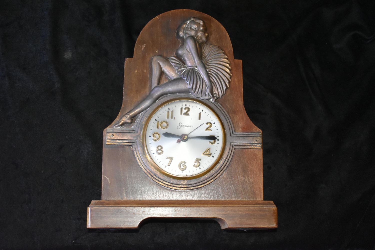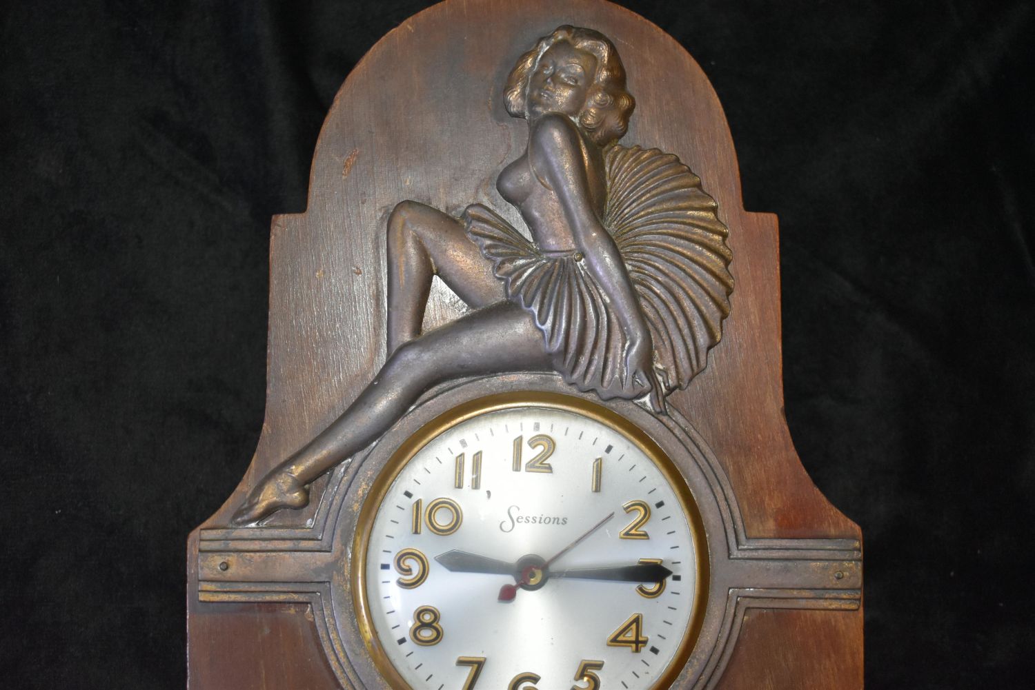 Sessions 1940’s Ballarina Clock. Still Works! The round clock is marked: "SESSIONS." A decal on the back of the clock is marked: "MASTER CRAFTERS Manufacturing Company. Chicago, U.S.A." There are several patent numbers, impressed on the BACK. The largest number, (which would be the most recent) is: "2,049,261." This patent number dates to 1937 – so the clock was made sometime after that – probably in the early 1940’s. Easily the most striking feature, is the metal figure of a woman, on the front of the clock. The metal figure resembles Marilyn Monroe but was before her time. The pin-up style woman seems to be wearing ballet shoes. The clock is 11 inches tall. The base of the clock measures 9 inches wide and is just under 3 inches deep. There are a few scattered scuffs on the wood and the metal has tarnished from time. Other than that shes still in good shape.