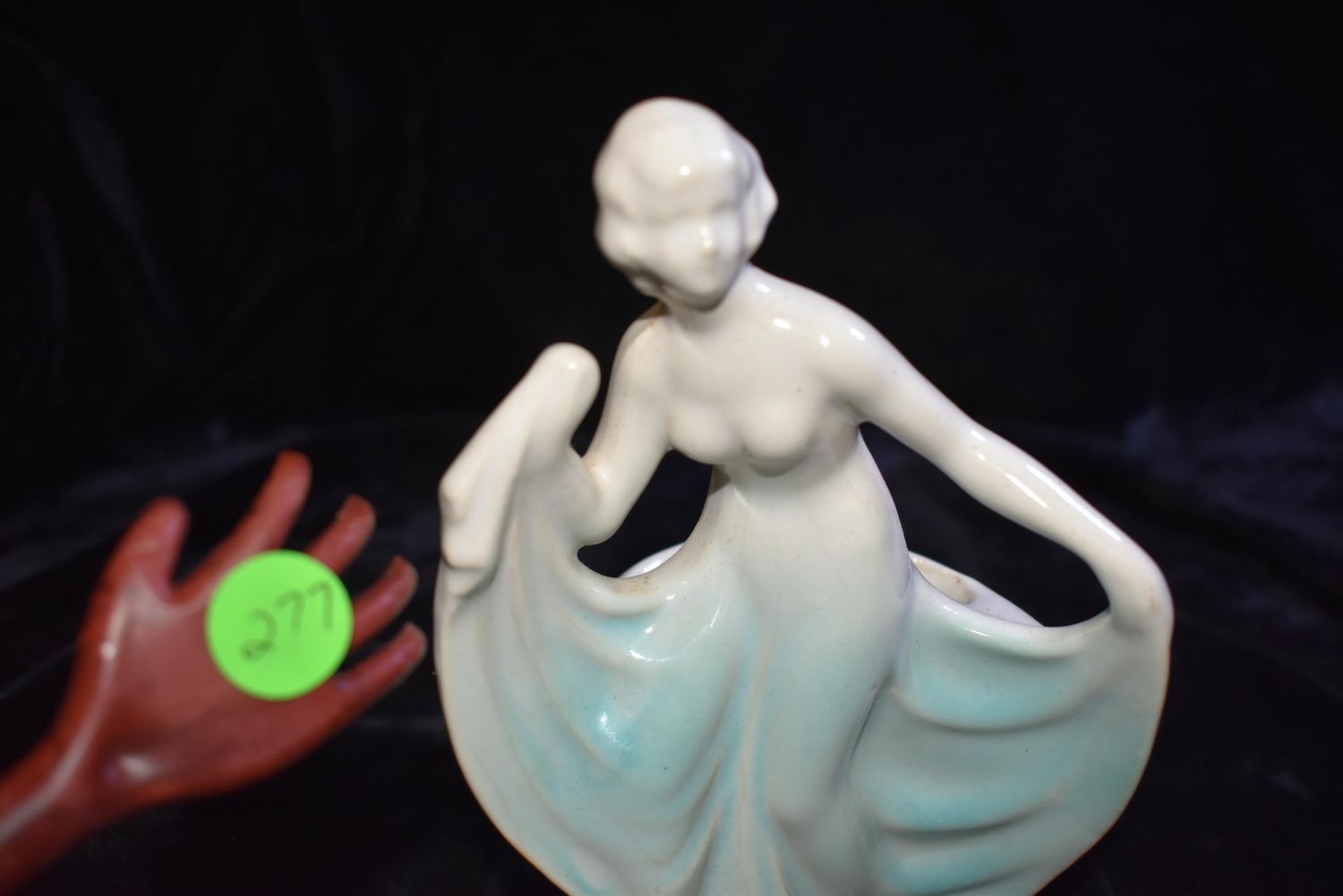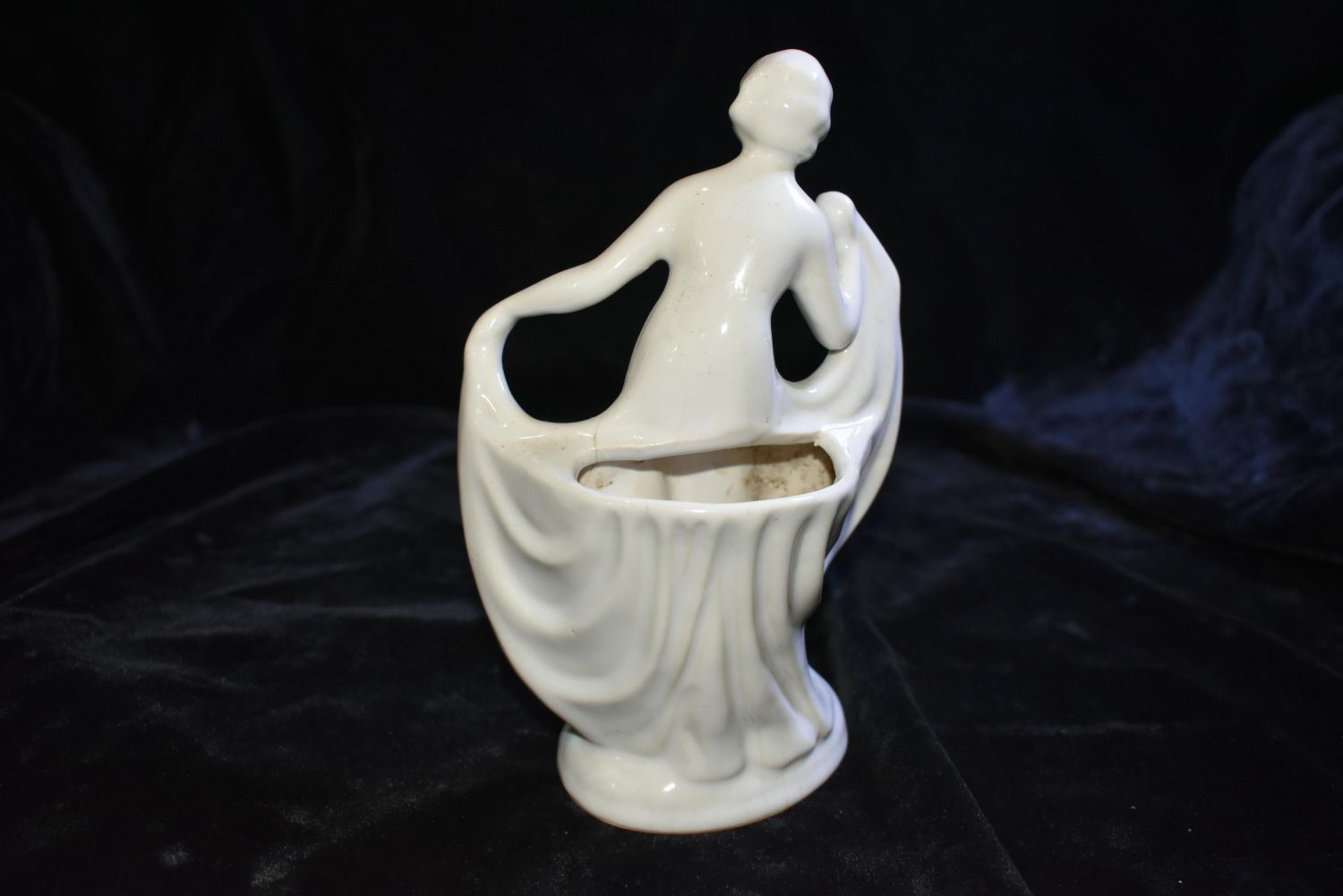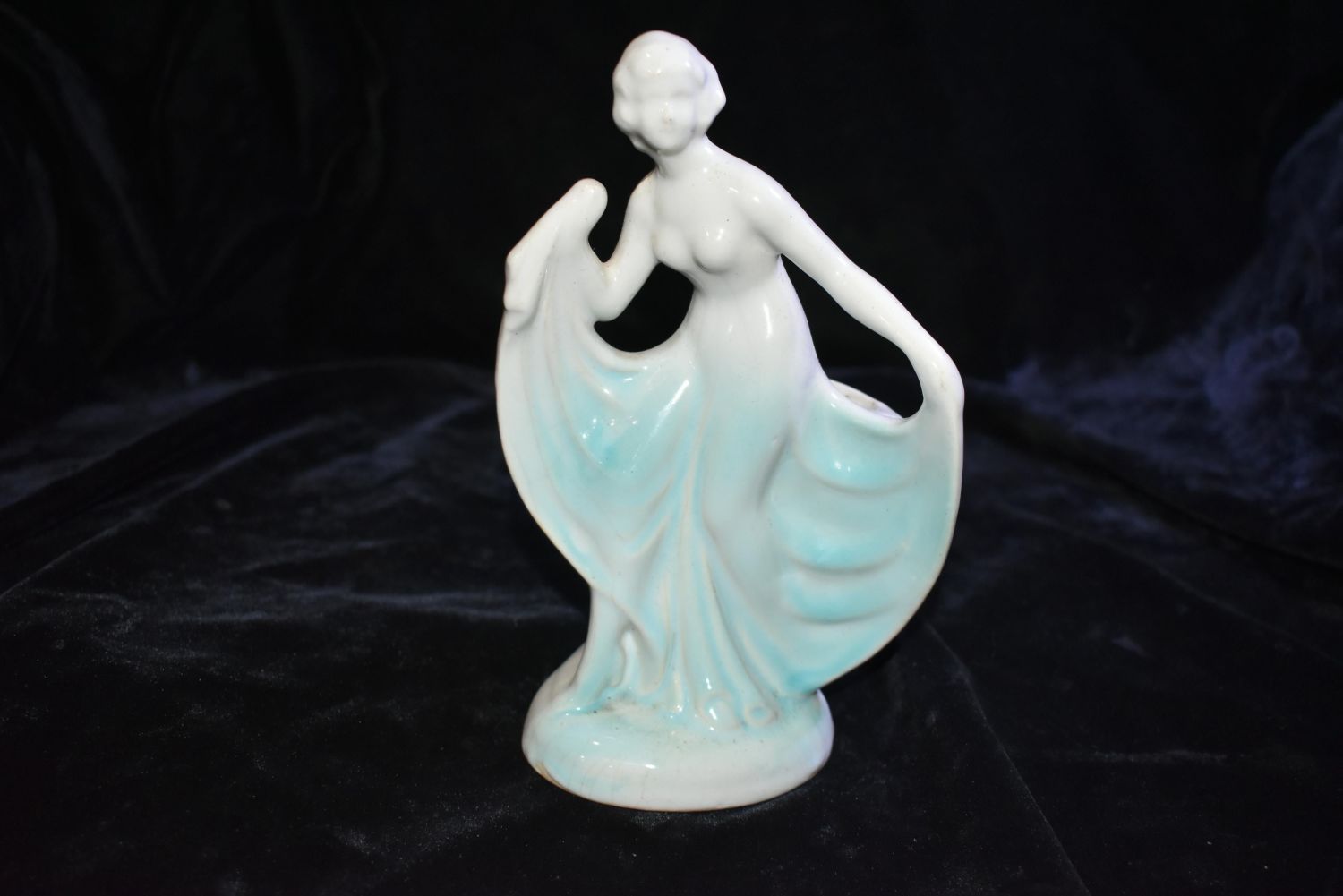 Art Deco Pottery Vase Semi Nude Woman In Skirt 1930s. Good Condition with no chips. Paint faded from time. 8" by 5"