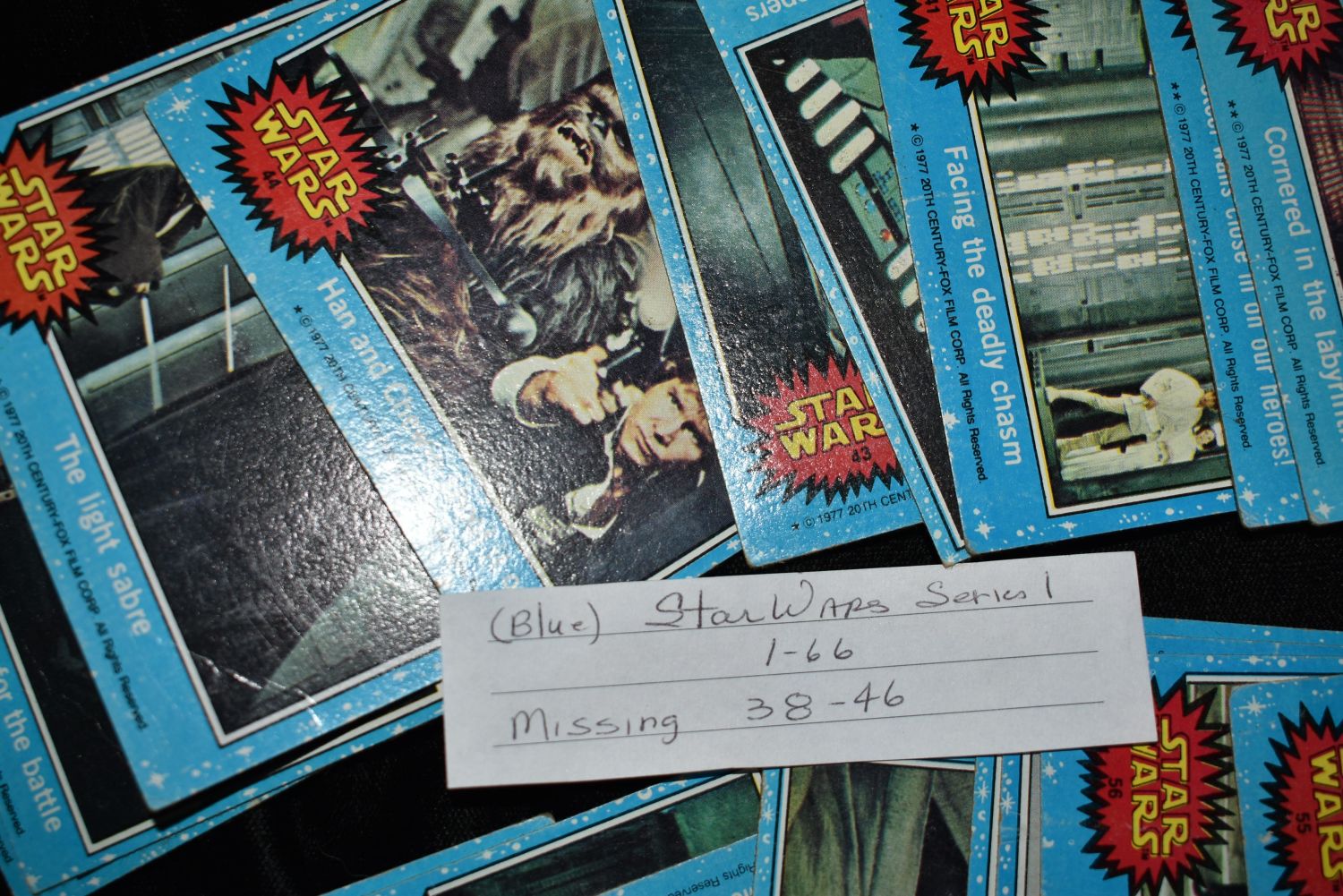 Star Wars Series 1 Collector Cards Cards 1- 66 missing 38 and 46. All in good to excellent condition. Cards are 3 1/2" by 2 1/2"