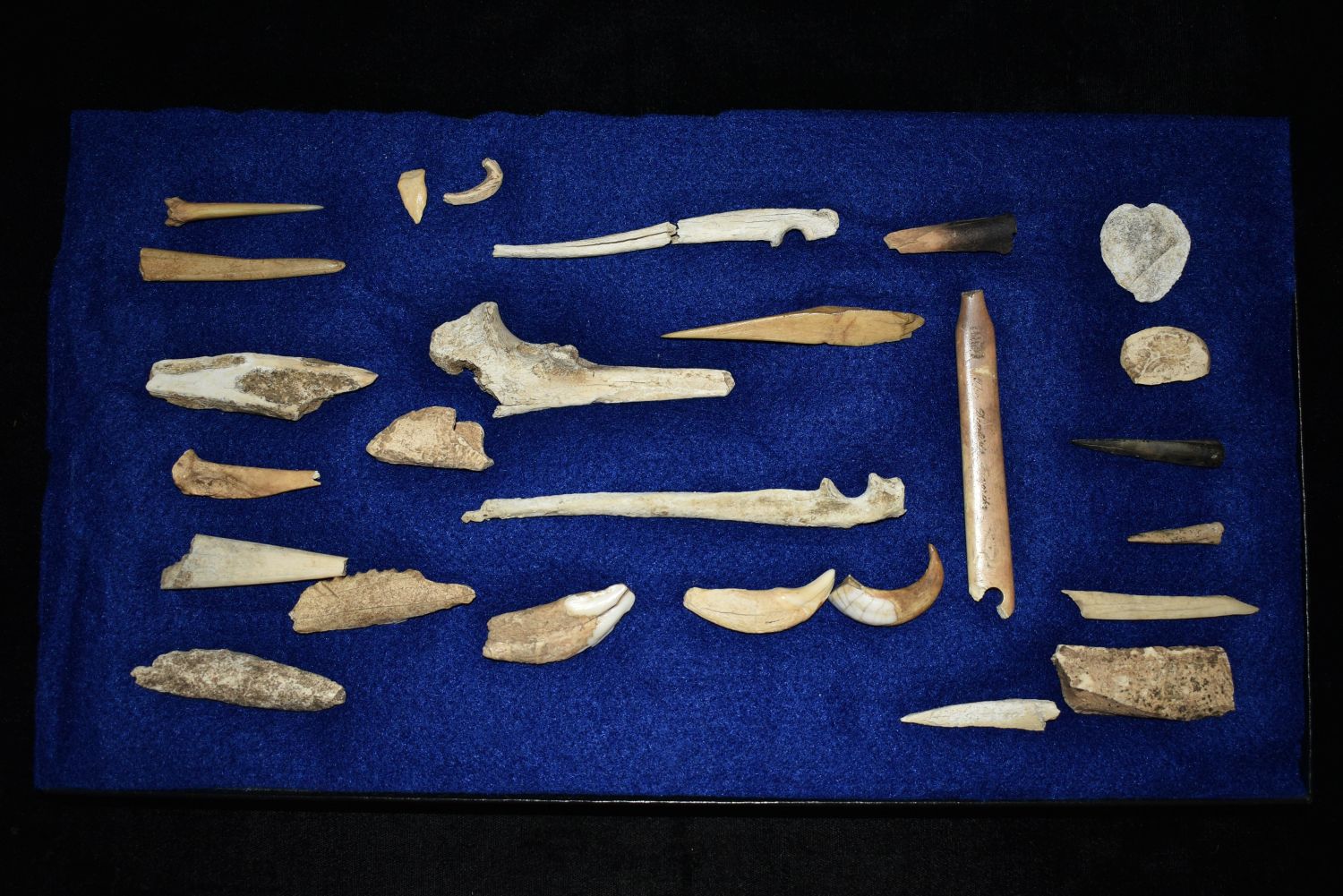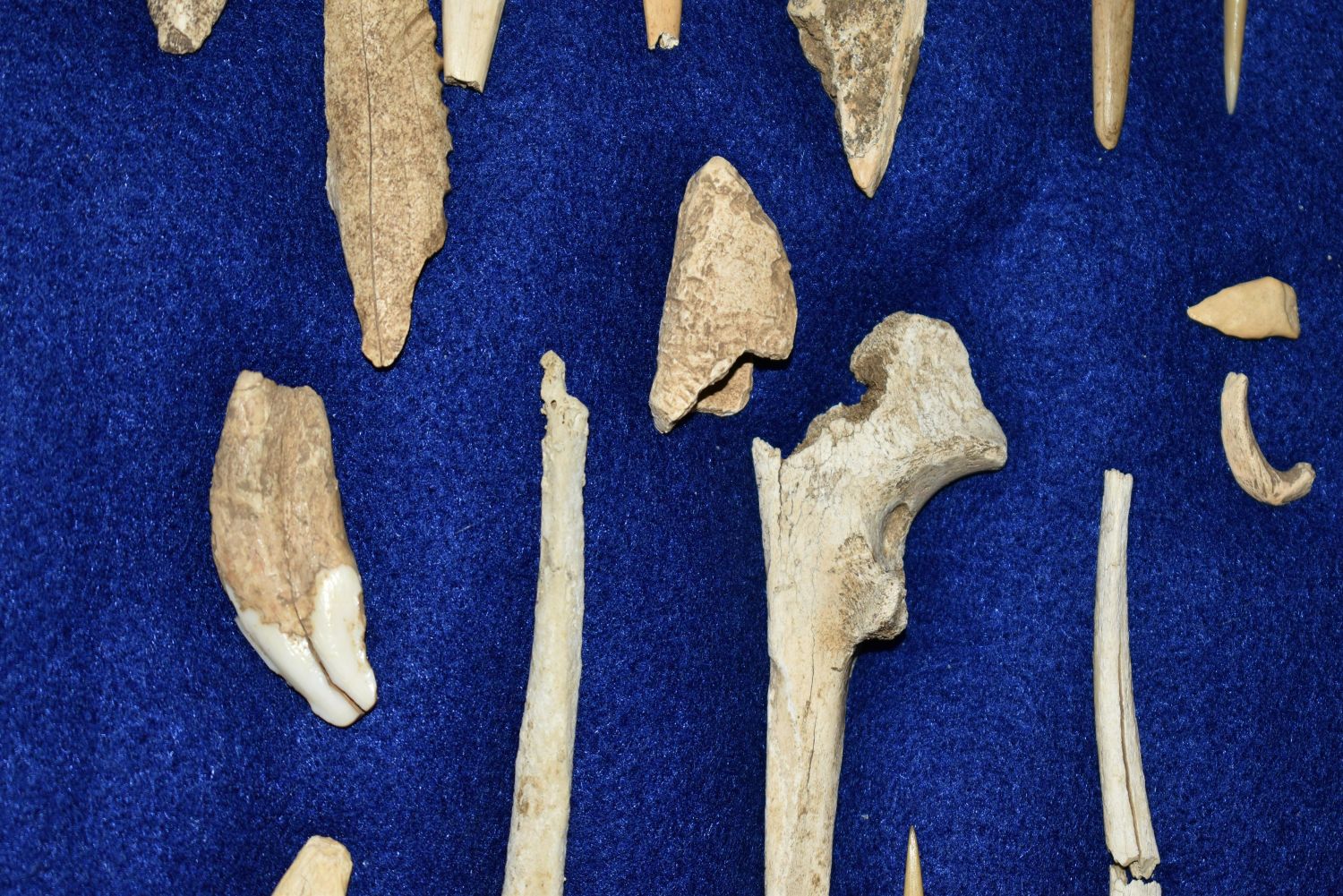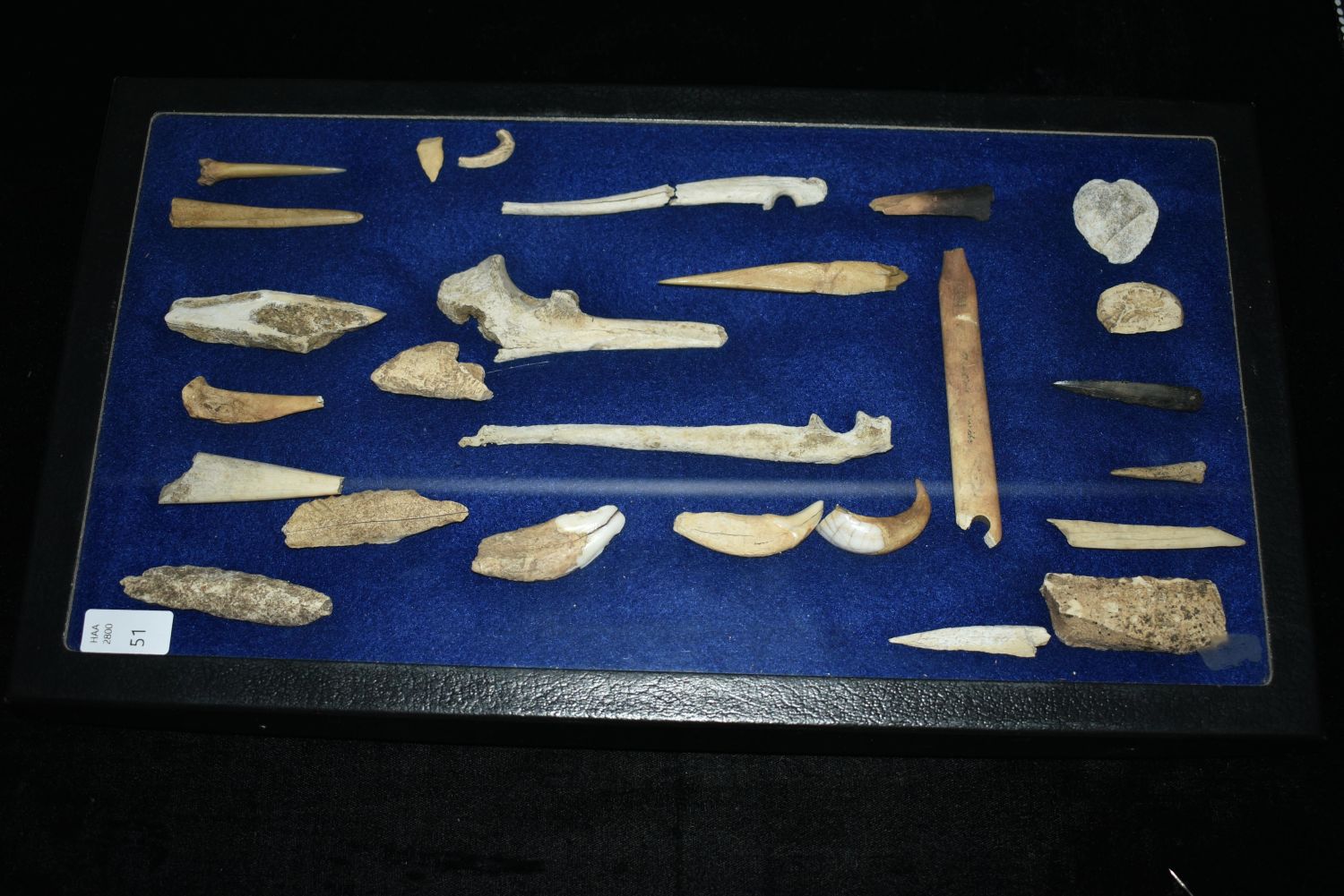 12″ x 8″ Frame Containing 12 Bone/Shell Pieces and 13 Copper Artifacts found by Steve Koch in Scott Co., Illinois Authentic Native American Arrowhead