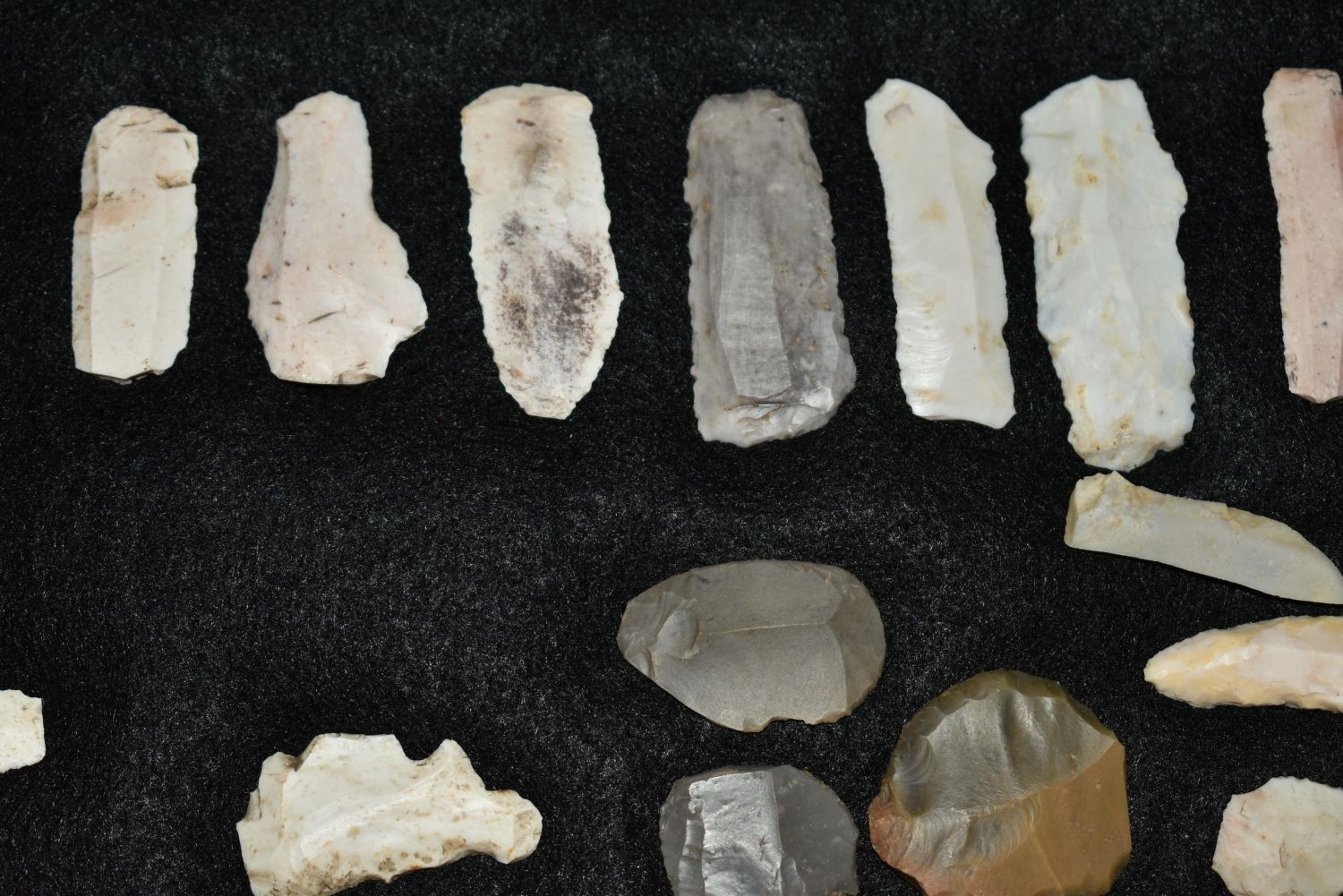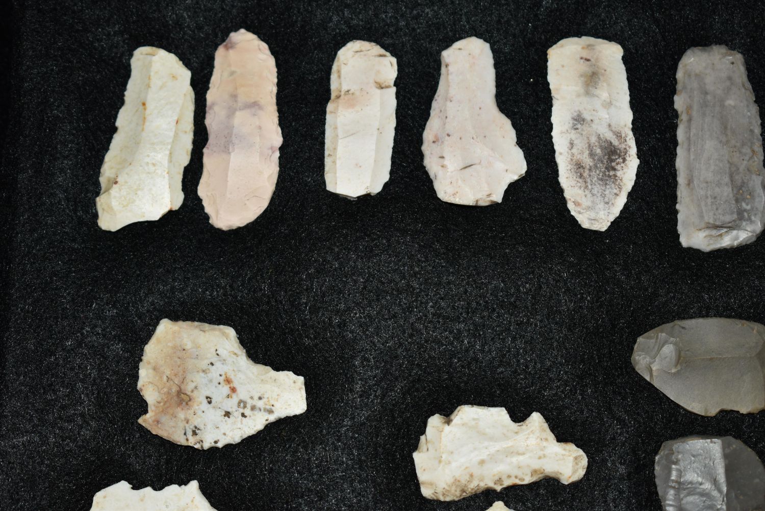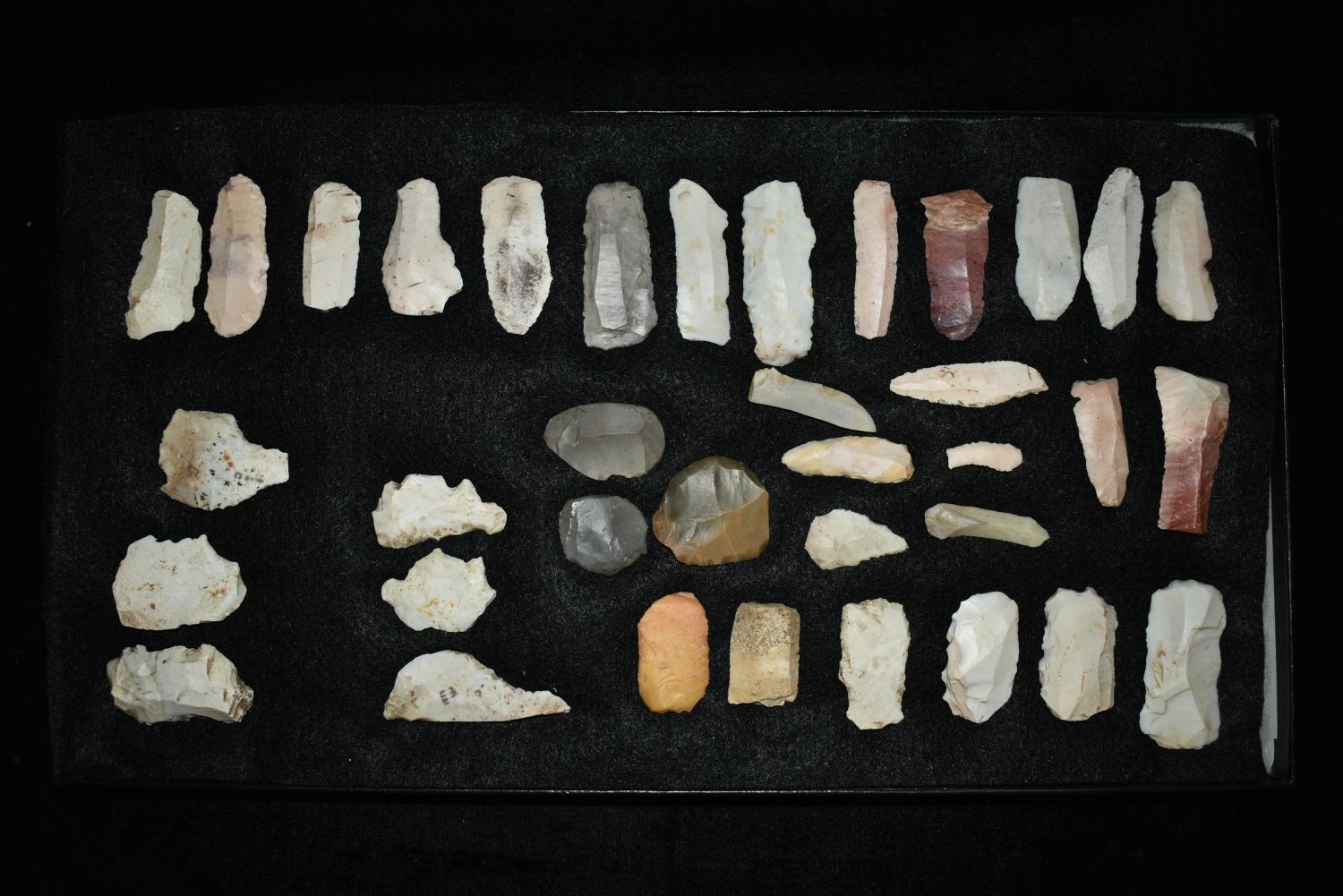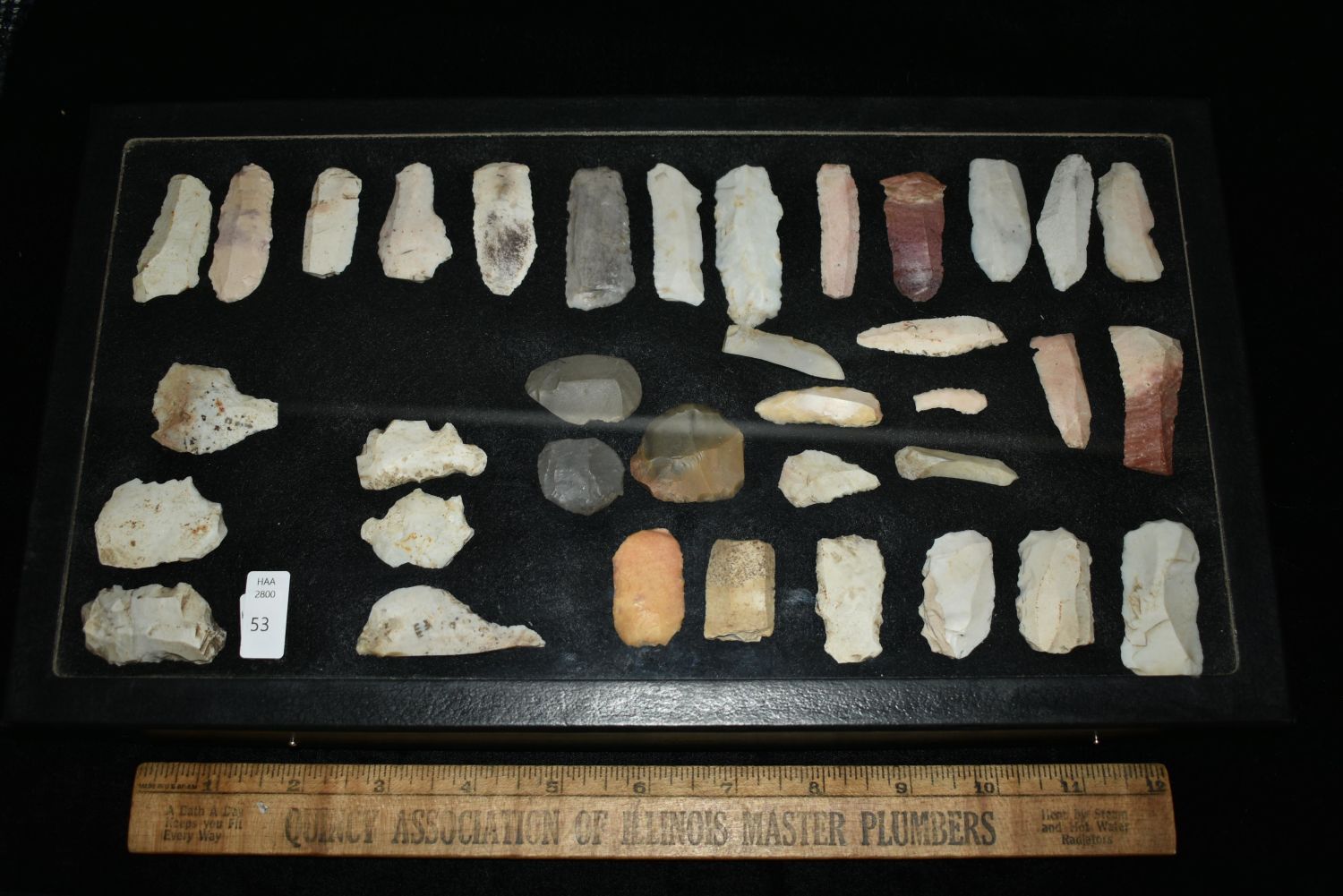14 1/2″ x 8 1/4″ Frame Containing 36 Paleo Flake Knives, Effigys and Disc’s found by Steve Koch in Scott Co., Illinois, Very Nice Display Authentic Native American Arrowhead