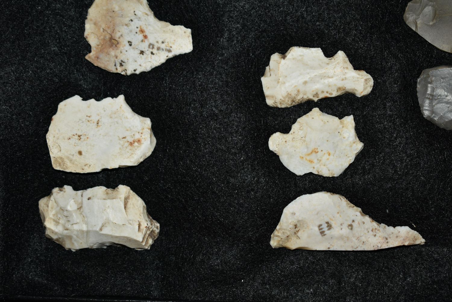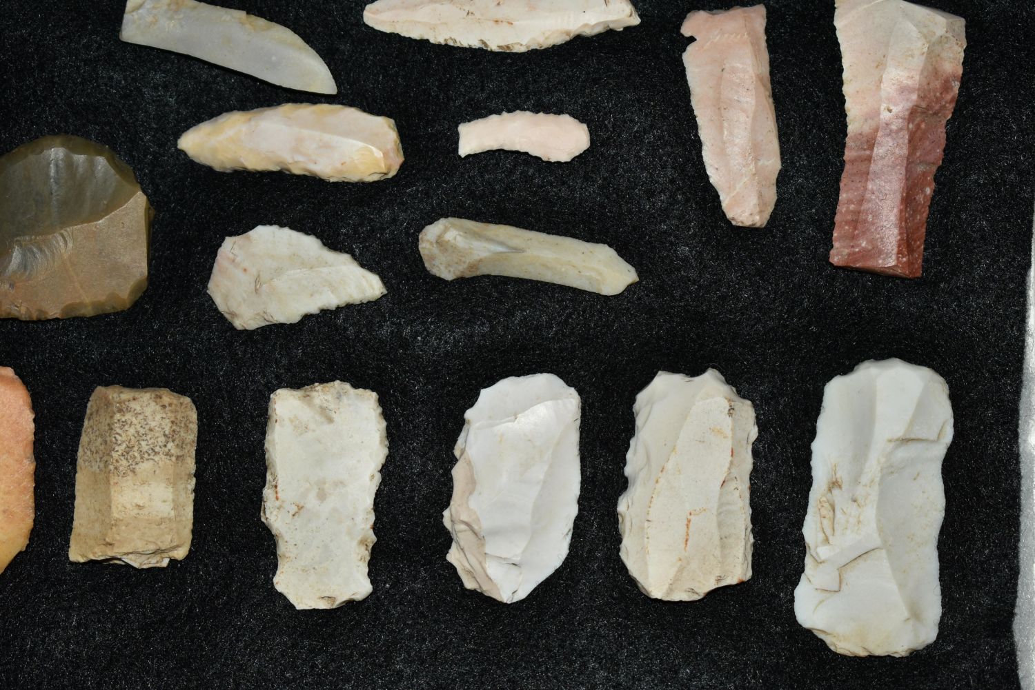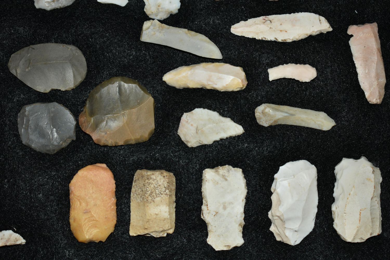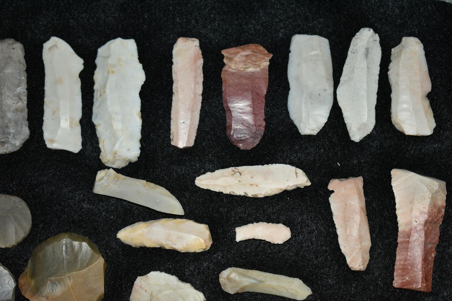 14 1/2″ x 8 1/4″ Frame Containing 36 Paleo Flake Knives, Effigys and Disc’s found by Steve Koch in Scott Co., Illinois, Very Nice Display Authentic Native American Arrowhead