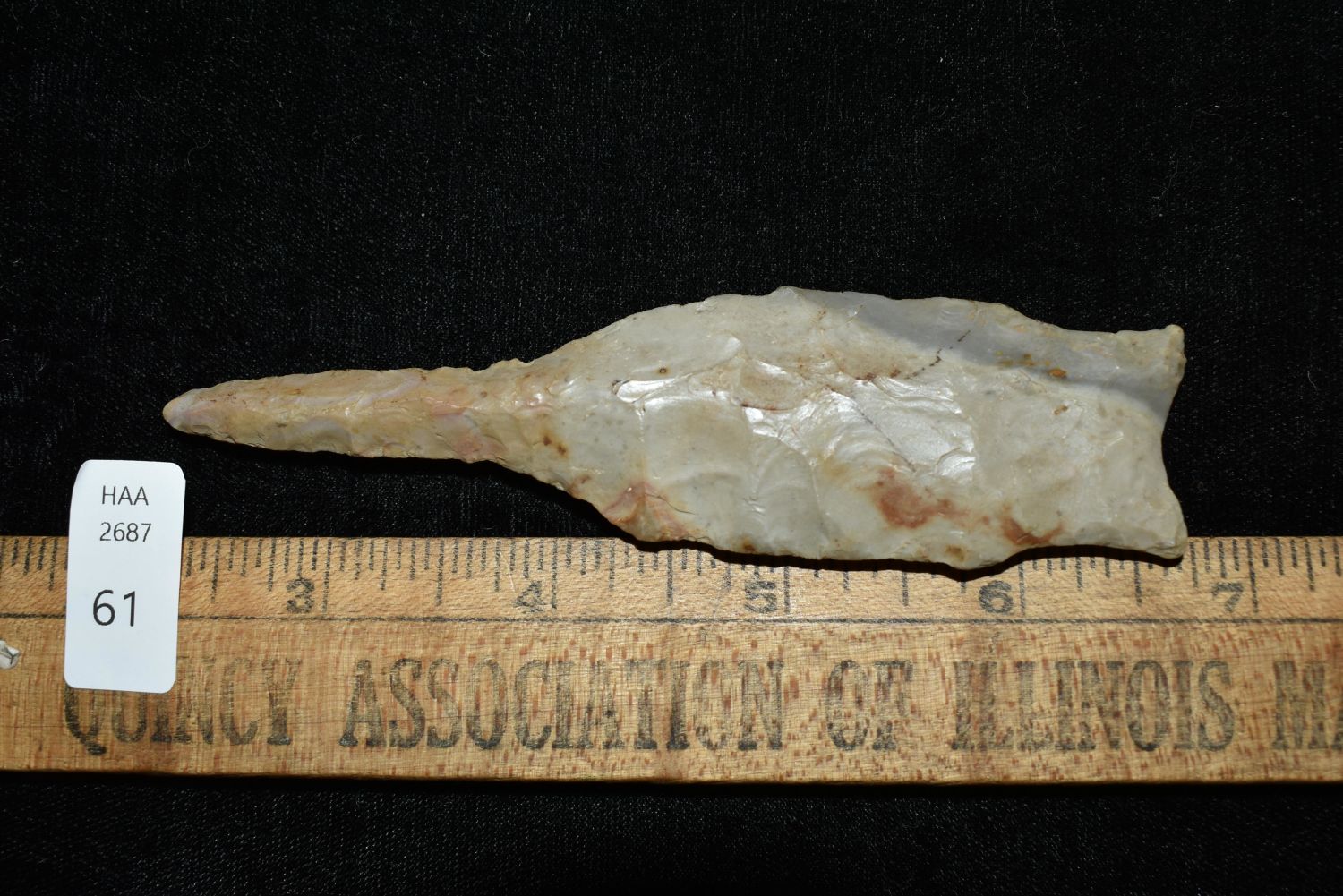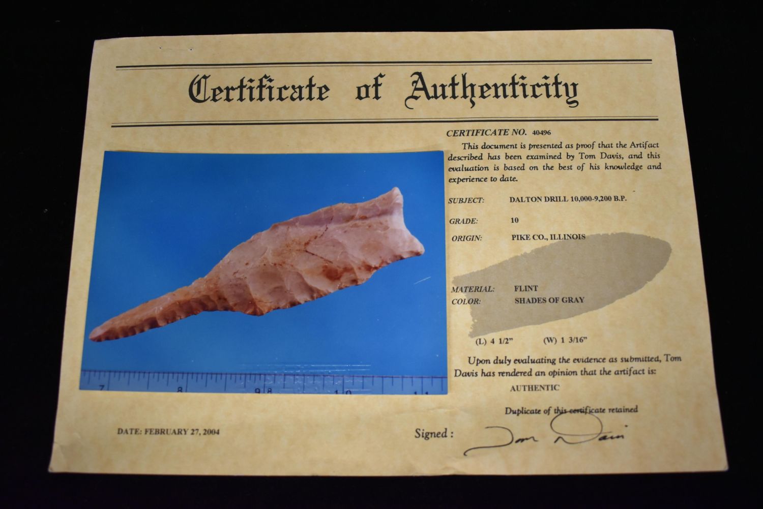 4 1/2″ Dalton Drill found in Pike Co., Illinois, Davis COA, Ex. Nick Gatses Authentic Native American Arrowhead