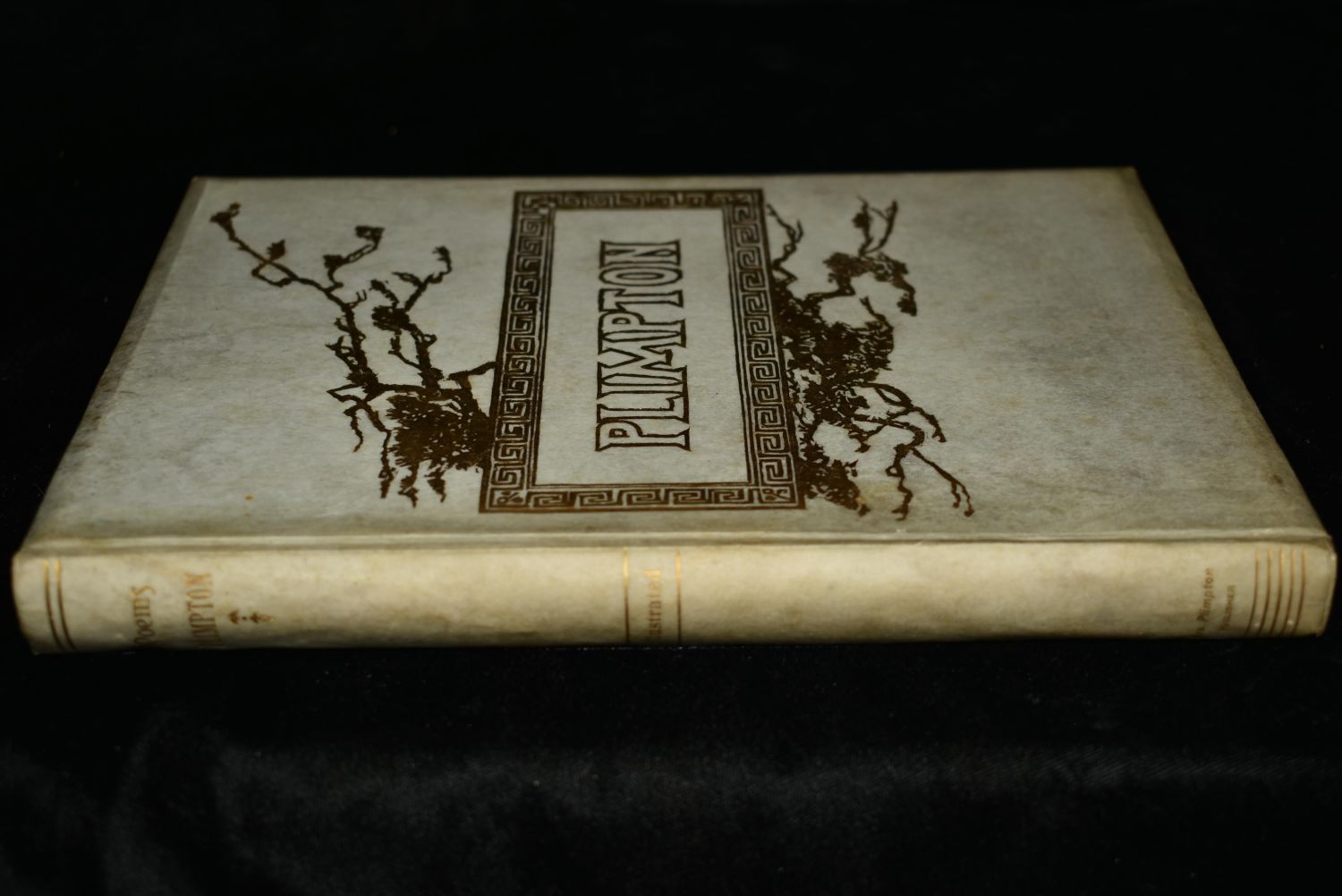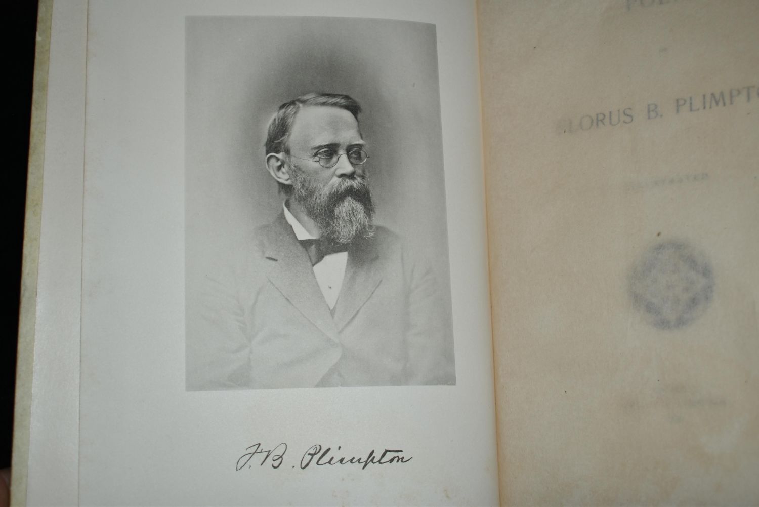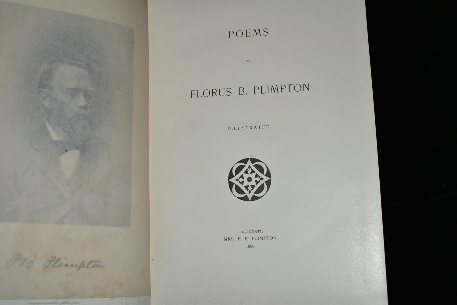 Poems of Florus B. Plimpton by Florus B. Plimpton. Published by Mrs. F. B. Plimpton, Cincinnati, OH (1886). Very Fancy Original publishers hardback with vellum (I think) cover and gold gilt to spine and cover. Tapered boards all around. Age toning to cover otherwise very good condition. Many illustrative pictures throughout the book related to the poetry. 156 pages plus memoir/introduction. 9 5/8" by 6 3/4"