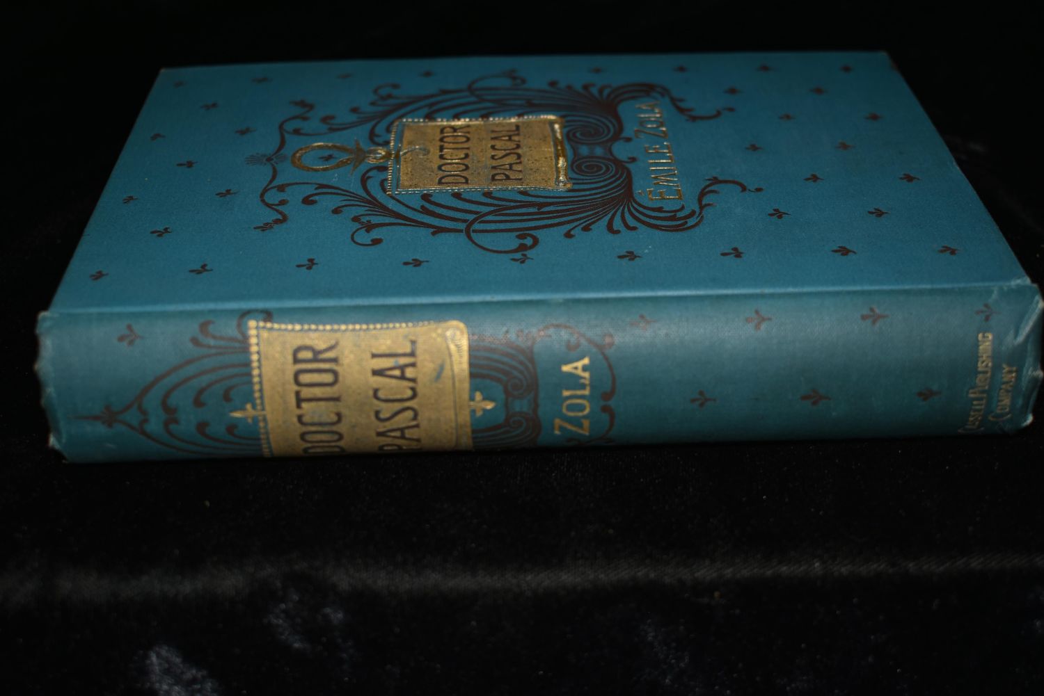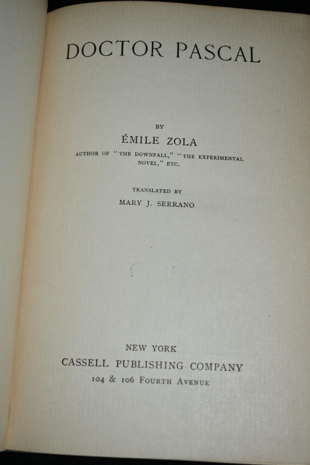 Doctor Pascal by Emile Zola. Published by New York, Cassell Publishing Company (1893). 1st Edition. Publishers original blue cloth hardback with gold and brown print. Very Good + Condition. Minor shelf wear. 471 pgs plus adds. 7 1/2" by 5 3/8"