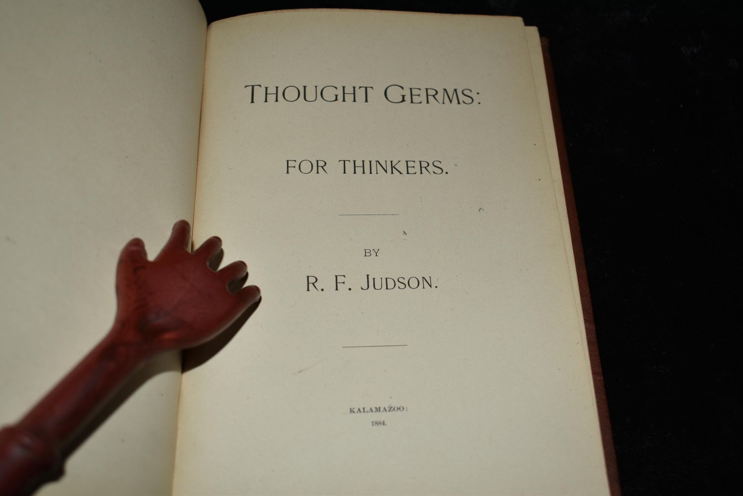 Thought Germs for Thinkers by R. F. Judson. Published by Kalamazoo 1884. Very Rare 1st Edition Book. Worldcat shows 2. Publishers original brown cloth hardback with gold gilt to spine and front cover. Has a little damage to lower spine and a cut on front cover to the left of title as shown in photo. A good amount of shelf wear and staining to cover. Internally very good +. 148 pgs 7 3/4" by 5 5/8"