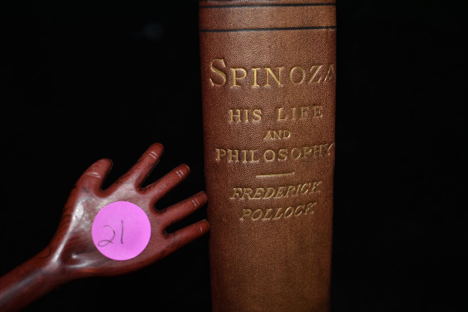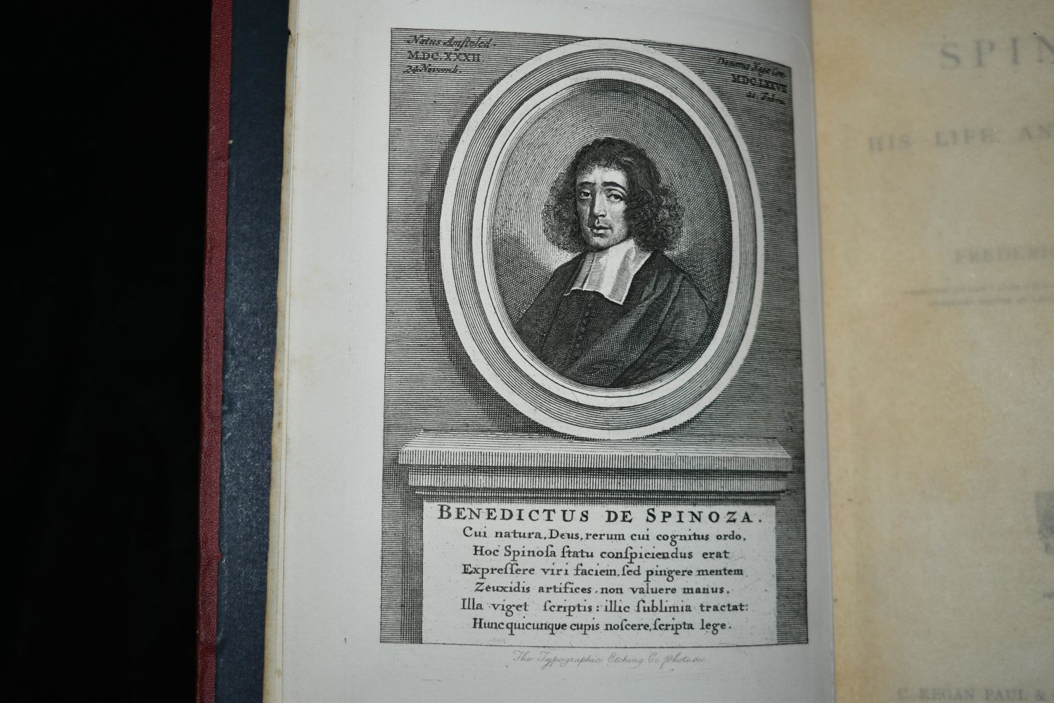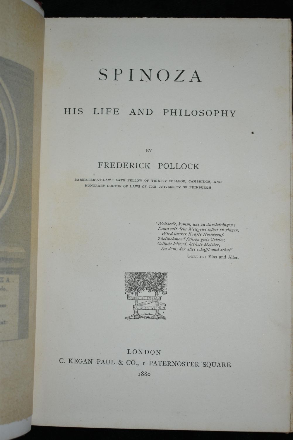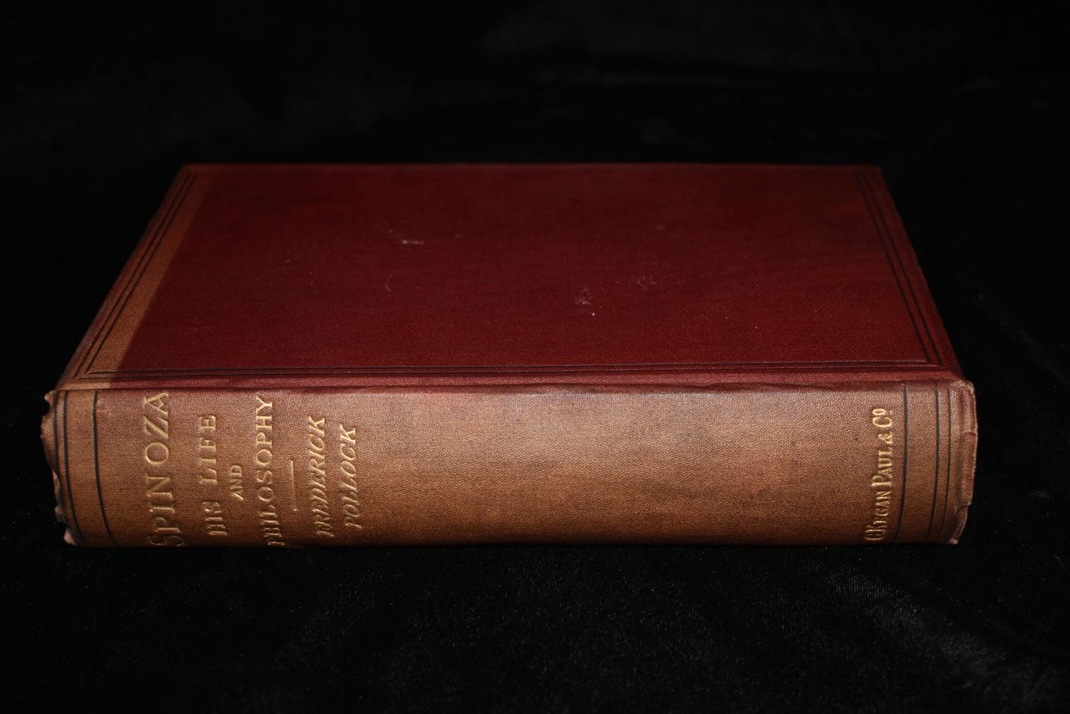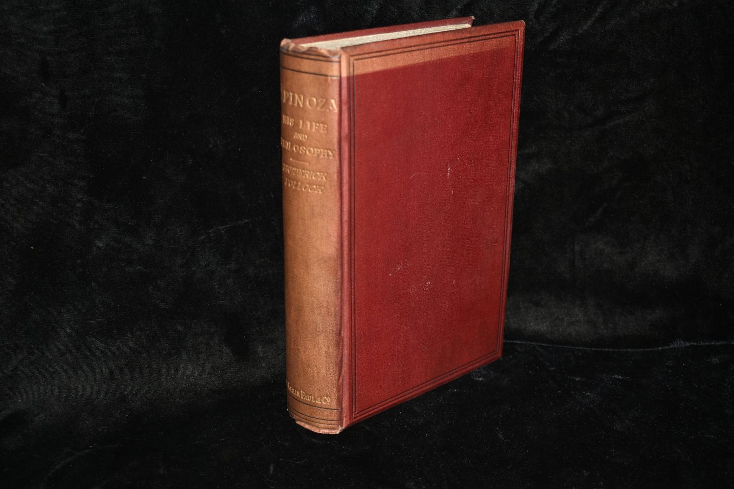Spinoza: His Life And Philosophy by Sir Frederick Pollock. Published by C. Kegan Paul & Co, London (1880). 1st Edition Original Publishers embossed red cloth hardback with gold print. Good Condition. Has some shelf wear and a little page edge tattering. 467 pgs 9" by 6 1/8"