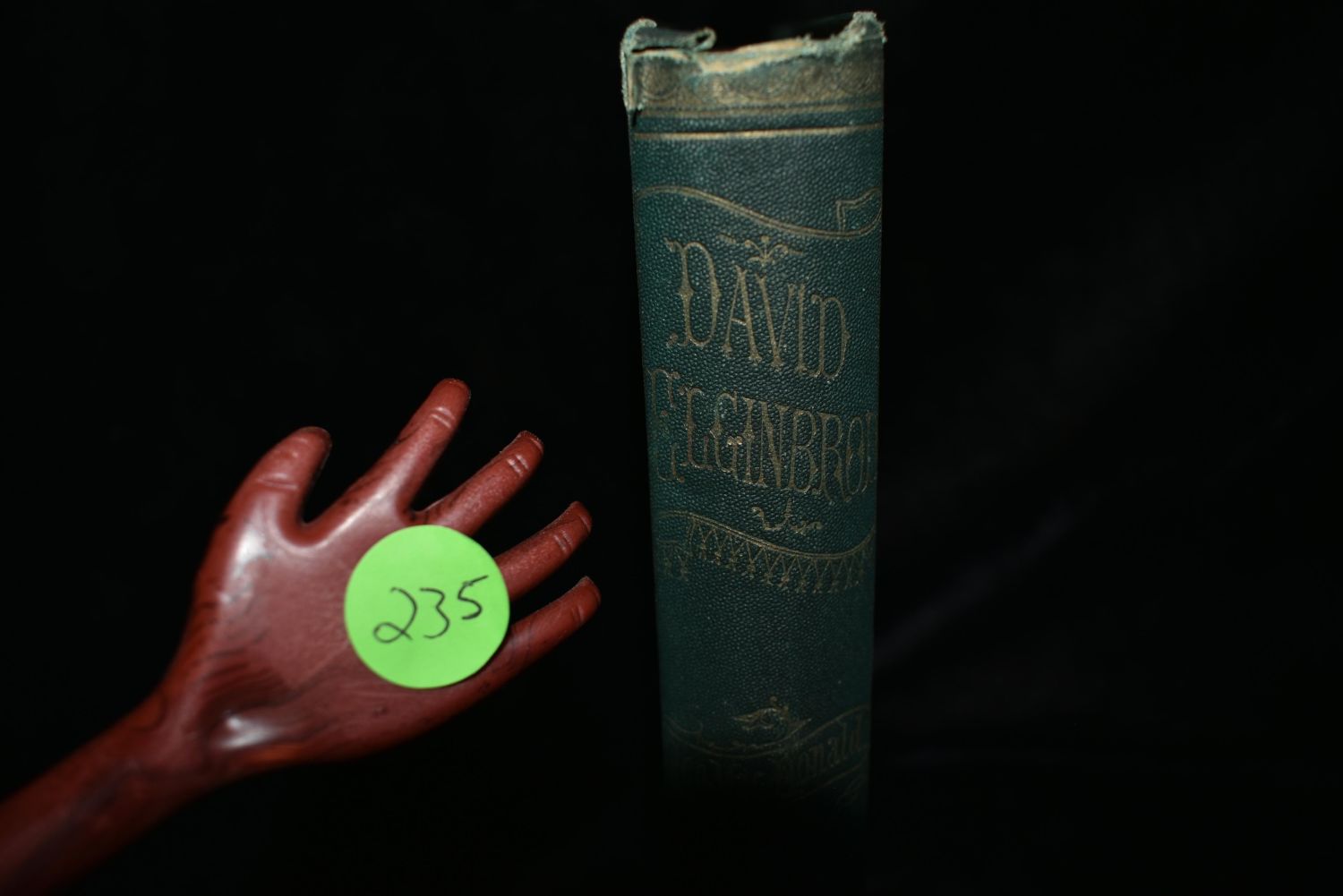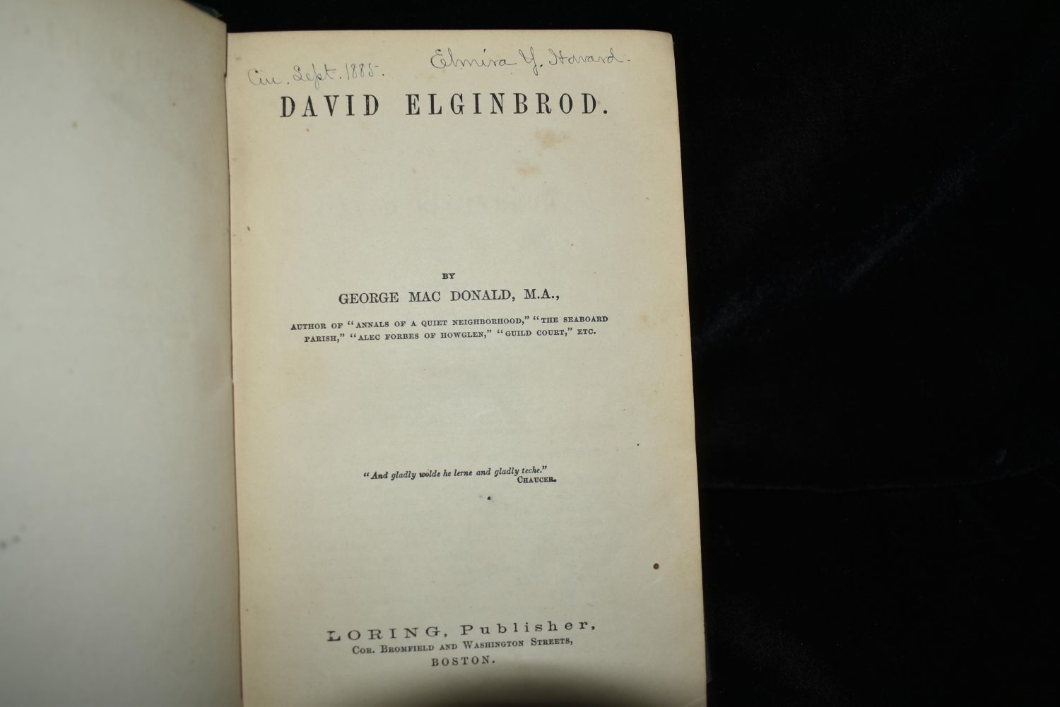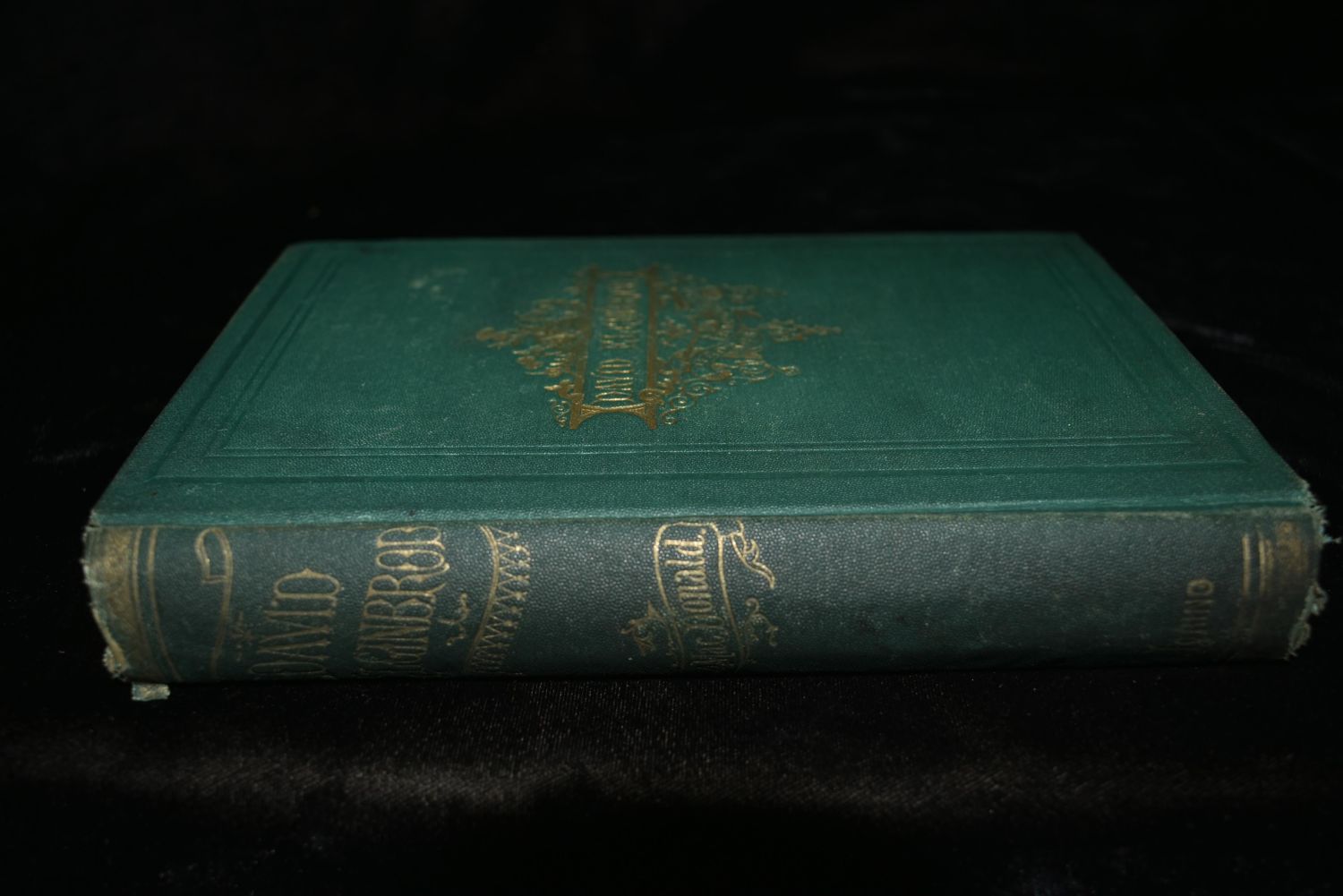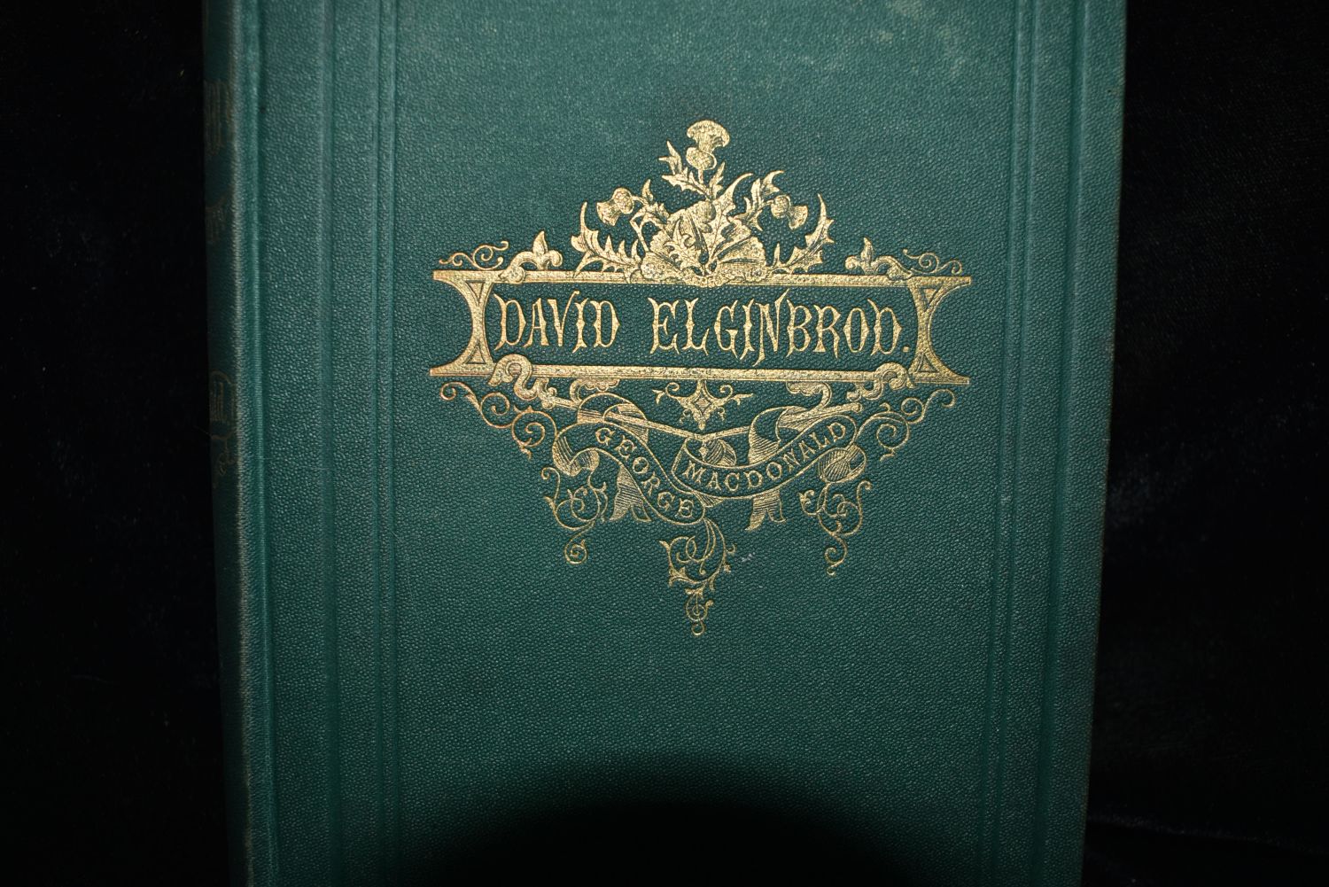 David Elginbrod by George MacDonald. Published by Loring in Boston either 1870 or 1872. Publishers original green cloth hardback with gold gilt. Good condition. Has shelf wear to corners and top of spine. 459 pgs 8" by 5 1/2"
