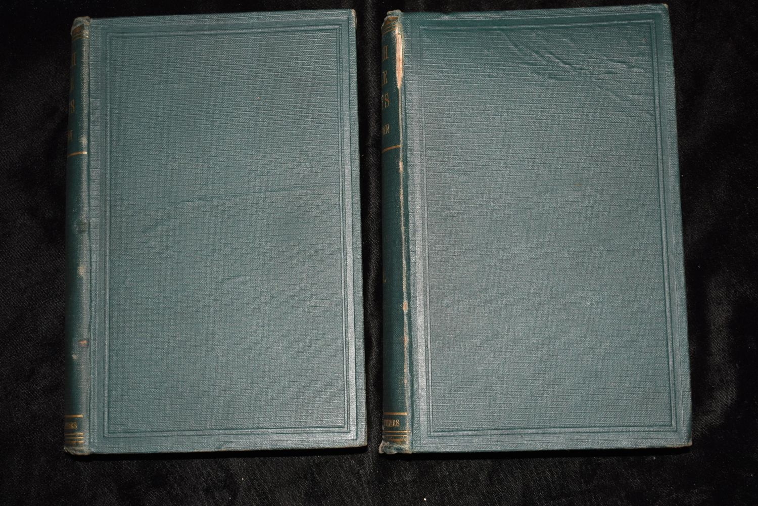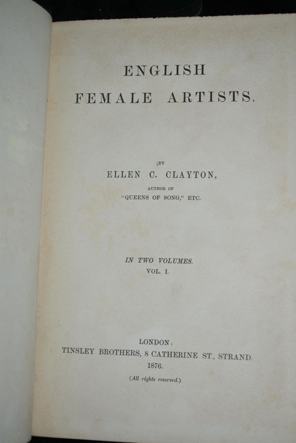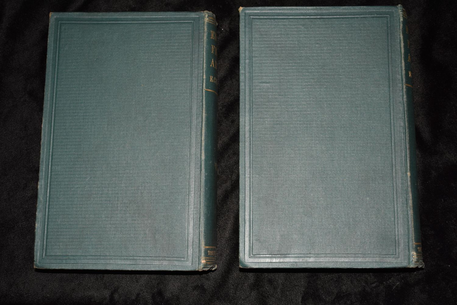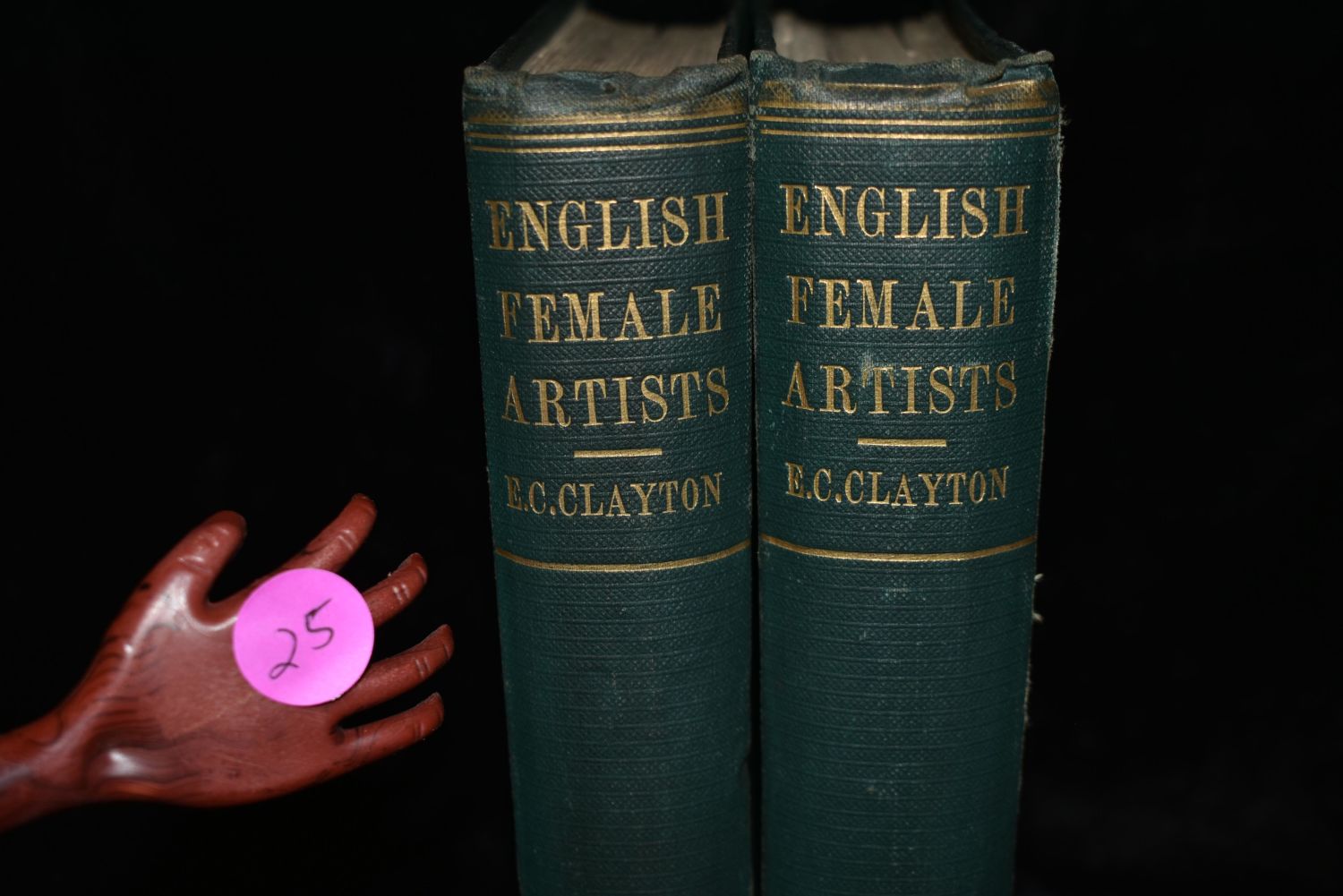 English Female Artists by Ellen C. Clayton. Published by Tinsley Brothers, London (1876). 1st Edition. 2 Volume set. Publishers original green cloth hardbacks with gold print. Good to very good condition. A little shelf wear. Spine on volume 2 has a tare that is about an inch and half on top right (shown in picture). 427 and 438 pgs 8 7/8" by 6"