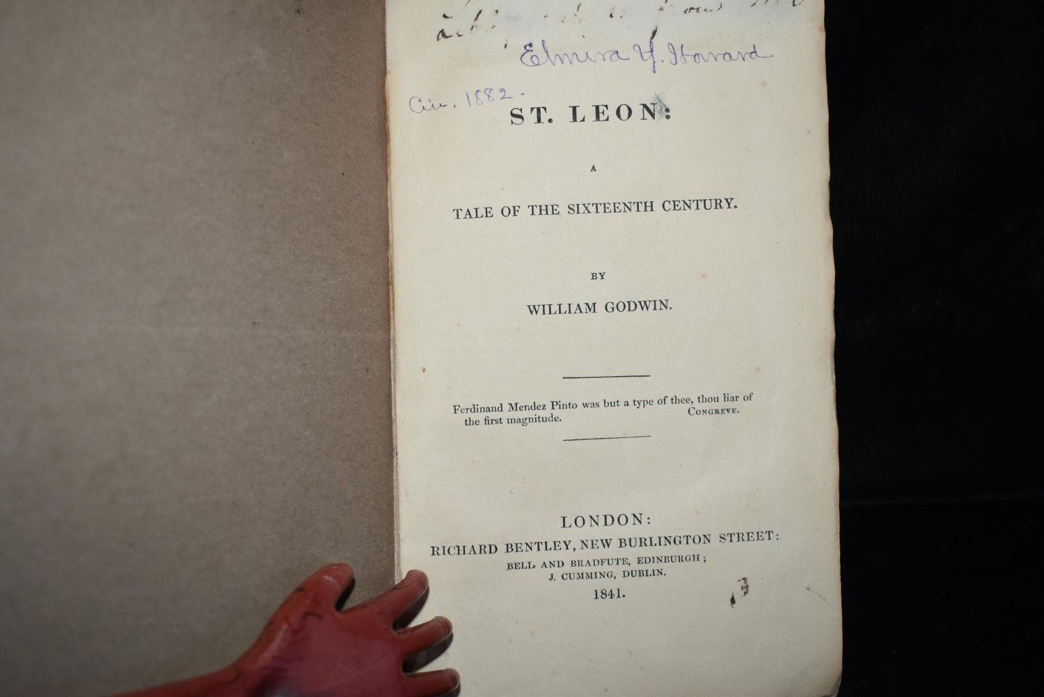 A Tale of the Sixteenth Century by William Godwin. Published by London: Richard Bentley 1841. Very good condition for its age. Shelf wear to corners and top and bottom of spine. Weathered page edges. Publishers original embossed brown cloth hardback with gold gilt to spine. 478 pgs. 7" by 4 1/2"