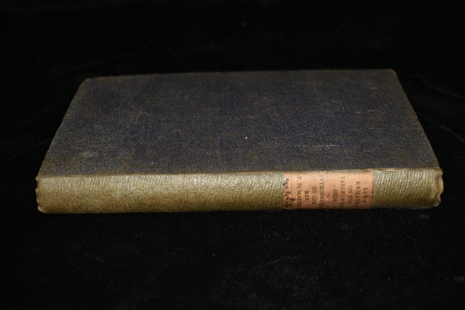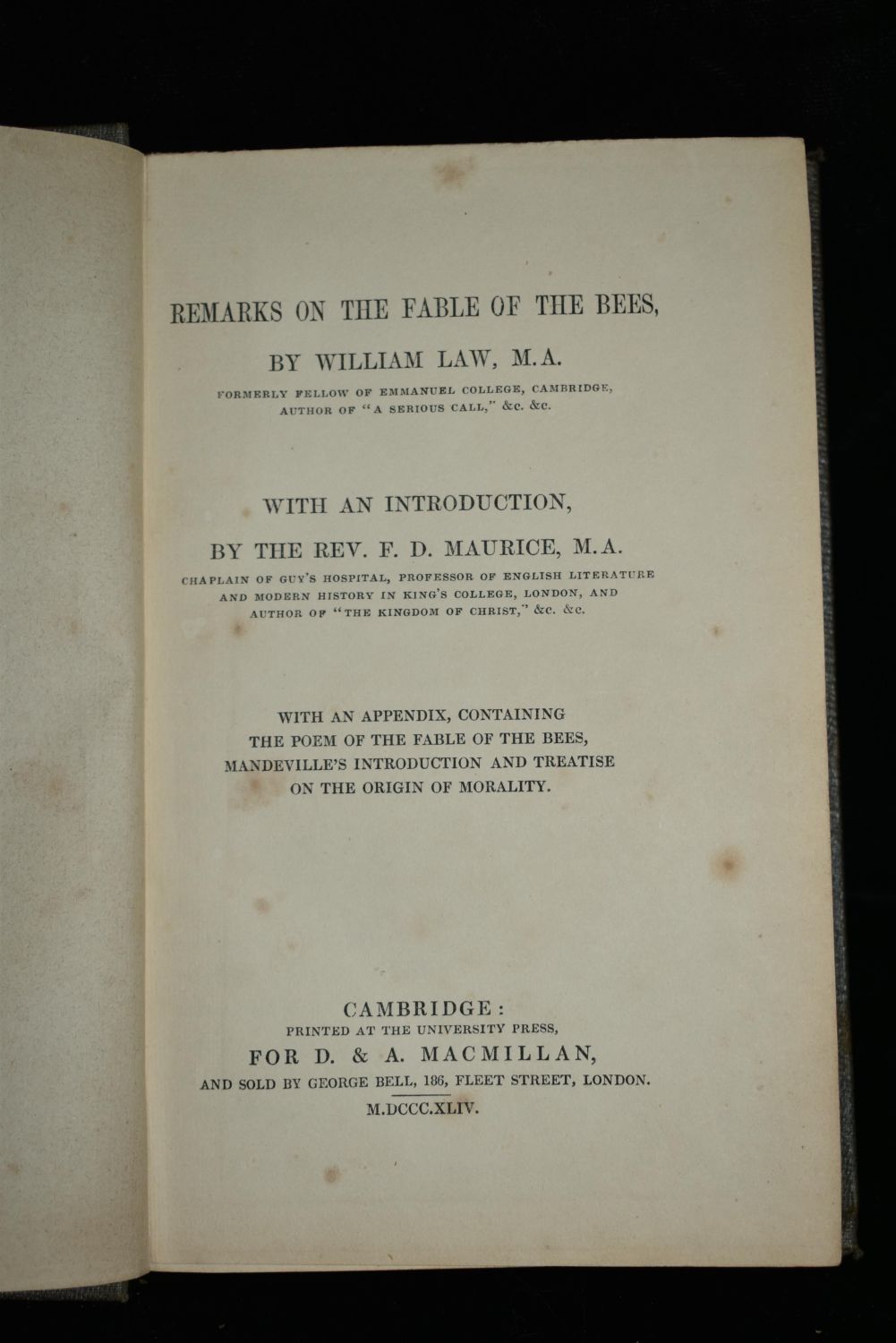 Remarks on the fable of the Bees by William Law, M.A. formerly fellow of Emmanuel College, Cambridge, author of "A serious call, " &c. &c. With an introduction by the Rev. F.D. Maurice, M.A. chaplain of Guy’s Hospital, professor of English literature and modern history in King’s College, London, and author of "The kingdom of Christ, " &c. &c. With an appendix, containing the poem of The fable of the bees, Mandeville’s introduction and treatise on the origin of morality by William Law. Publisher: Cambridge : Printed at the University Press, for D. & A. Macmillan, and sold by George Bell, 186, Fleet Street, London, M. DCCC. XLIV. 1844. Original publishers hardback with brown cloth and name plate. Very Good condition with some use wear to cover and spine. Minor tare .5 inch on spine edge. 130 pgs plus a long introduction and advertisement at the end. 6 7/8" by 4 1/2"