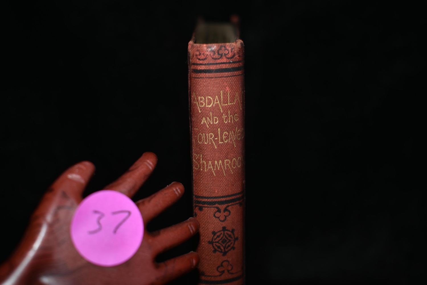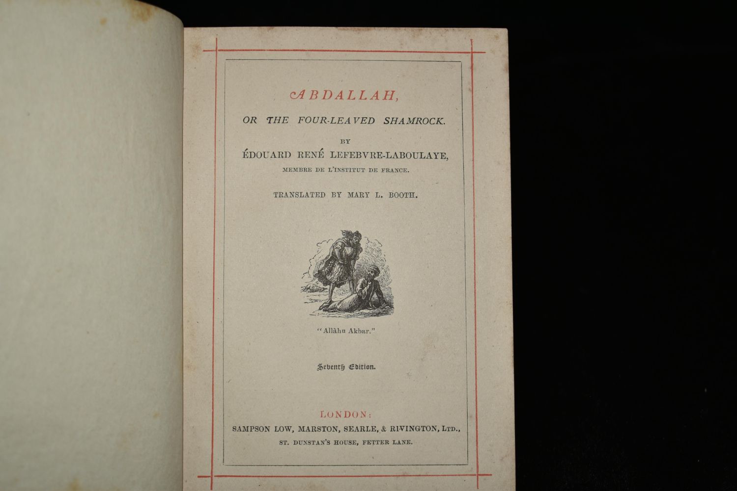 Abdallah, or the Four-Leaved Shamrock by Edouard Rene Lefebvre-Llaboulaye, [trans. By Mary L. Booth]. Published by Sampson Low, Marston, Searle, and Rivington, London, United Kingdom (1881). Publishers original decorative red cloth hardback with gold and black gilt. Gold gilt to all page edges. Excellent condition for its age. 181 pgs 6" by 4 1/2"