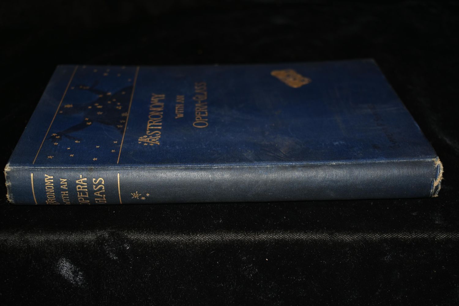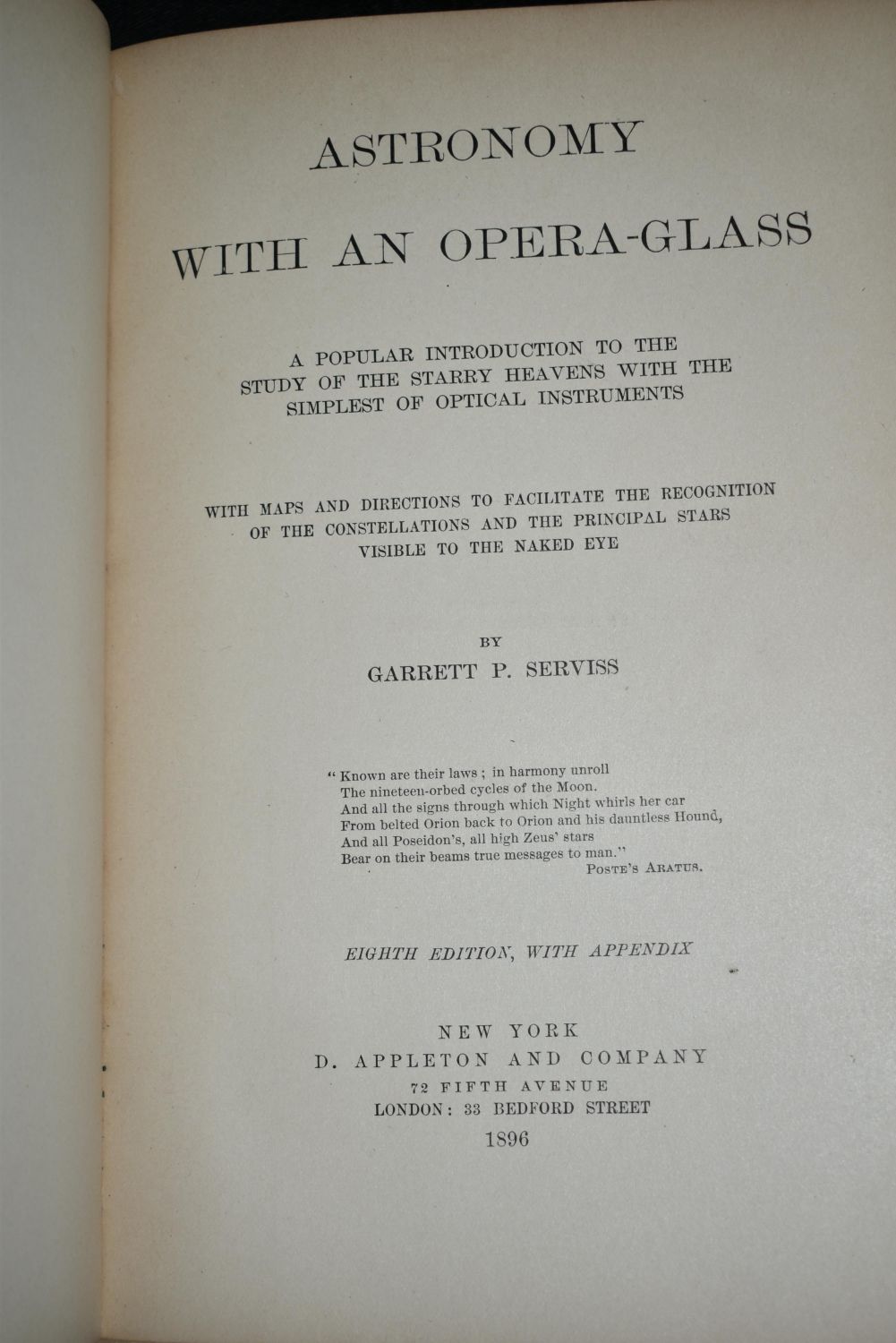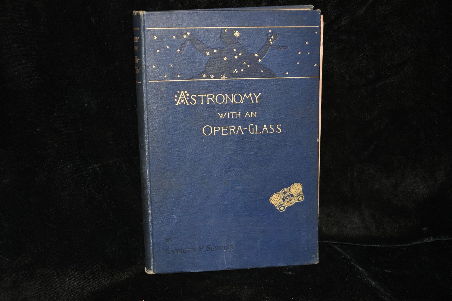 Astronomy with an Opera-Glass by Garrett Serviss, Garrett. Published by Appleton, New York (1896). Good condition for its age. Some shelf wear and age darkening to pages. Publishers original blue cloth hardback with gold gilt to cover and spine. 158 pgs plus ads 9" by 6 1/8"
