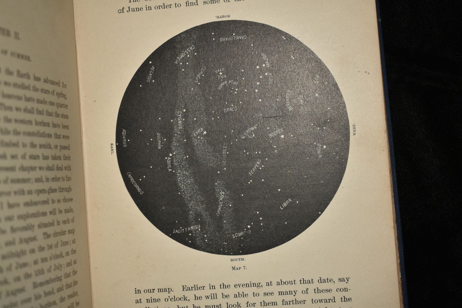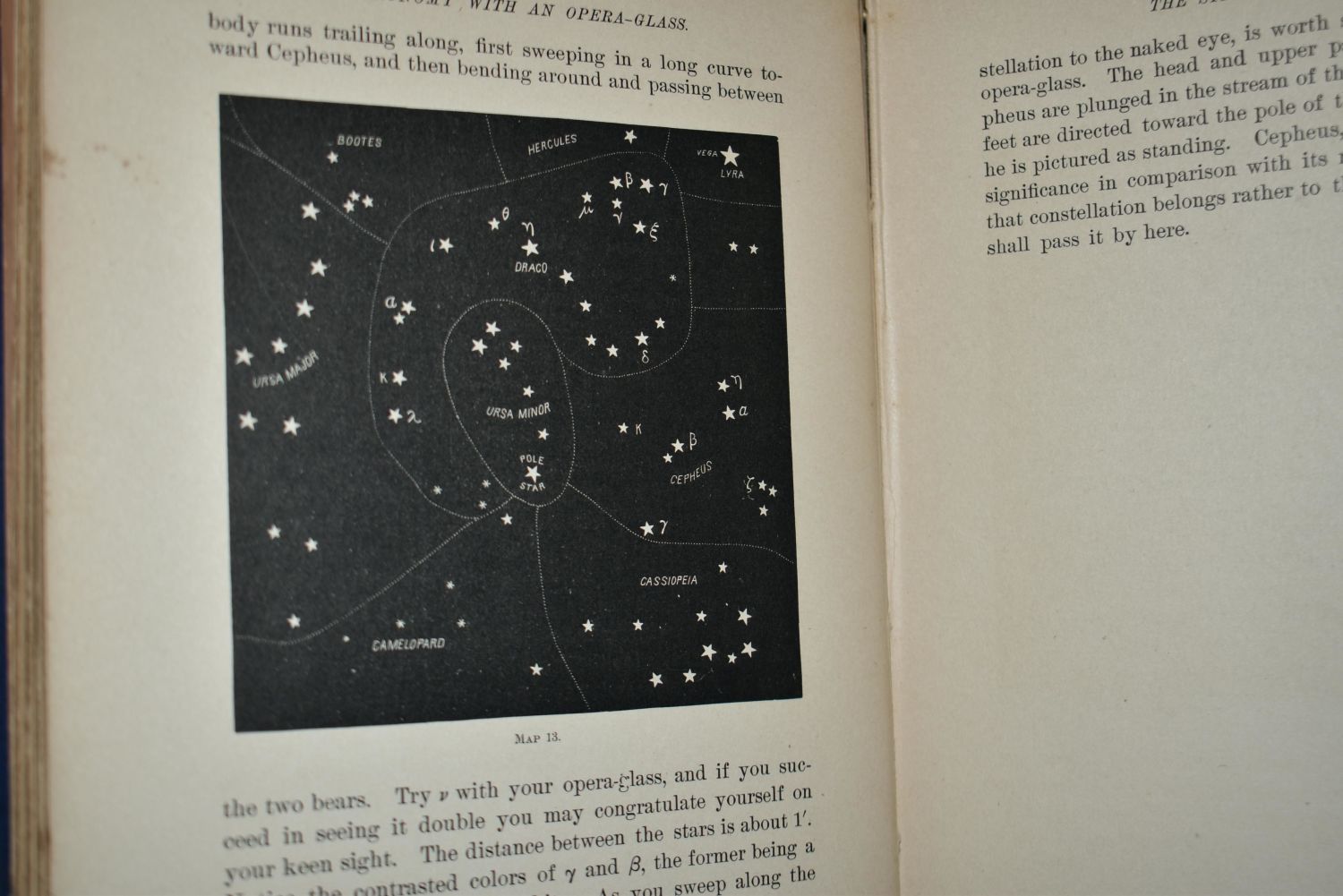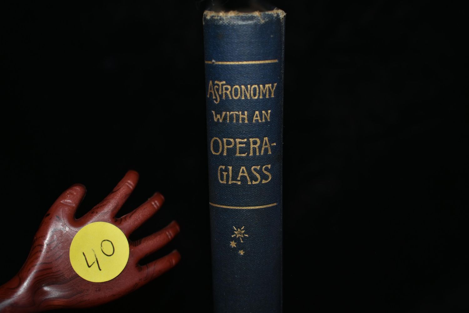 Astronomy with an Opera-Glass by Garrett Serviss, Garrett. Published by Appleton, New York (1896). Good condition for its age. Some shelf wear and age darkening to pages. Publishers original blue cloth hardback with gold gilt to cover and spine. 158 pgs plus ads 9" by 6 1/8"