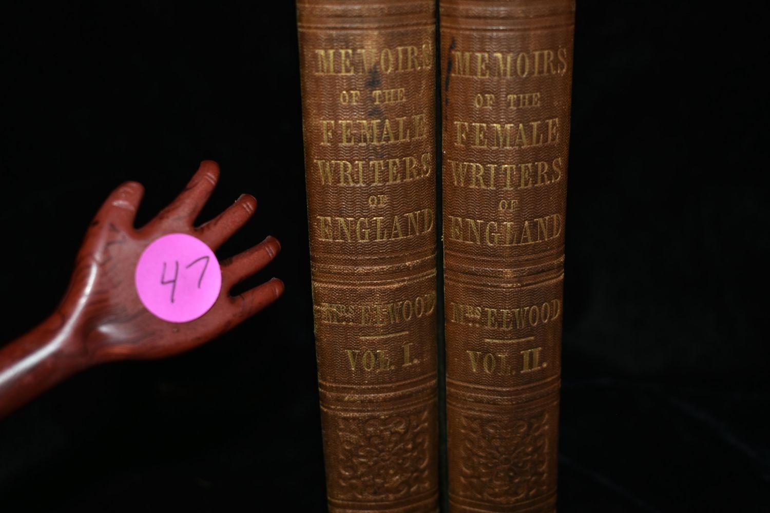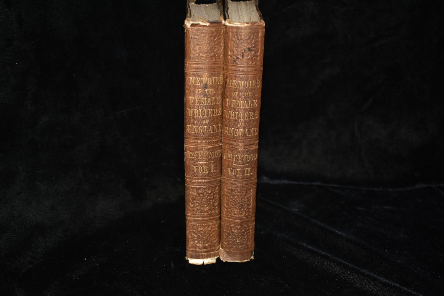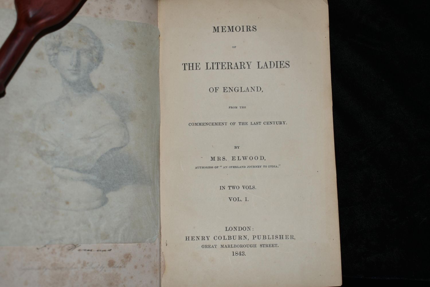 Memoirs of the Literary Ladies of England, from the Commencement of the Last Century by Anne Katharine Curteis Elwood. Published by London: Henry Colburn 1843. 1st Edition. 2 Volume set. Couldn’t find an old copy of this on the web. Worldcat shows 6 in the possession of libraries in the U.S.. Covers are very worn and they got age spots/foxing commensurate with age. Overall good condition. 347 and 331 pgs. 8 1/8" by 5 1/4"