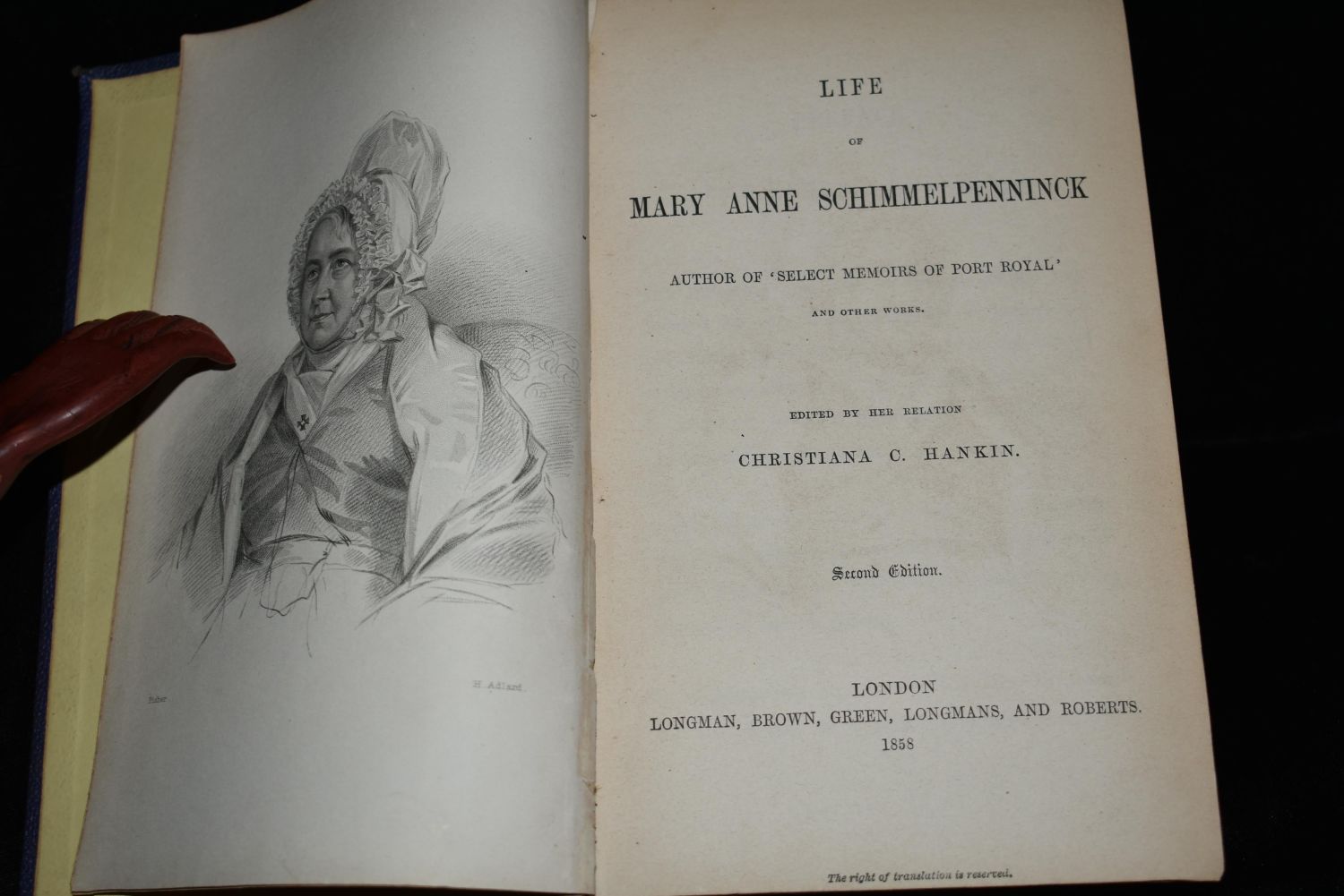 Life of Mary Anne Schimmelpenninck 1858 by Mary Anne Schimmelpenninck edited by her relation Christina Hankin. Published by Longman, Brown, Green, Longmans and Roberts, London 1858. Second addition in the first year of publication. Publishers original purple cloth with gold print to spine. Very good Condition for its age. Minor shelf wear to corners. 548 pgs 7 5/8" by 5 1/8"