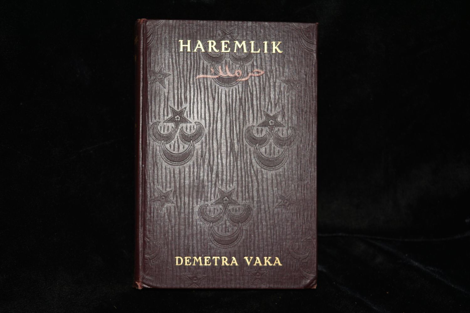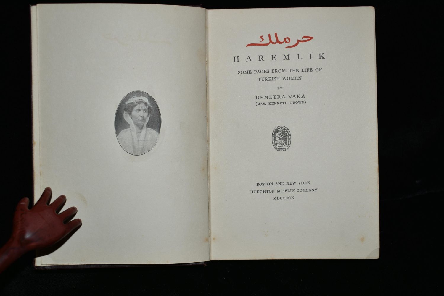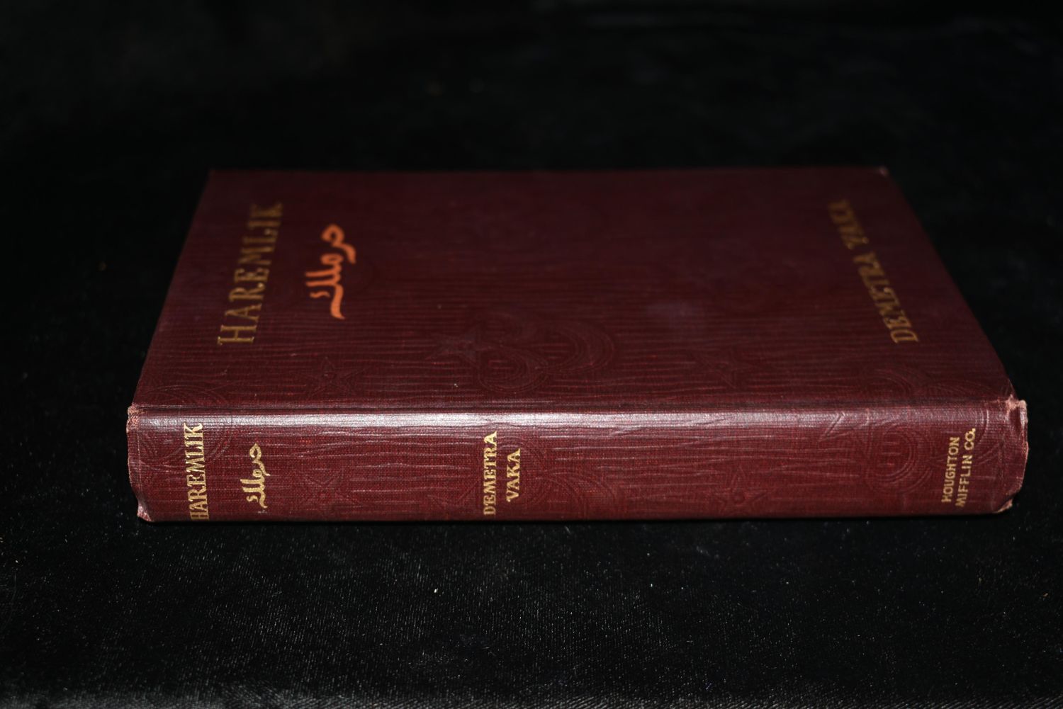 1910 Haremlik – Some Pages from the Life of Turkish Women by Demetra Vaka. Published by Houghton Mifflin Company, Boston and New York (1910). Publishers original embossed red cloth hard back with gold and red print. Very Good Condition. Very minor shelf wear. 275 pgs plus adds. 7 5/8" by 5 1/8"