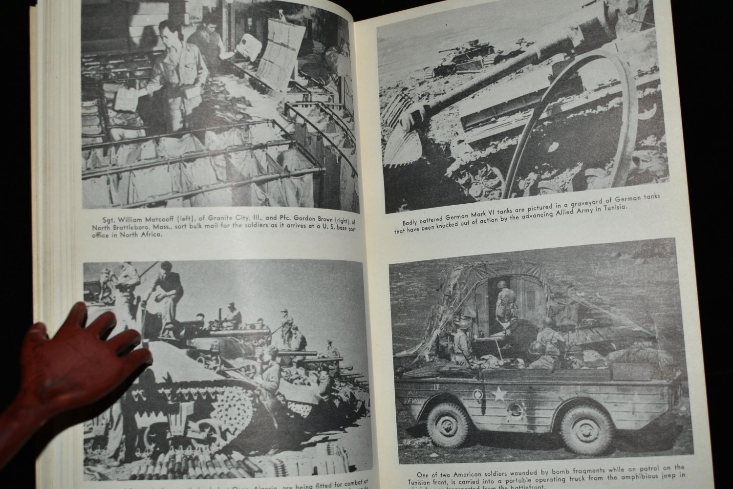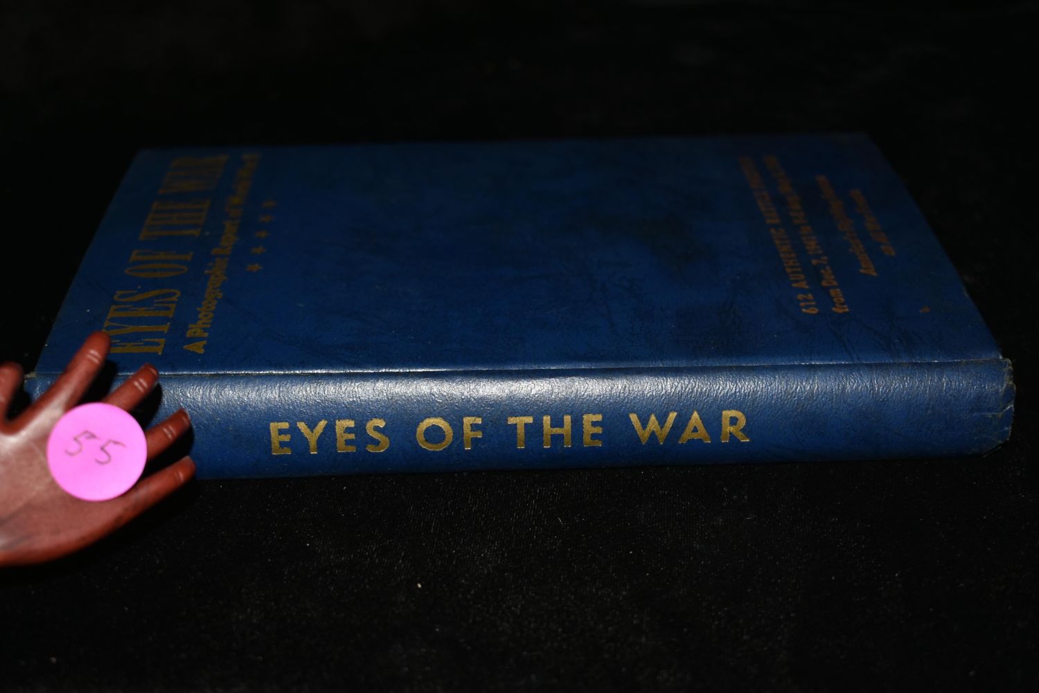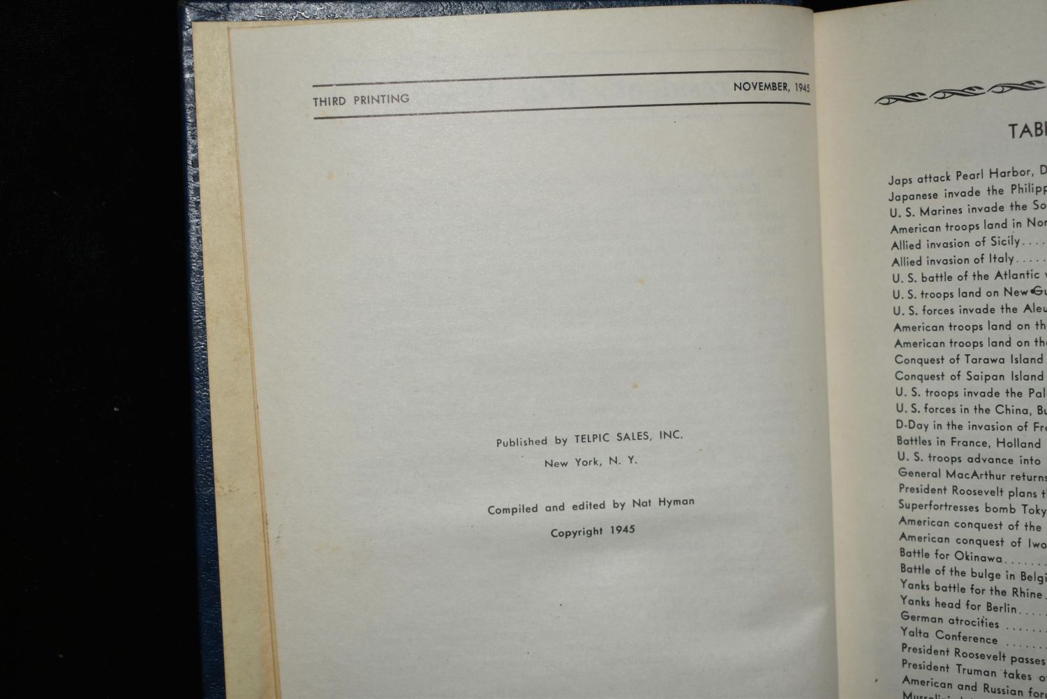 1945 EYES OF THE WAR: A Photographic Report of World War II. 612 Authentic Battle Photos from Dec. 7, 1941 to V-E day, May 8, 1945. America’s Fighting Forces on All War Fronts. Edited by Nat. Hyman. Published by Telpic Sales January 1945. Excellent condition. Loaded with ww 2 photo’s front to back. Original publishers blue cloth hardback with gold print. 313 pgs 8 1/2" by 5 1/2"
