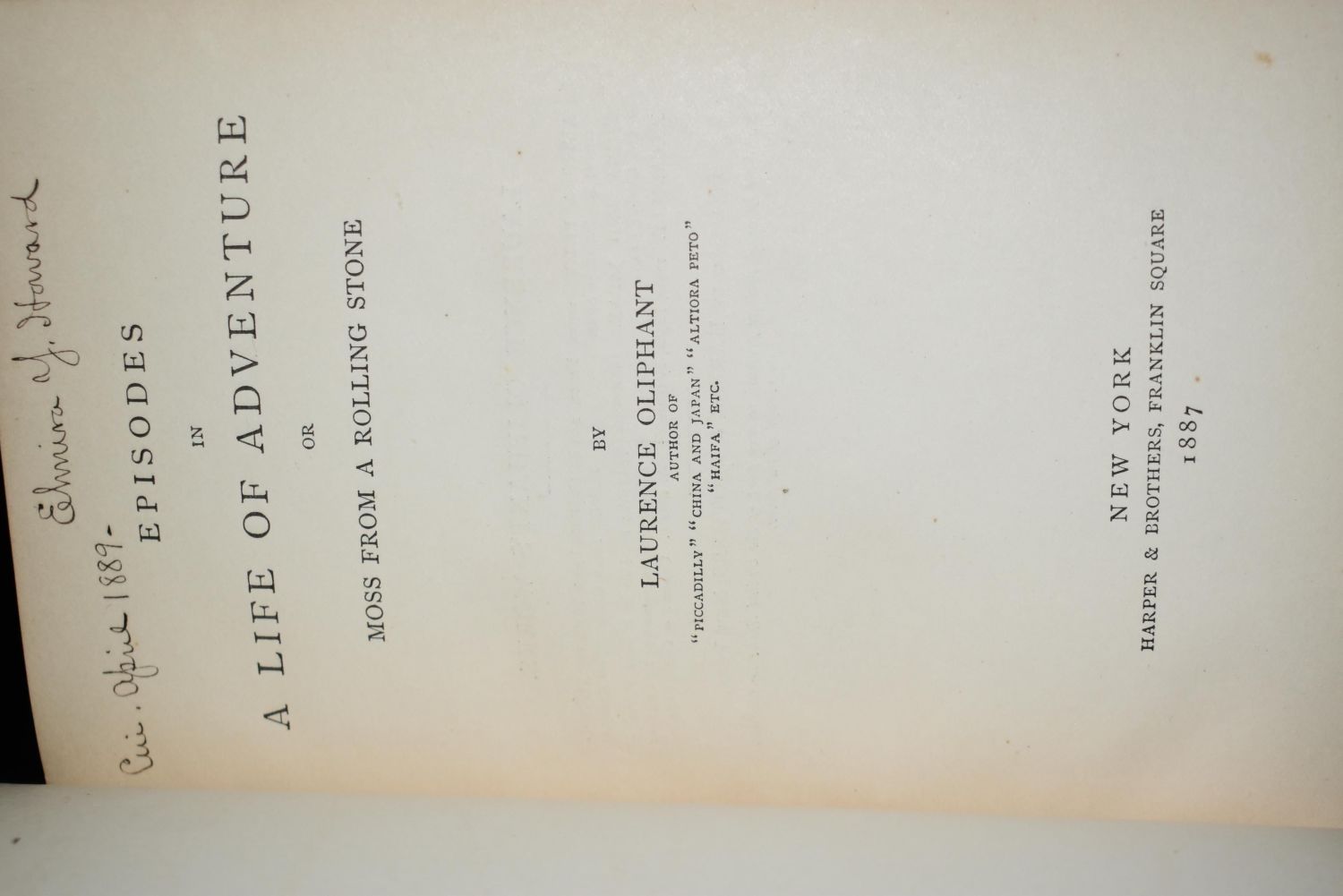 Episodes in a Life of Adventure or Moss from a Rolling Stone Laurence Oliphant. Published by Harper & Brothers, New York (1887). 1st Edition. Publishers original brown cloth hardback with gold gilt to spine. Excellent condition. 343 pgs. 7 1/2" by 5 1/4"