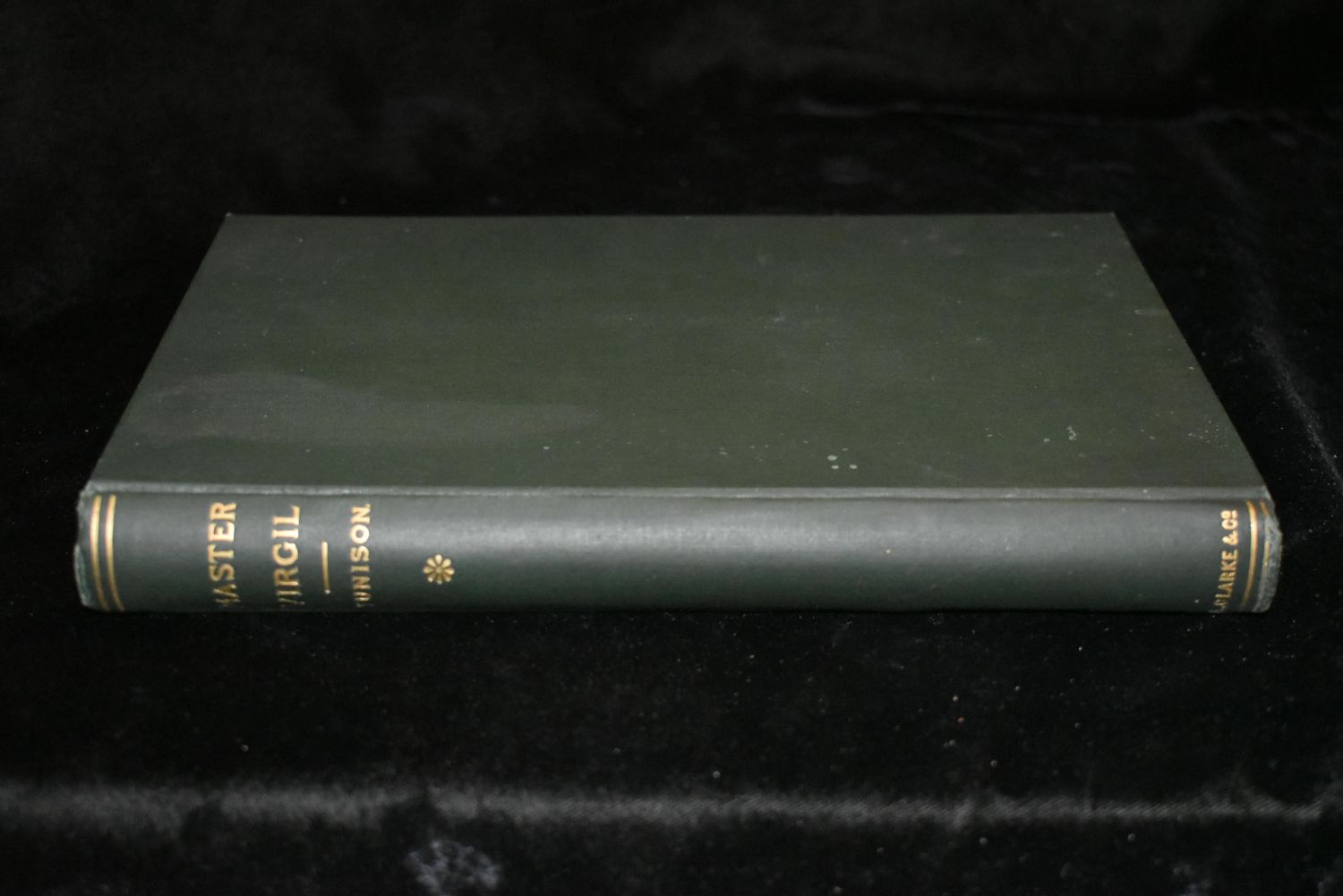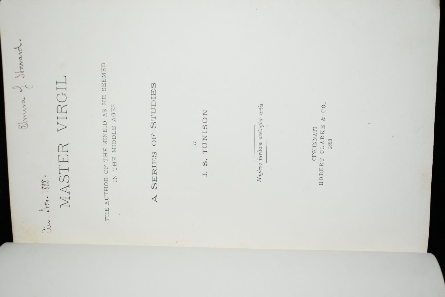 Master Virgil: The Author of the Aeneid as He Seemed in the Middle Ages. A Series of Studies by Joseph Salathiel Tunison. Published by Clarke & Co, Cincinnati 1888. 1st Edition. Very good ++ condition. Publishers green cloth hardback with gold gilt. Gold gilt to top of page edges. 230 pgs 9 5/6" by 6 1/2"