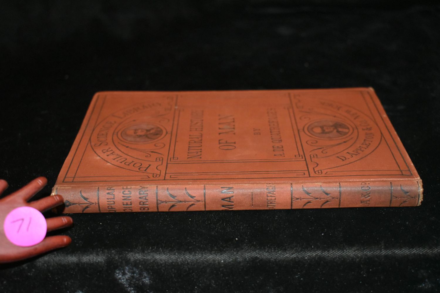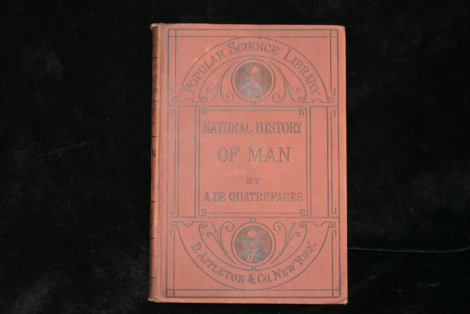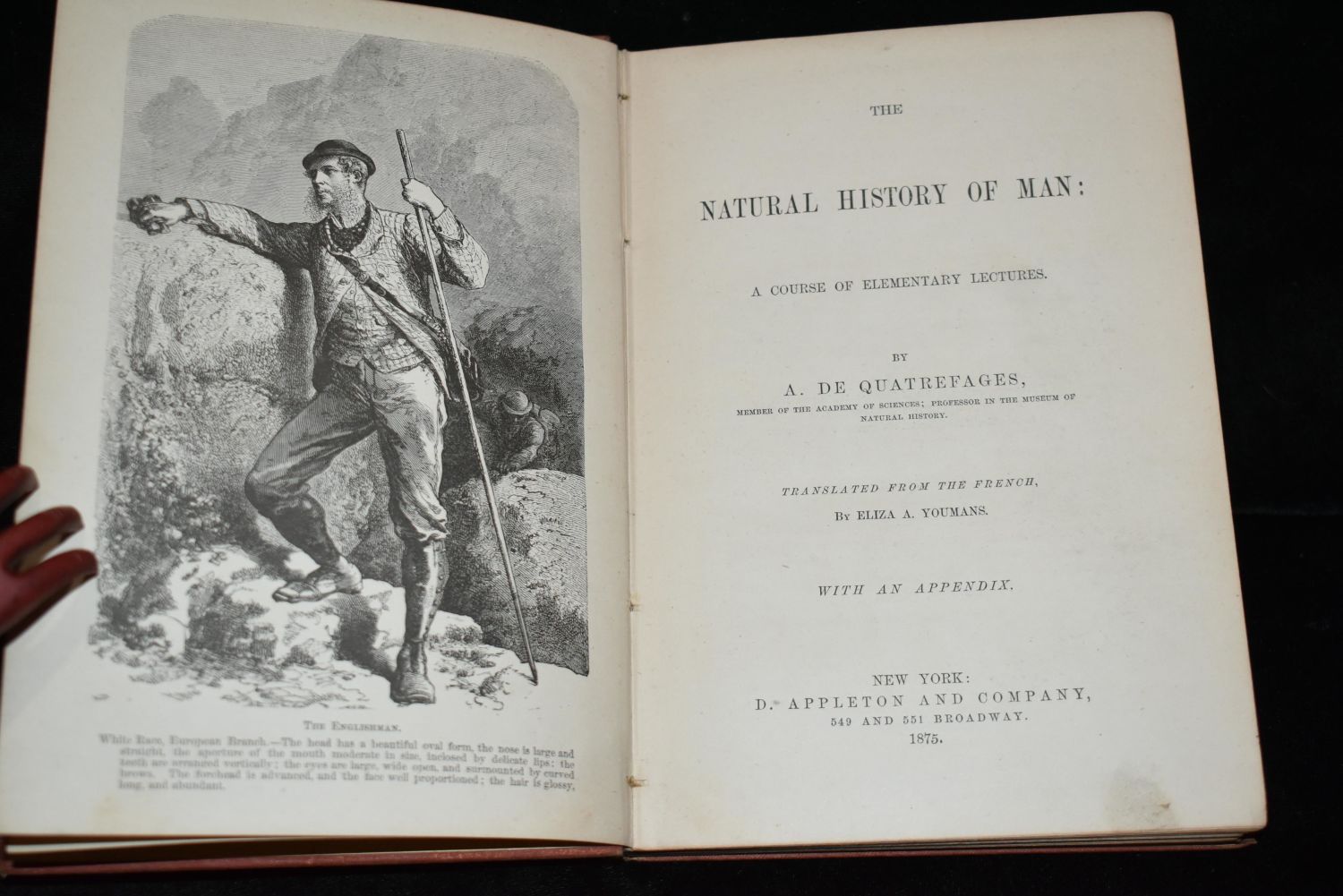 The Natural History of Man: A Course of Elementary Lectures by A. De Quatrefages [translated from the French By Eliza (Elizabeth) A. Youmans]. Published by D. Appleton and Company / Popular Science Library, New York (1875). 1st Edition. Publishers original embossed brown cloth hardback with black print. Shelf wear to corners otherwise very good condition. 152 pgs plus ads. 7 2/8" by 5 1/4"