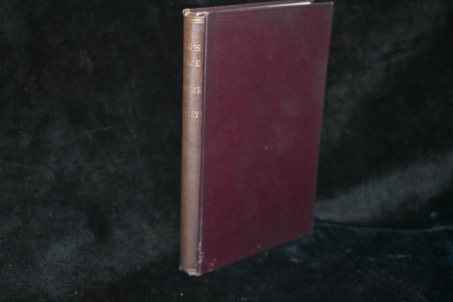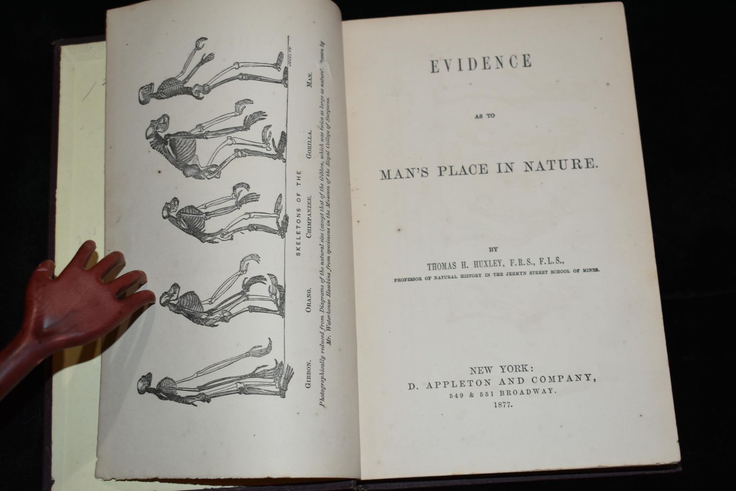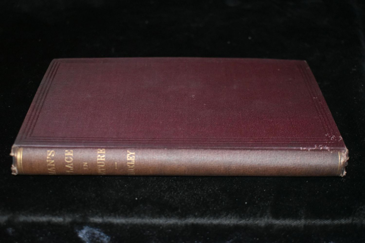 Evidence as to Man’s Place in Nature by Thomas H. Huxley. Published by D. Appleton & Co., New York 1877. Publishers original embossed brown cloth hardback with gold gilt to spine. Very Good + Condition. Minor shelf wear to corners. 8" by 5 1/4"