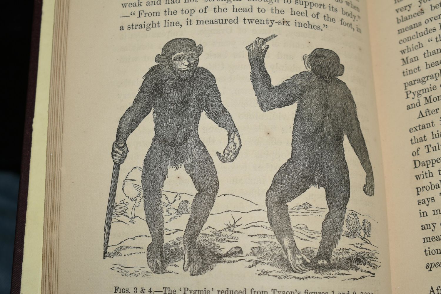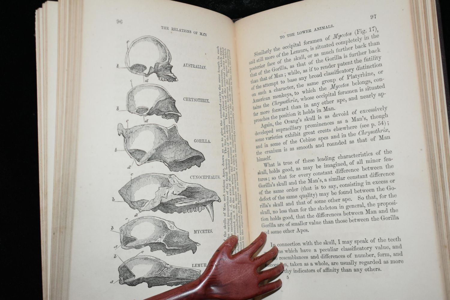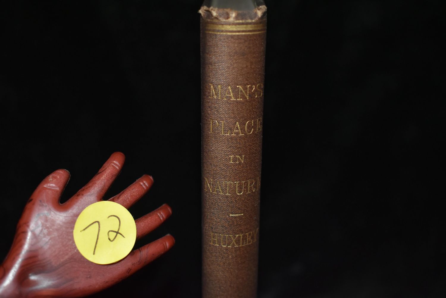 Evidence as to Man’s Place in Nature by Thomas H. Huxley. Published by D. Appleton & Co., New York 1877. Publishers original embossed brown cloth hardback with gold gilt to spine. Very Good + Condition. Minor shelf wear to corners. 8" by 5 1/4"