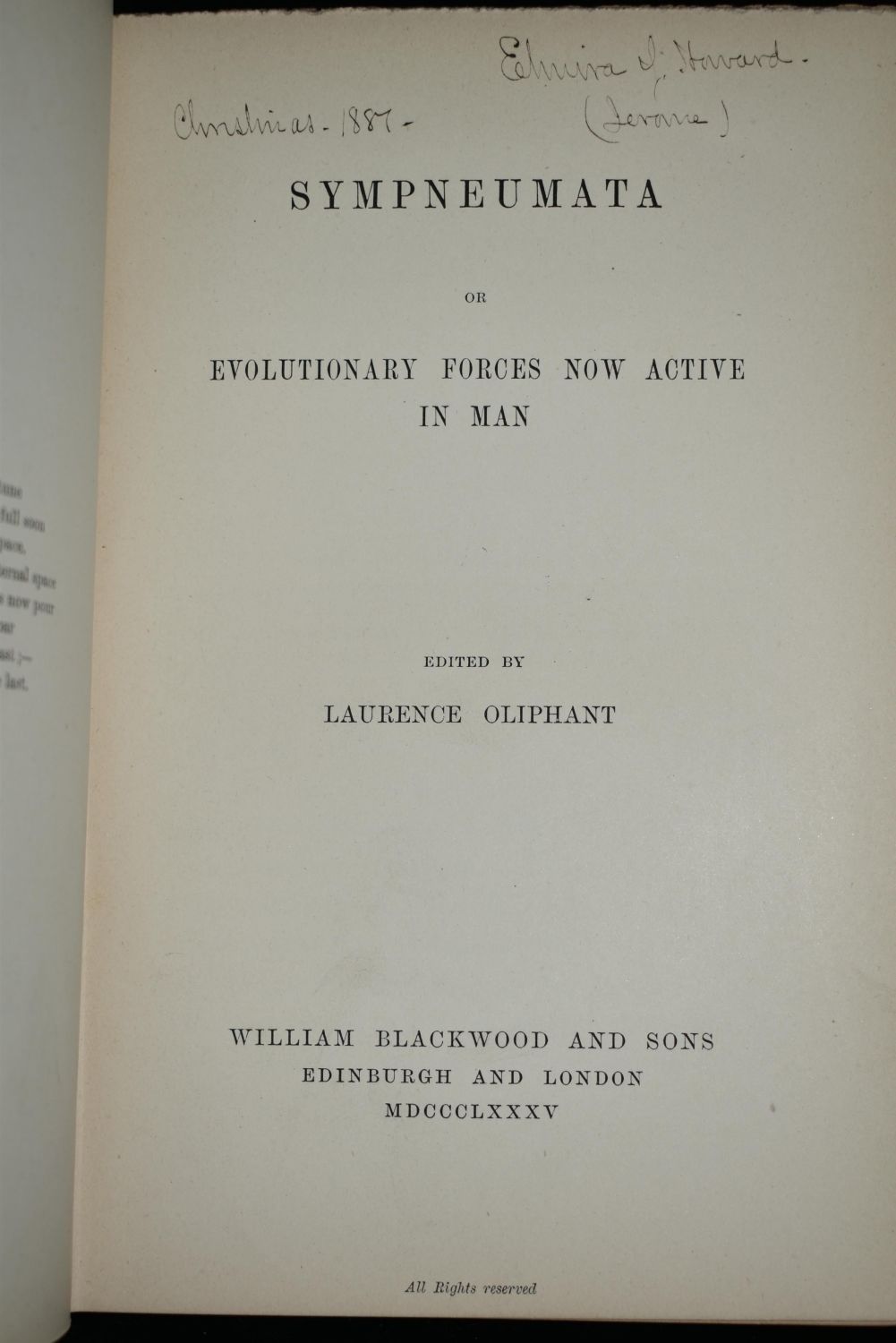 Sympneumata or Evolutionary Forces Now Active in Man by Laurence Oliphant. Published by William Blackwood and Sons, Edinburgh (1885). 1st Edition. Publishers original grey cloth hardback with black and gold gilt. Some shelf wear to cover but still very good condition. 288 pgs plus ads. 7 7/8" by 5 1/2"