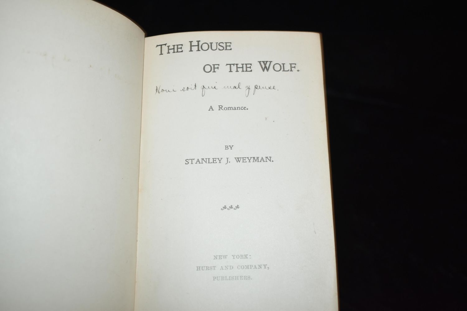 The House of the Wolf; A Romance by Stanley John Weyman. Publishers original decorative cloth hardback with gold gilt title on spine. Very Good condition. Stain on back cover. 194 pgs 6" by 4 3/8"