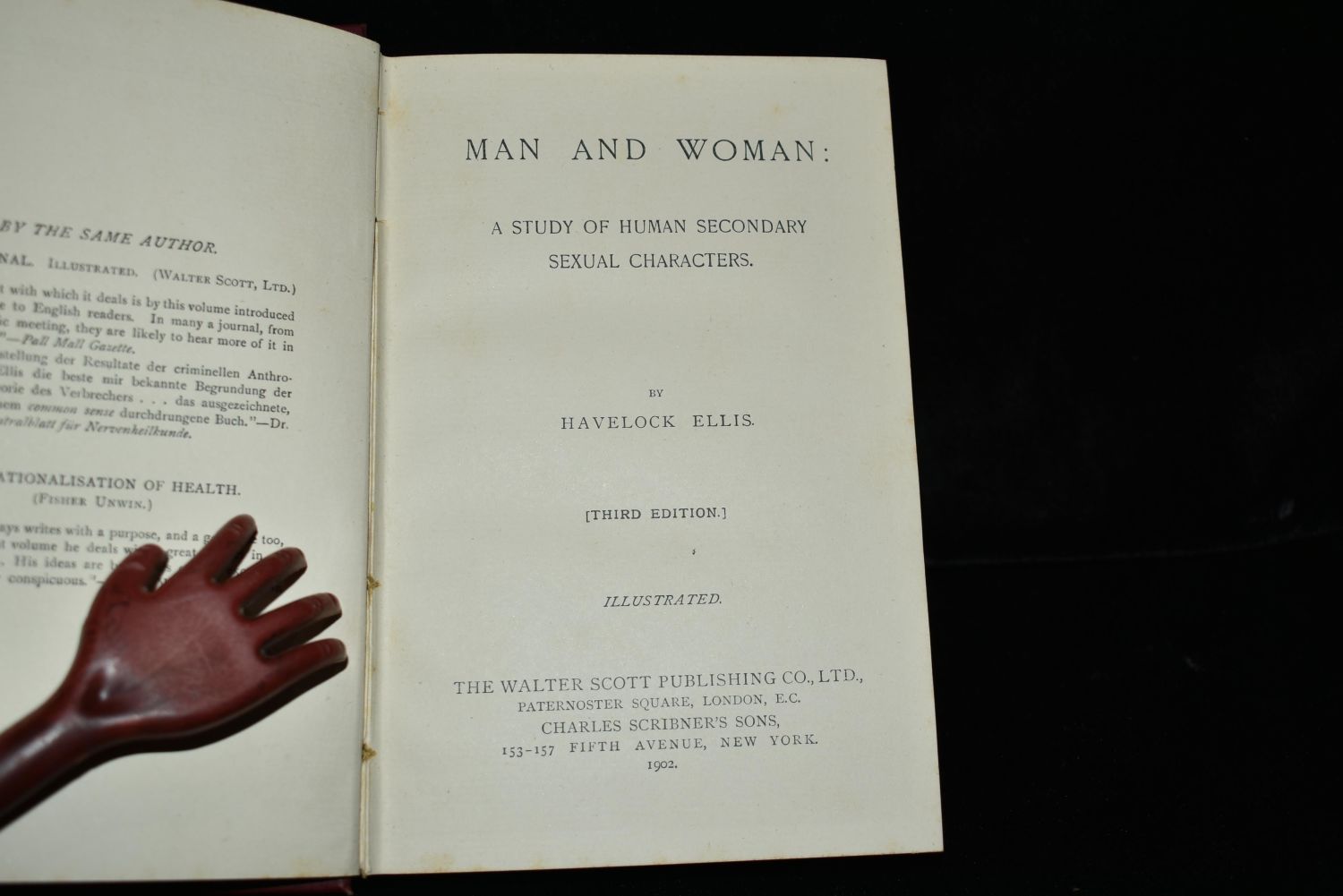 Man and Woman. A Study of Human Secondary Sexual Characteristics by Havelock Ellis. Published by London: Walter Scott 1902. Excellent condition. Publishers original red cloth hardback with gold gilt to front cover and spine. 409 pgs plus ads.