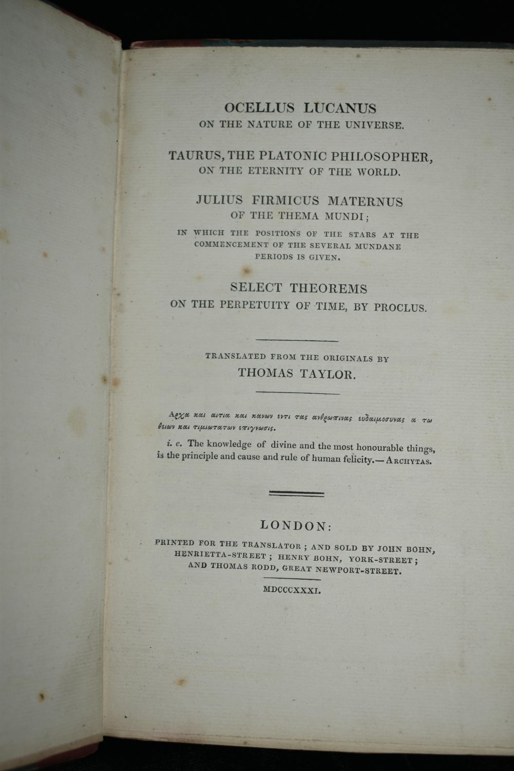 Ocellus Lucanus on the Nature of the Universe. Taurus, the Platonic philosopher, on the eternity of the world. Julius Firmicus Maternus of the Thema mundi: in which the positions of the stars at the commencement of the several mundane periods is given. Select theorems on the perpetuity of time, by Proclus by Thomas Taylor (translated). Published by London: Printed for the translator, and sold by John Bohn, Henry Bohn and Thomas Rodd, 1831. 1st English edition. Publishers original leather spine with blue boards. Back board is separated and spine is very worn. Some page edge tattering and foxing/age spots to some pages. Internally good. 96 pgs 8" by 5"