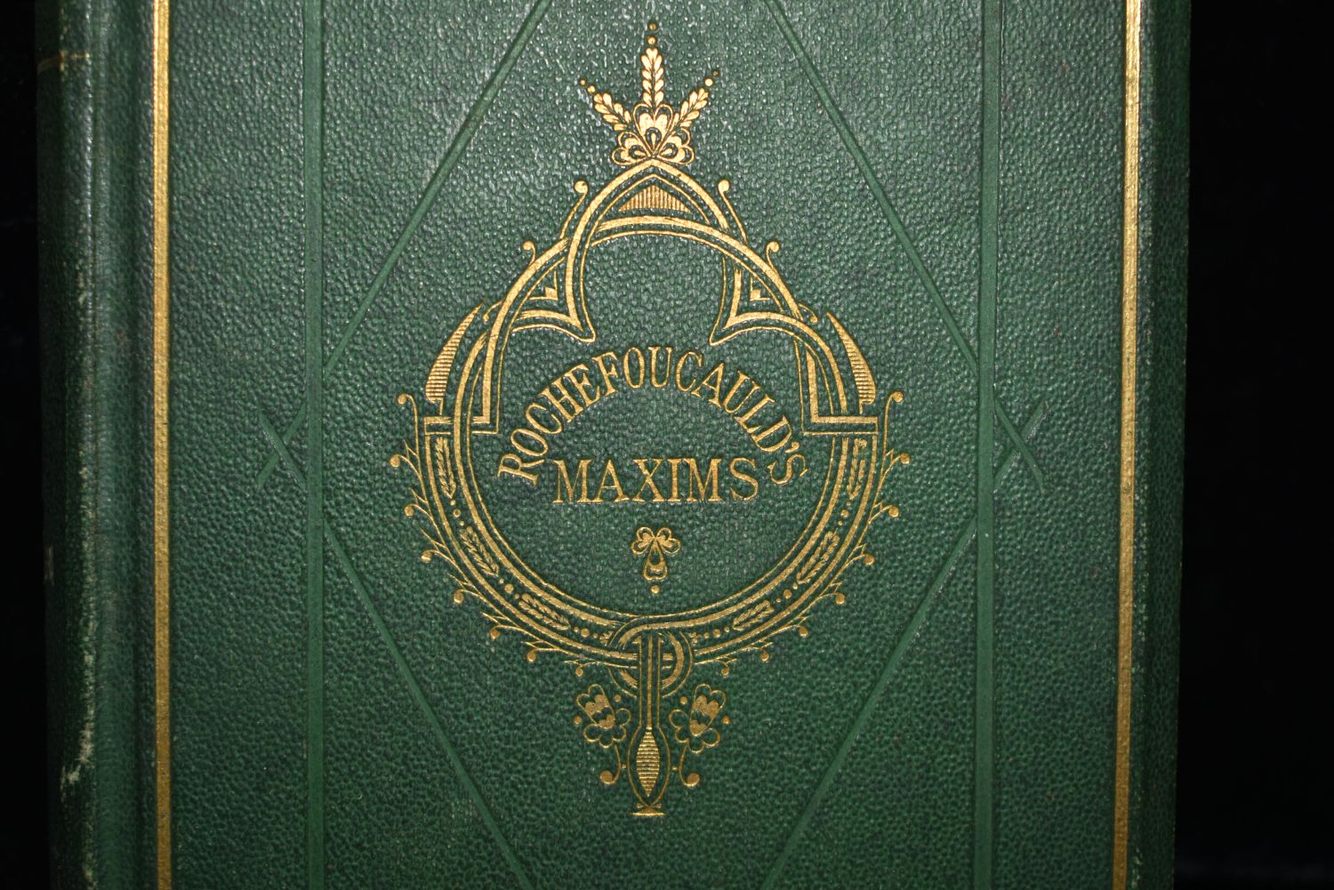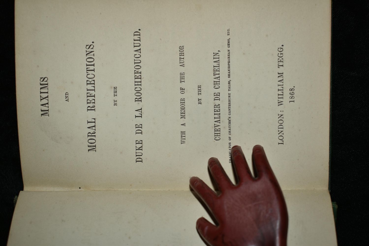 Maxims and Moral Reflections. By the Duke De La Rochefoucauld. Memoir By The Chevalier De Chatelain. Published by William Tegg, London (1868). Publishers original embossed Green hardback with gold print. Red gilt around all page edges. Good Condition with some shelf wear to corners. 147 pgs with 36 pgs of adds. 5 3/4" by 4"