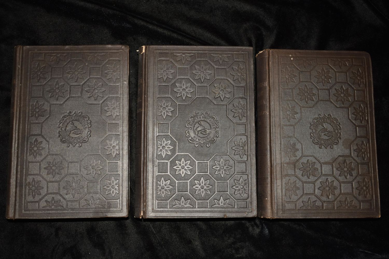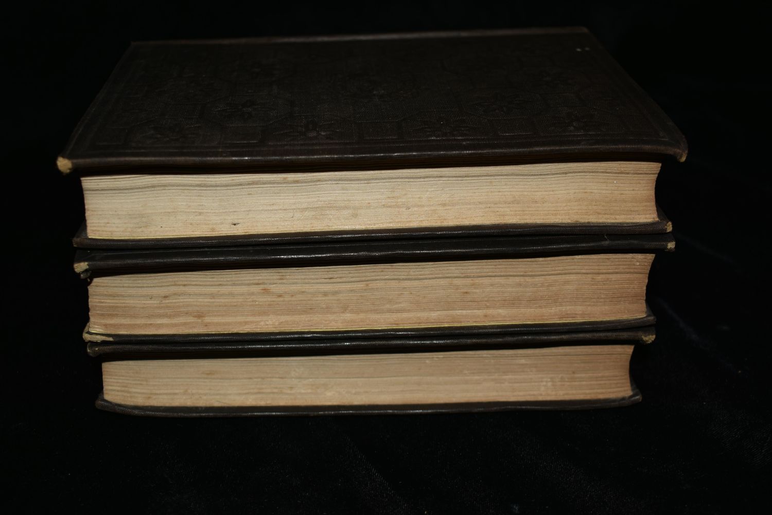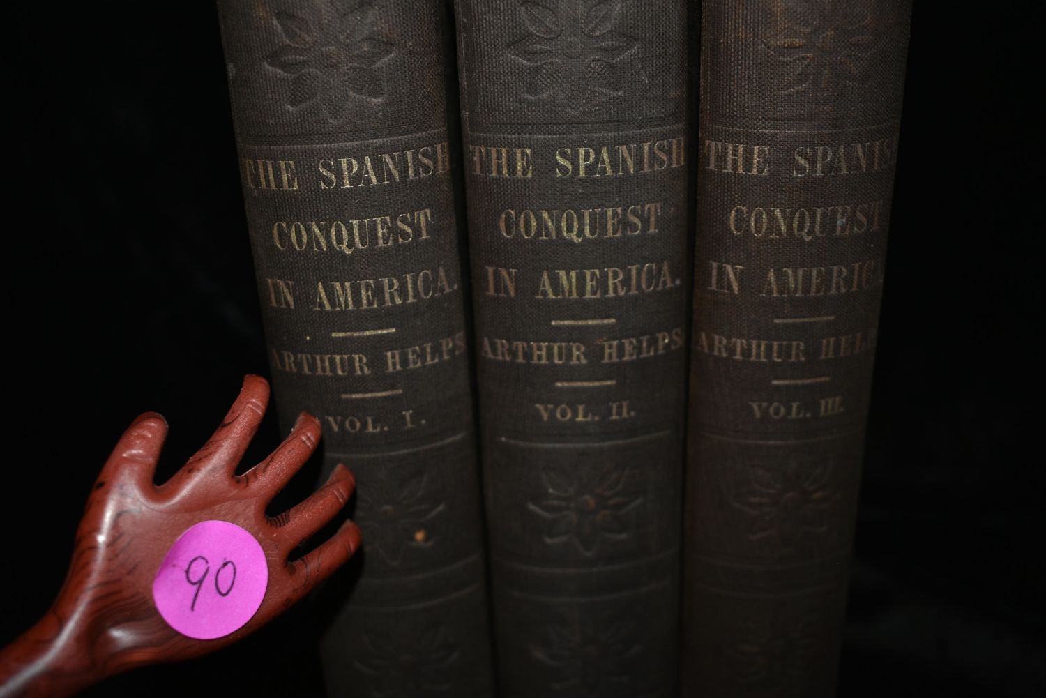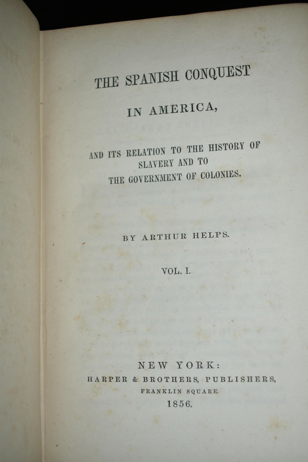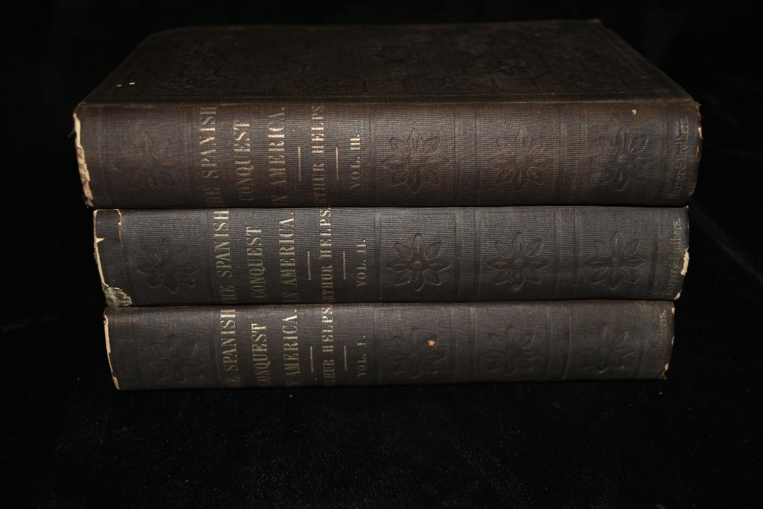 The Spanish Conquest in America, and its Relation to the History of Slavery and to the Government of Colonies by Arthur Helps. Published by Harper and Brothers, New York 1856. First U.S. Edition. Publishers original embossed black cloth hardbacks with gold gilt to spines. Overall Good condition. Some shelf wear to corners. A little wear to the tops or bottoms of the spines. A little foxing or thumbing to some pages. Newspaper clippings left in the book for 150 years stained the title page of volume 2. 490, 532, and 470 pgs plus a few ads. 7 7/8" by 5 1/4"