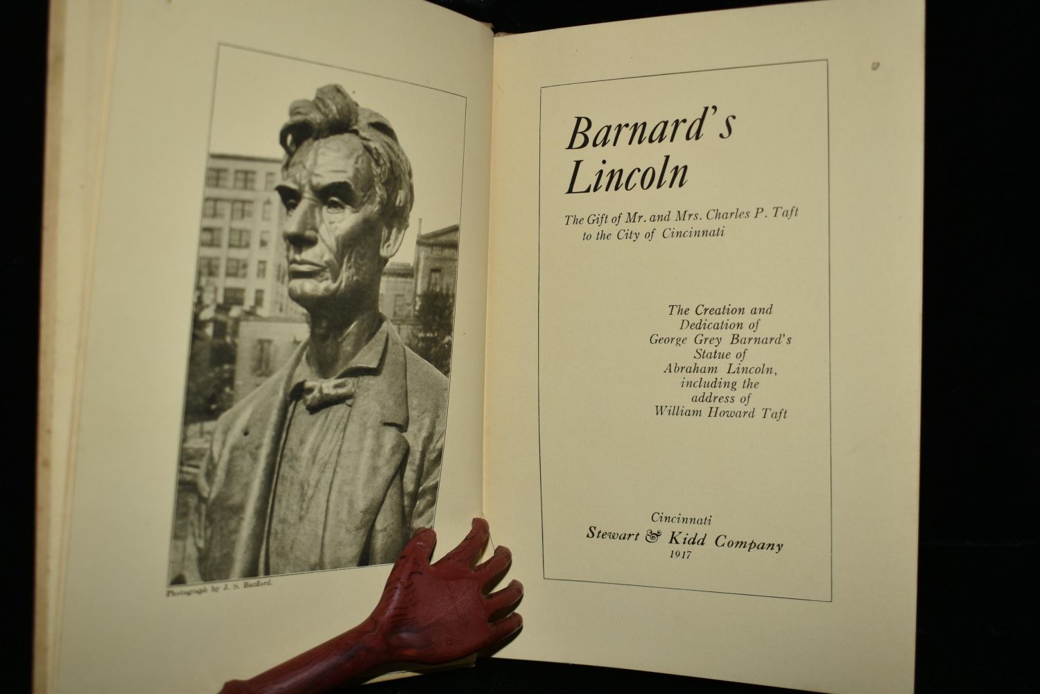 Barnard’s Lincoln: The Gift of Mr. and Mrs. Charles P. Taft to the City of Cincinnati by George Grey Barnard. Published by Stewart & Kidd Company, Cincinnati (1917). 1st Edition. Some kind of stain toward the bottom of the spine and a few other blemishes on the cover. Otherwise very good condition. Publishers original tan cloth hardback with gold gilt and glued on picture of Abraham Lincoln’s statue. 66 pgs 7 7/8" by 5 3/8"
